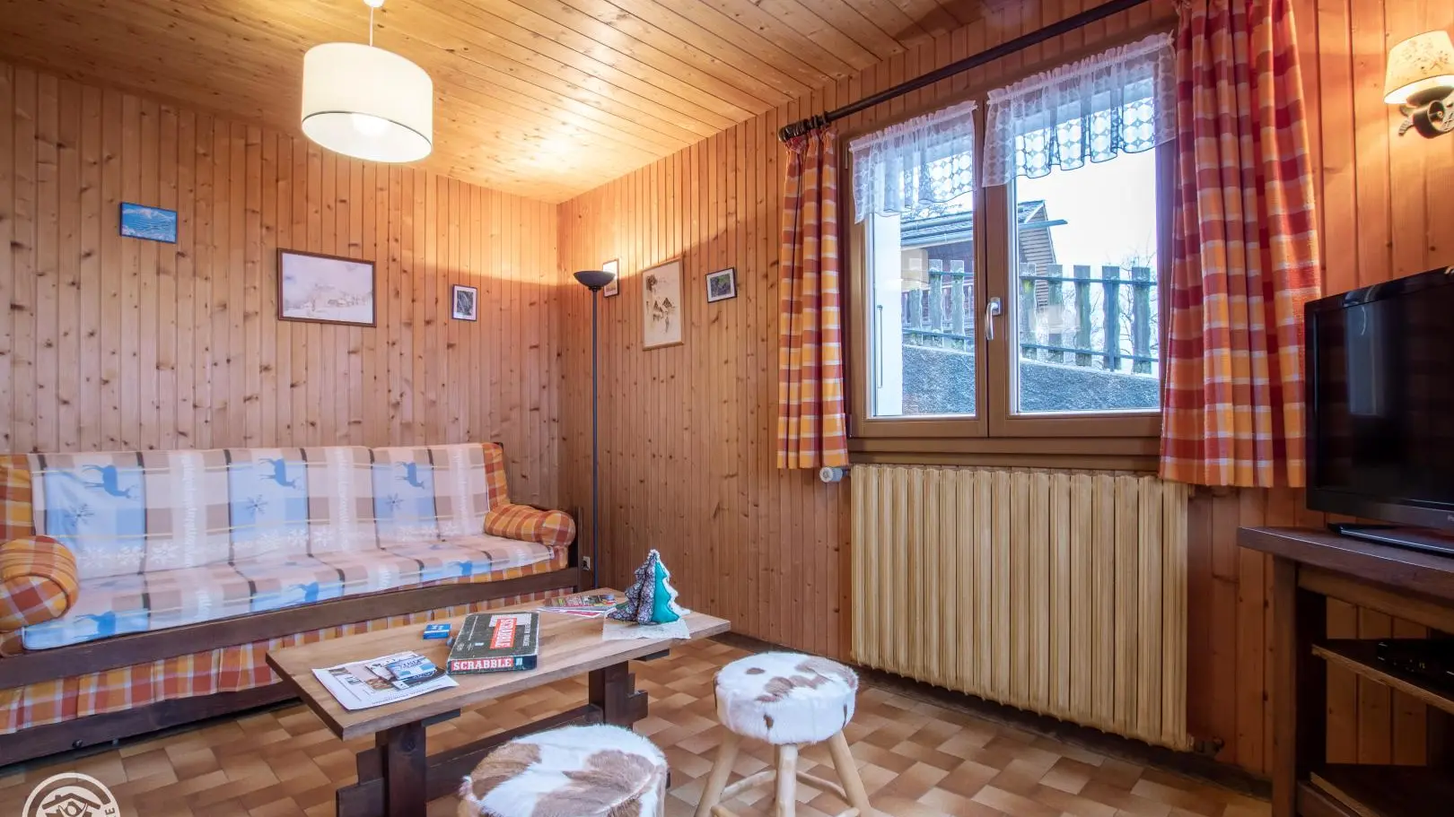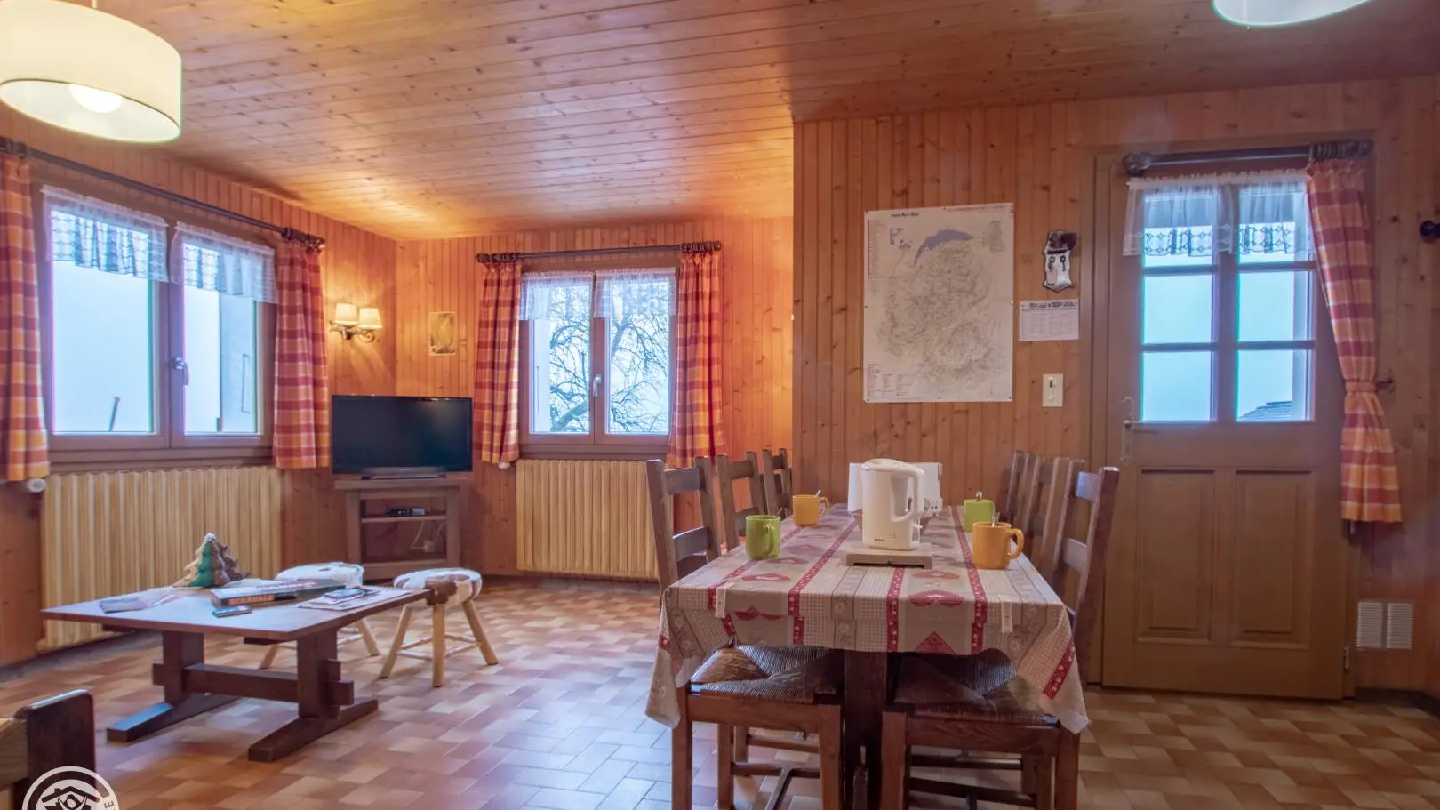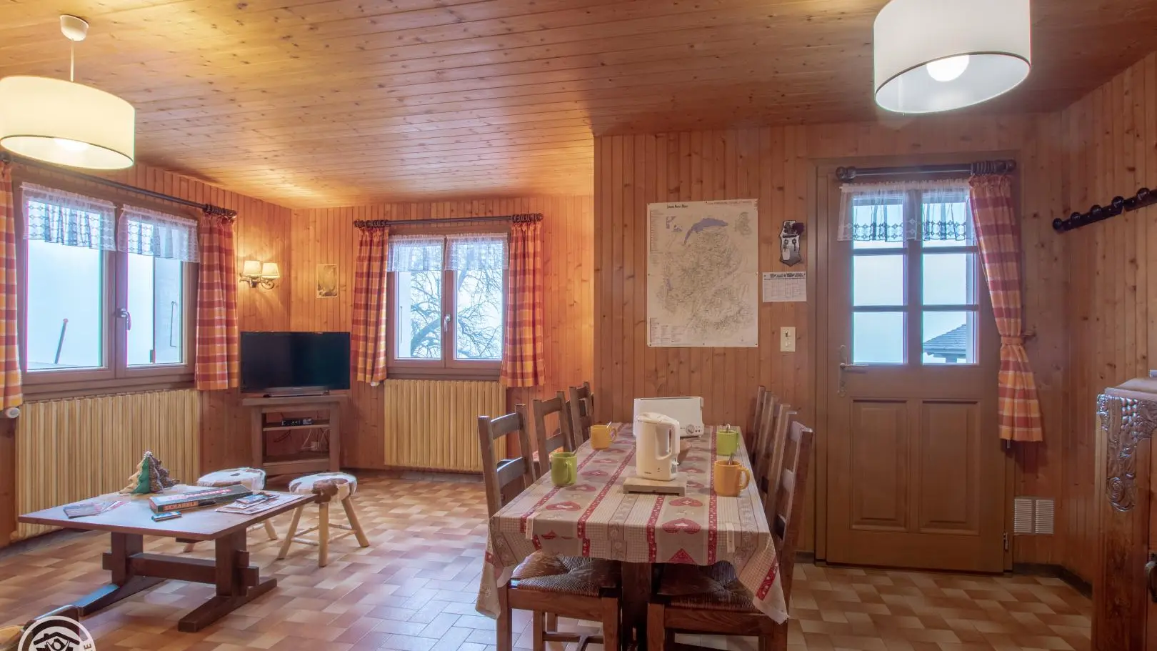 With superb panoramic view from Le Charvin to La Tournette (mountains), single gîte (59 sq. m.) in owner's house. Ground floor: fitted kitchen opening onto dining room/living room (single divan + truckle bed) 2 bedrooms (double bed) (2 single beds), folding cot, shower room, separate WC. Central heating (gîte uses renewable energy - wood-fired boiler). Satellite TV, private courtyard, garden, garden furniture, BBQ, garage. La Croix-Fry Merdassier ski resort 3km (downhill et cross-country skiing) linked to La Clusaz. Snow-shoeing trails, day nursery, shuttles.