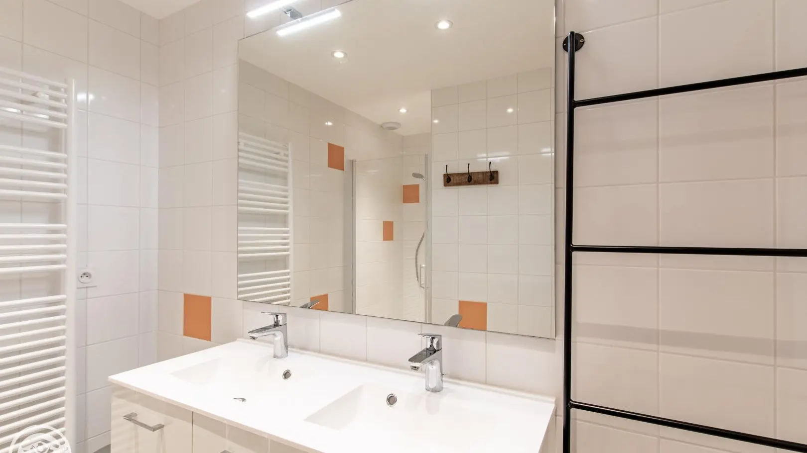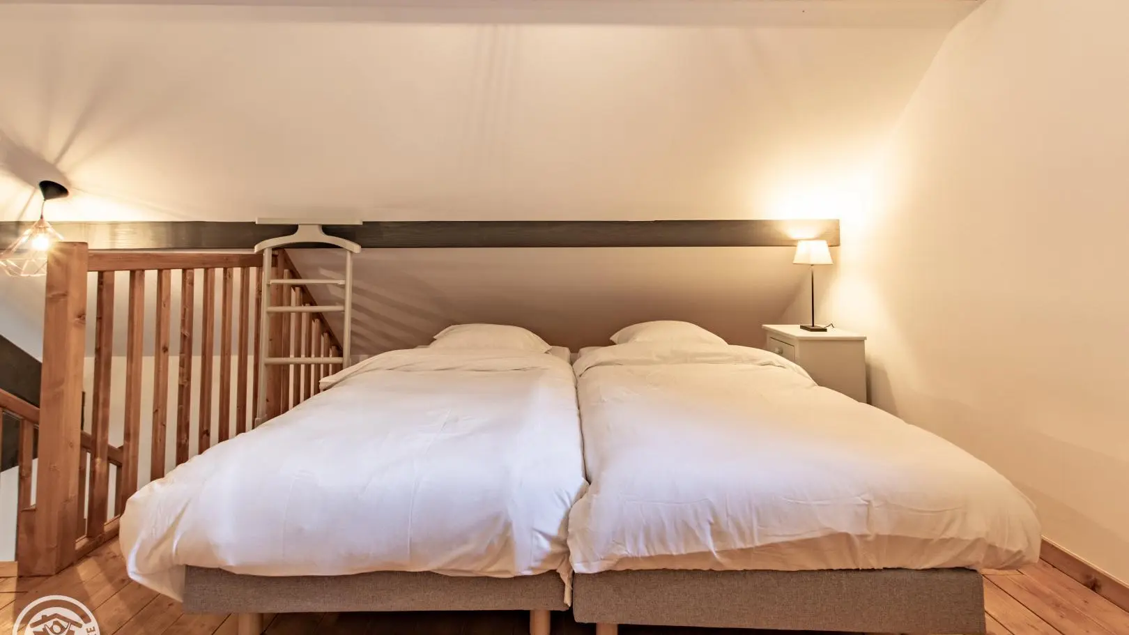 Upstairs (attic mezzanine), sleeping area with two beds (90x200 cm which can be twinned) and two benches (90x200 cm).