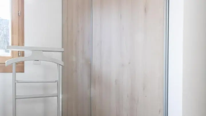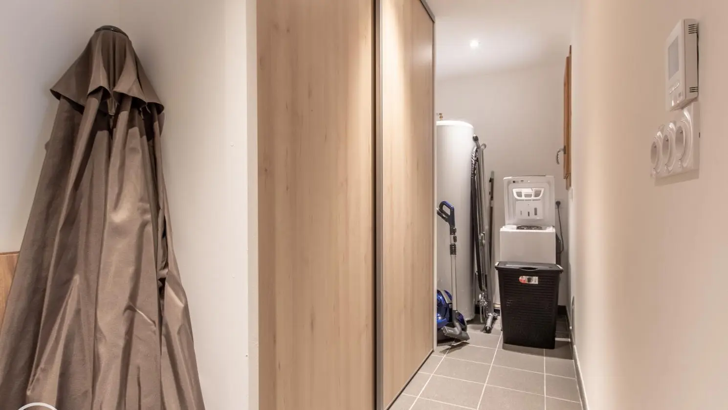 On the ground floor: kitchen open to living room with dining area and TV area with sofa. Two bedrooms each with a double bed (140x190 cm), bathroom, separate WC. Laundry room with washing machine and storage.