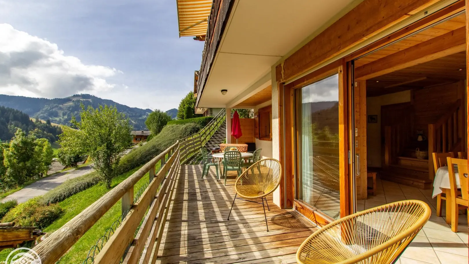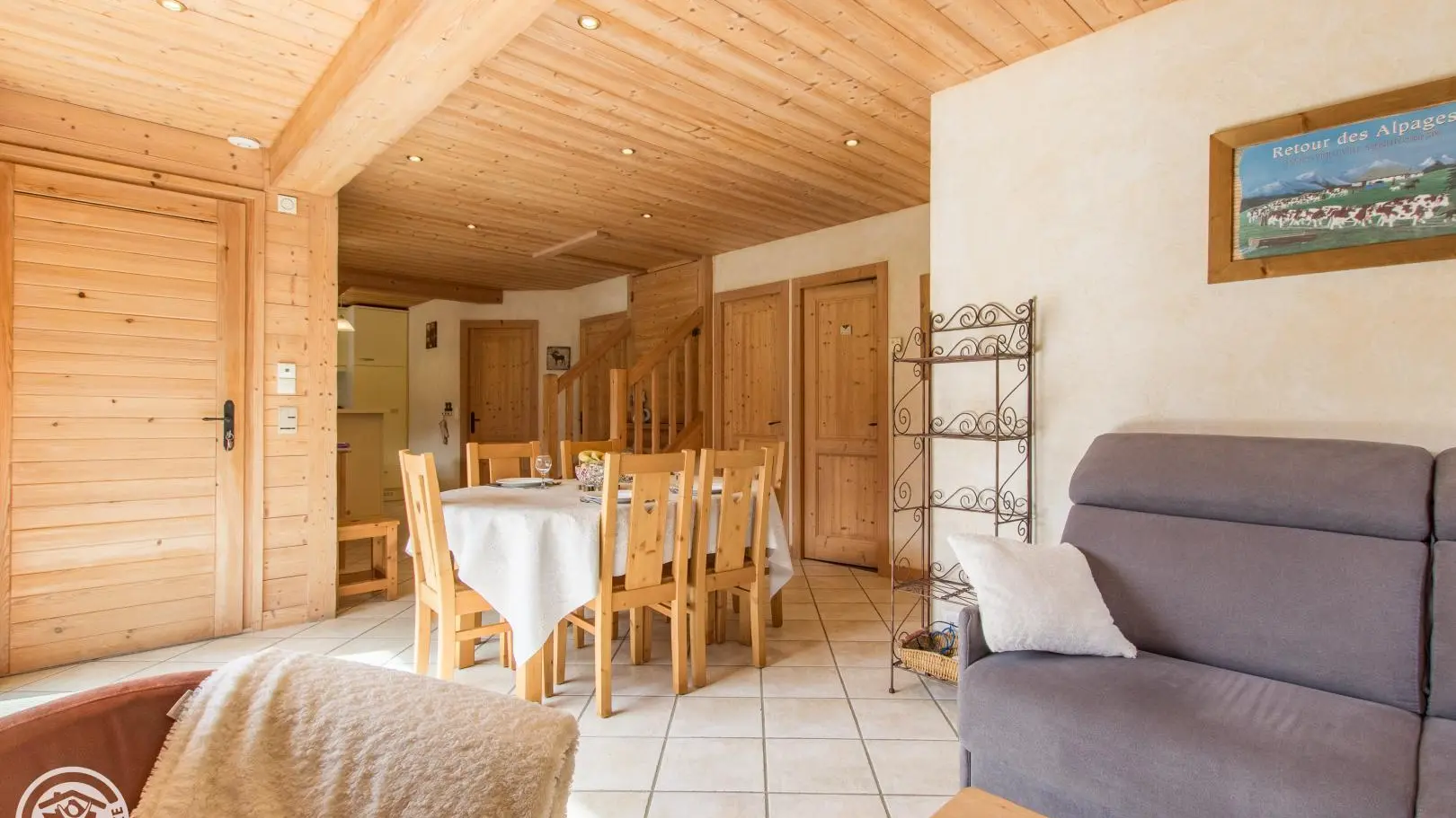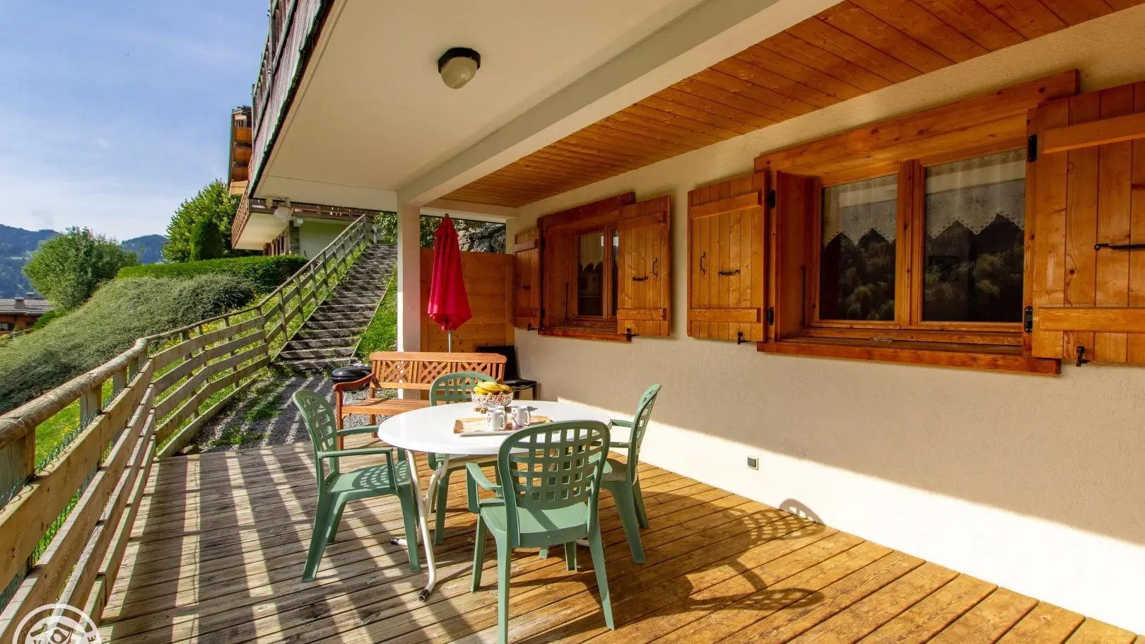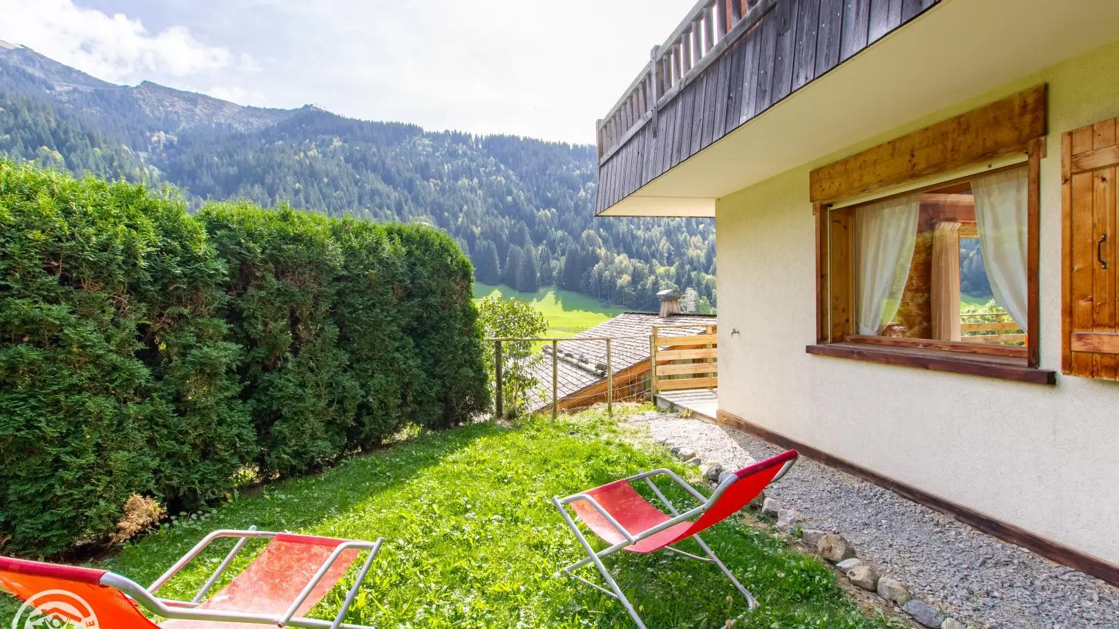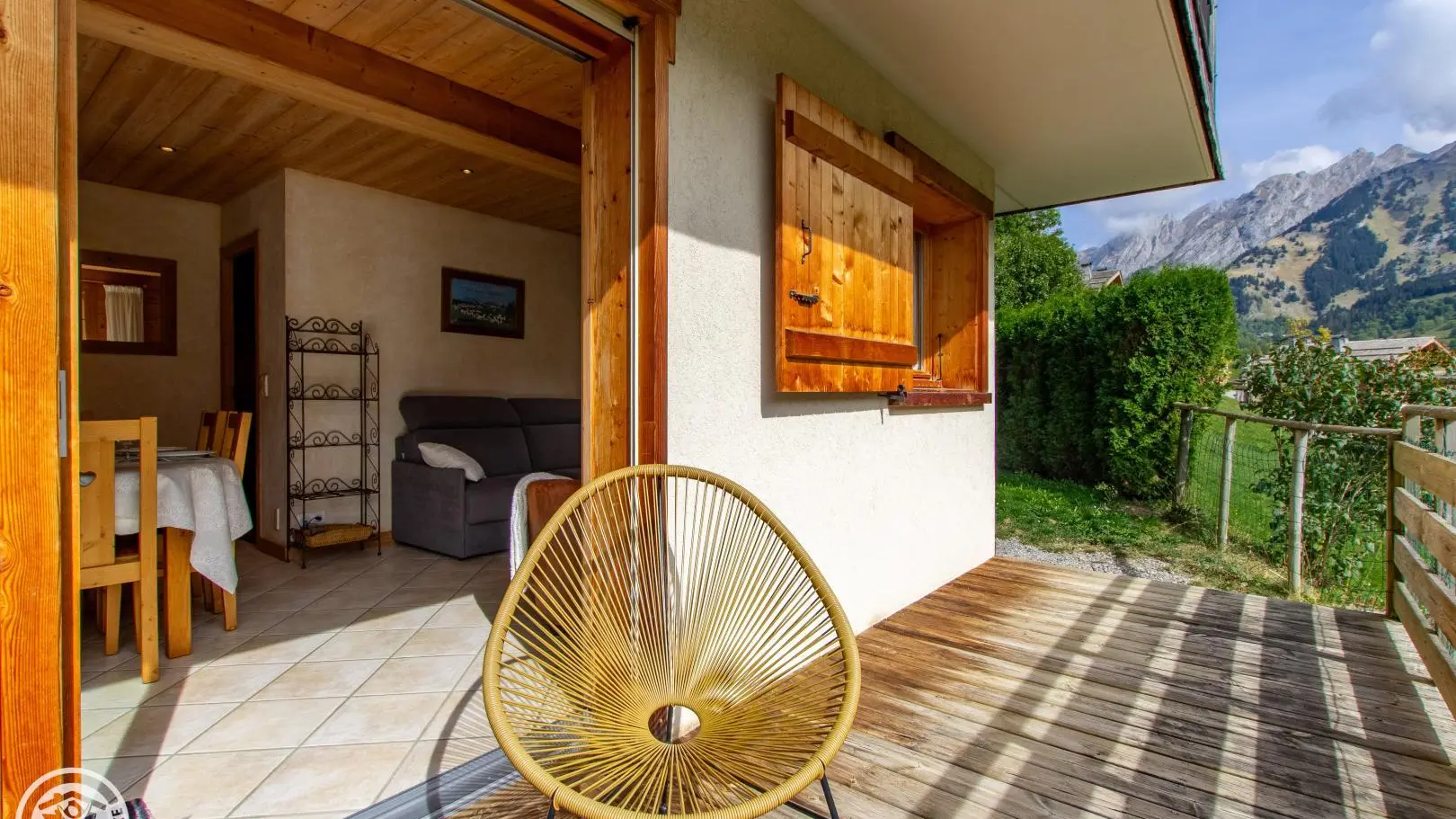 On the heights of the resort, gîte (55m²) facing south facing the Aravis range and fitted out on the garden level of the owners' chalet.