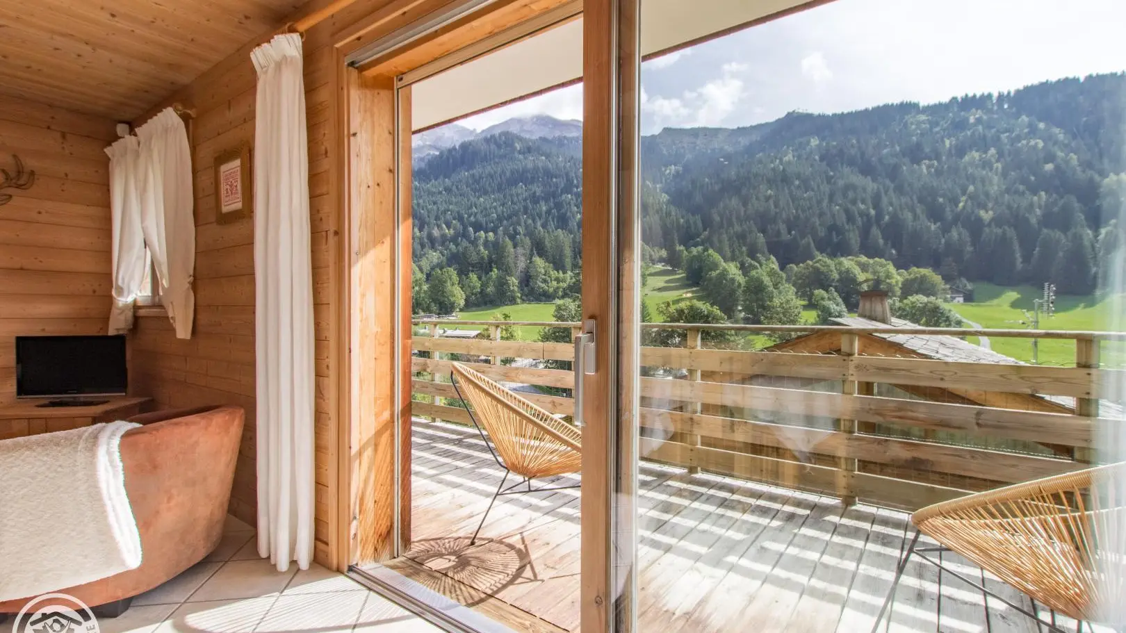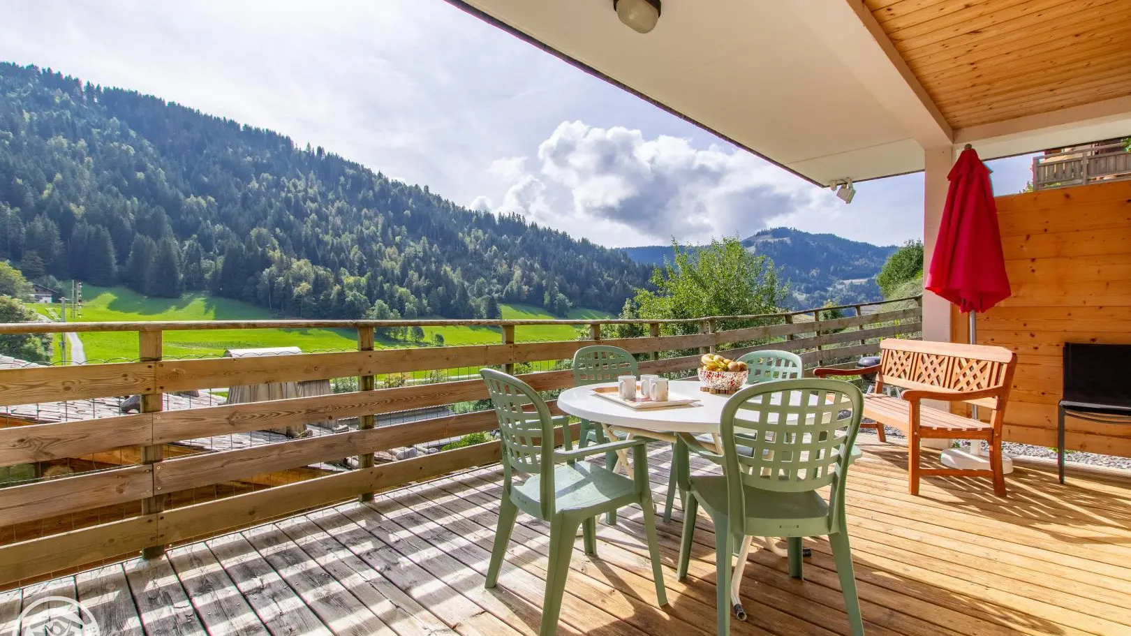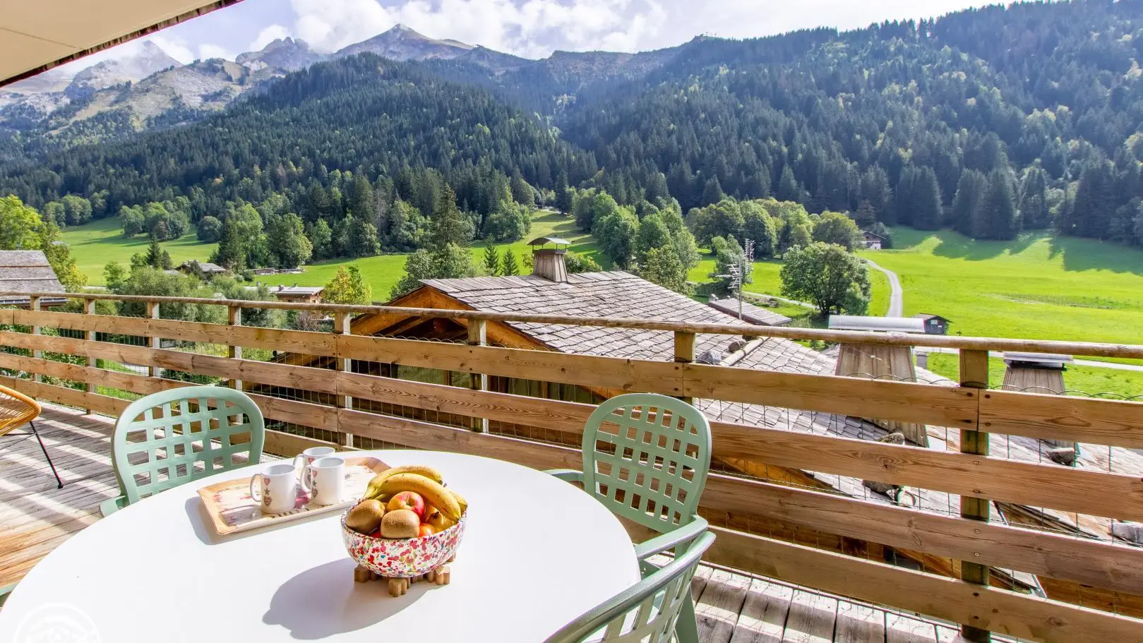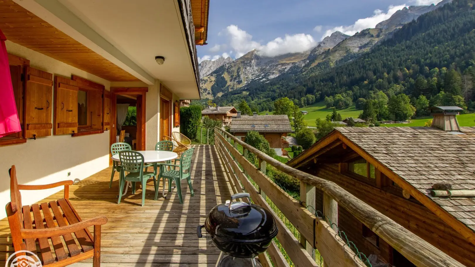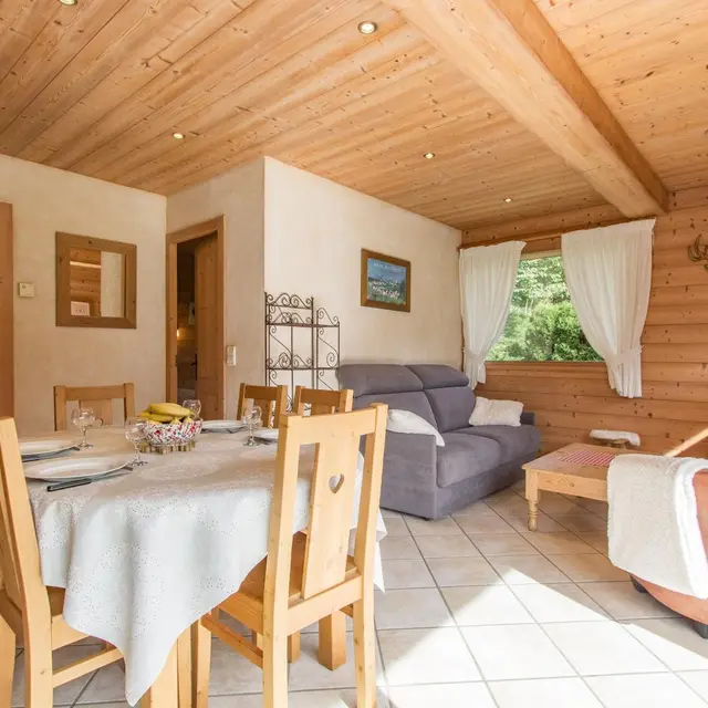 On the heights of the resort, gîte (55m²) facing south facing the Aravis range and fitted out on the garden level of the owners' chalet.
