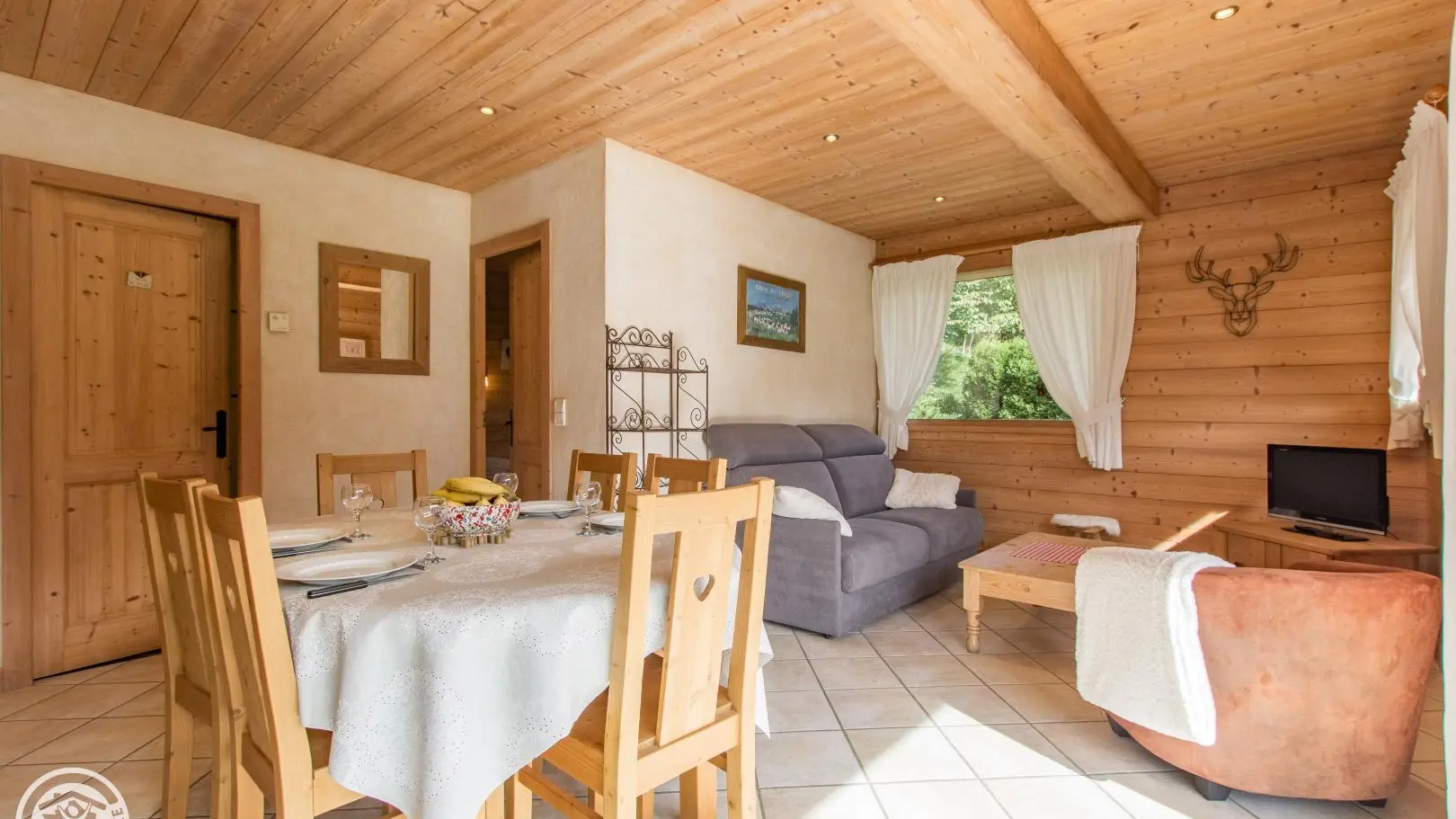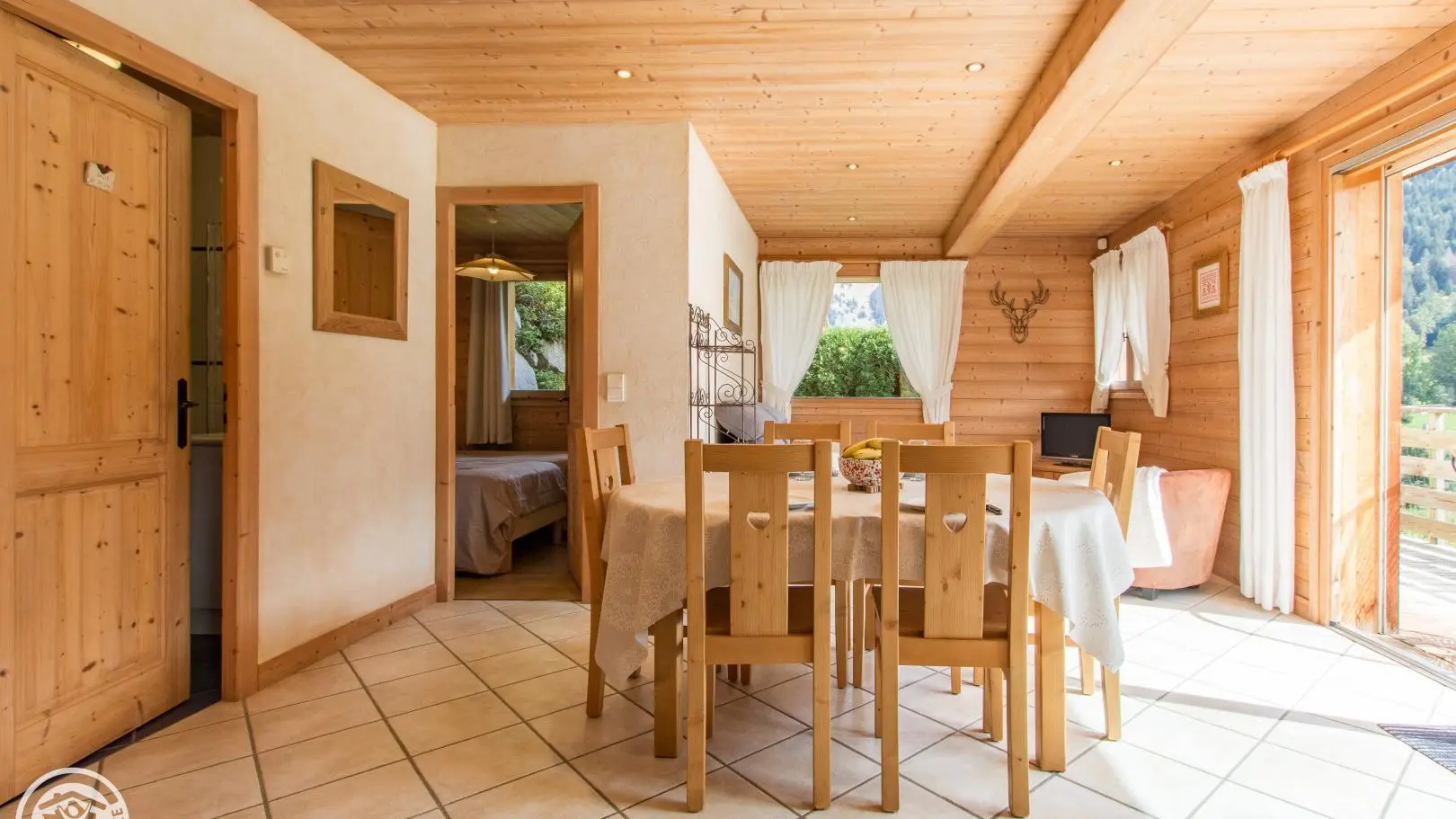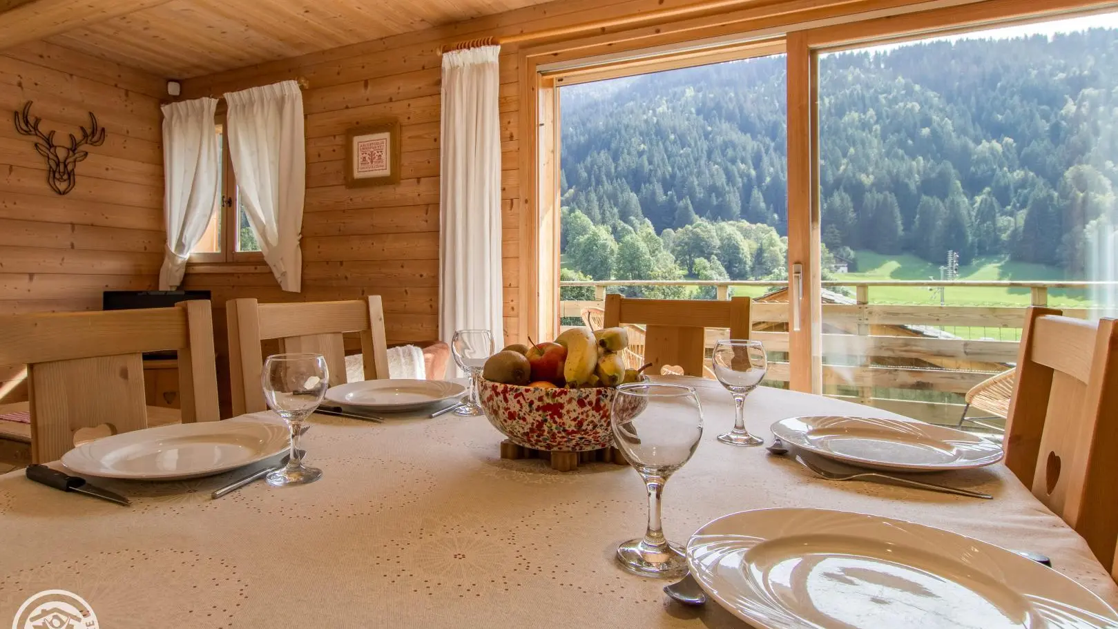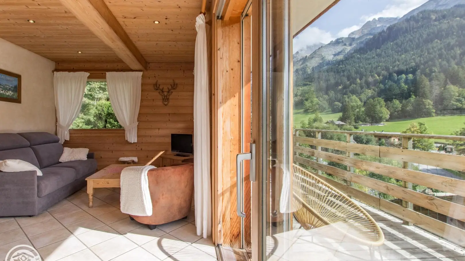 On the heights of the resort, gîte (55m²) facing south facing the Aravis range and fitted out on the garden level of the owners' chalet.