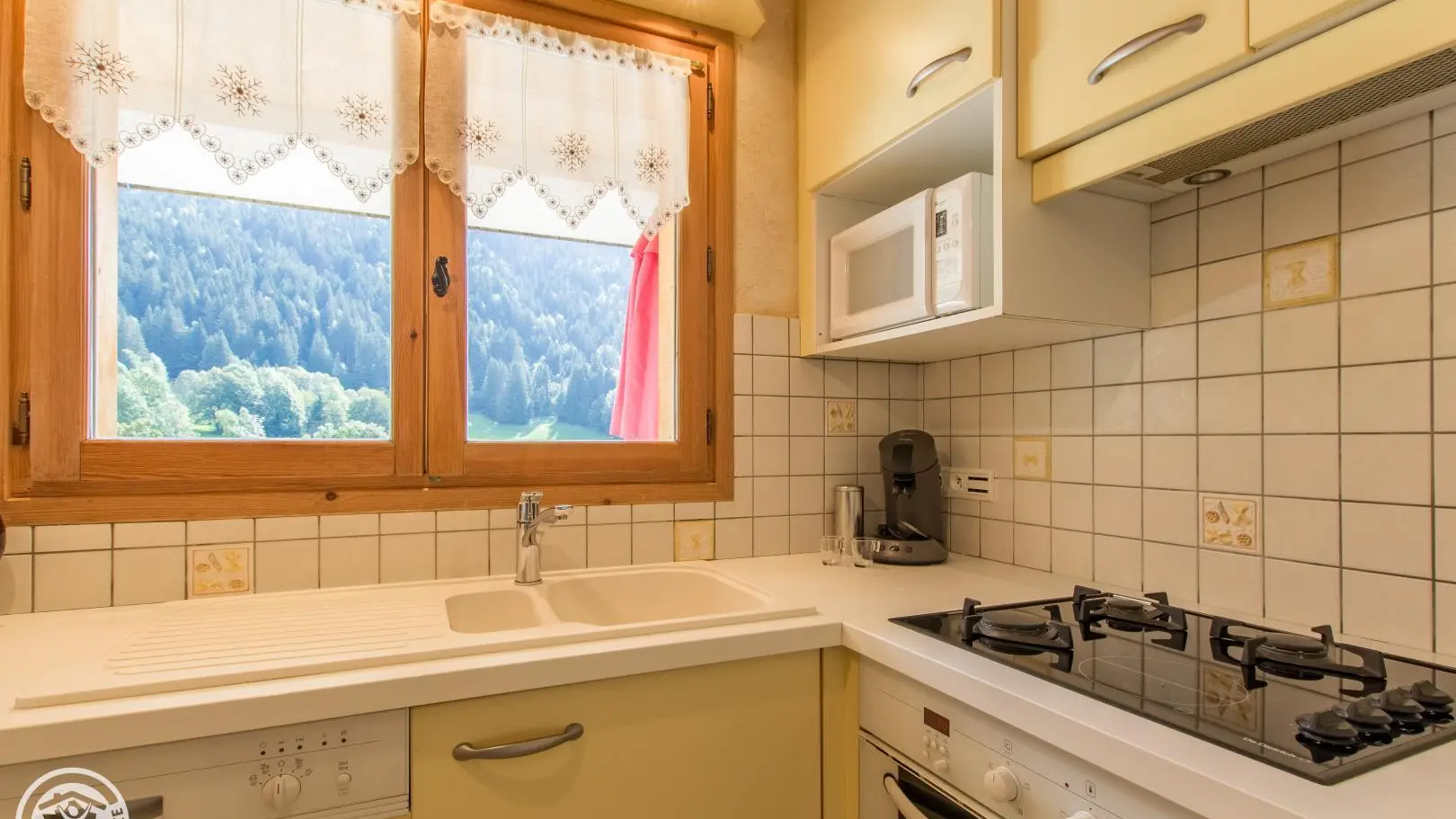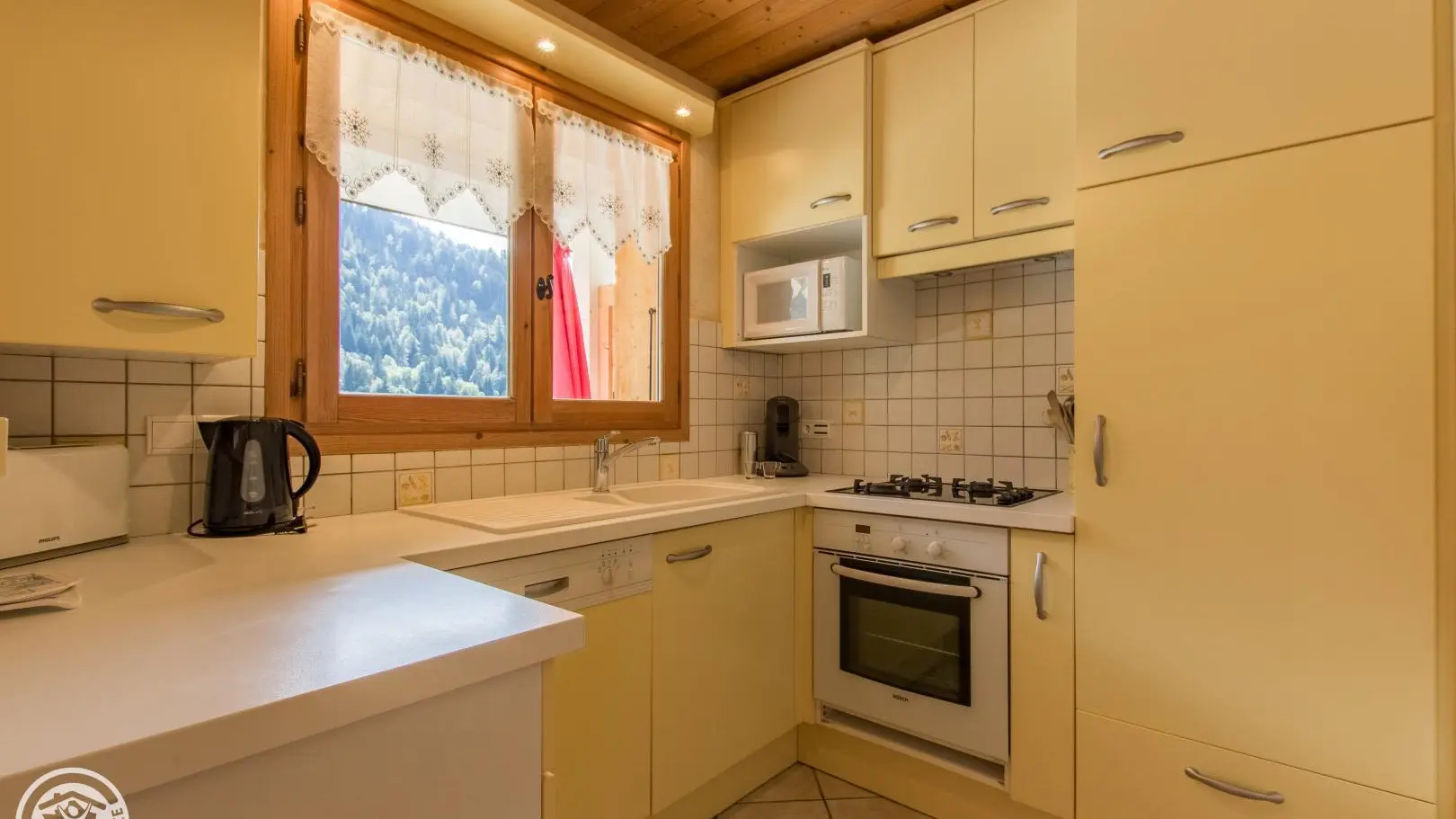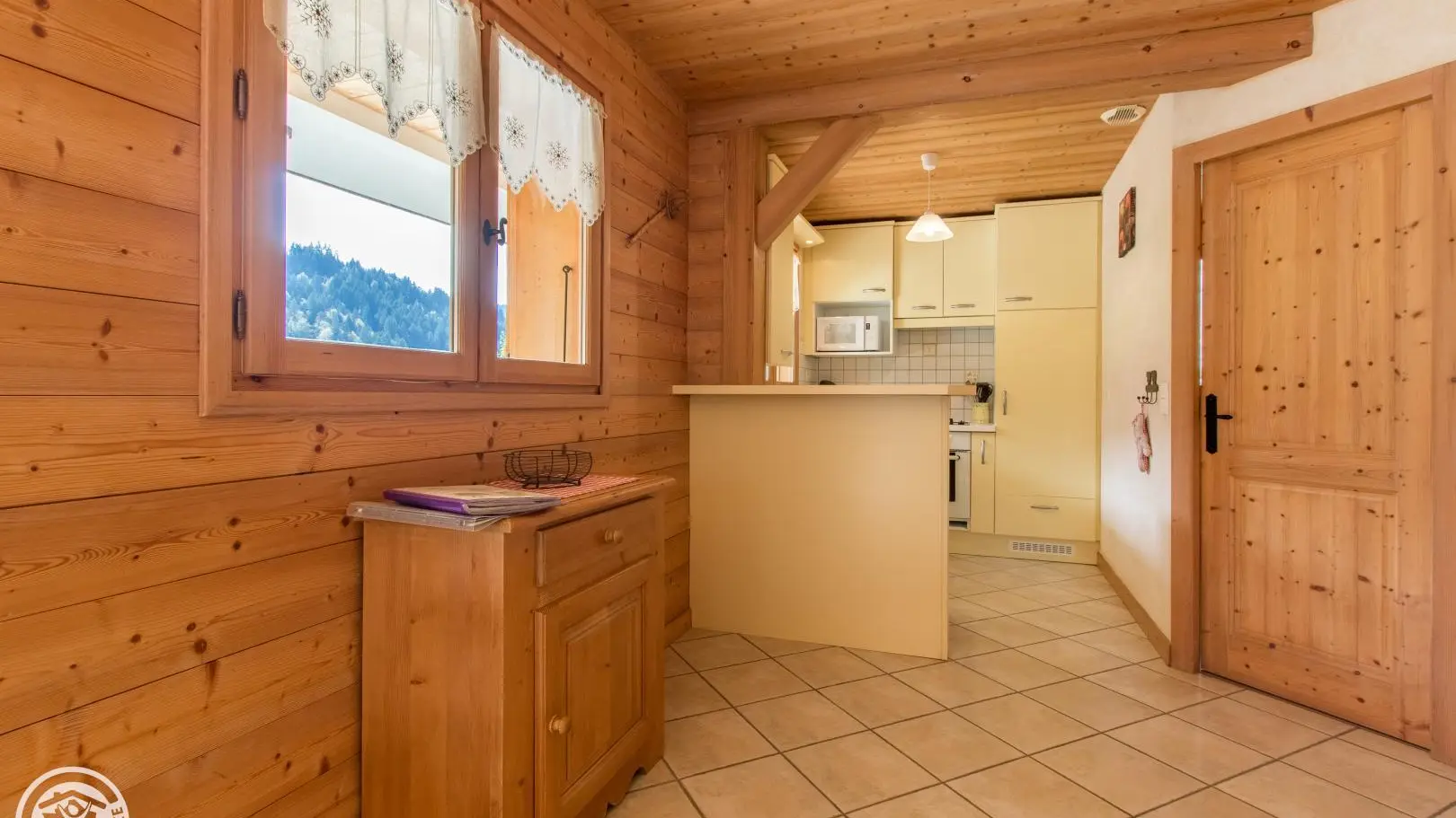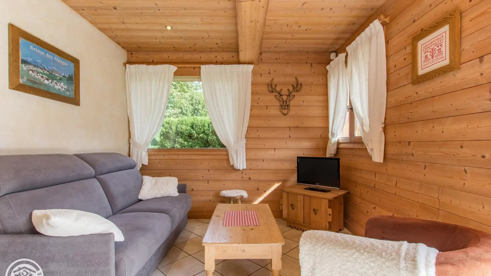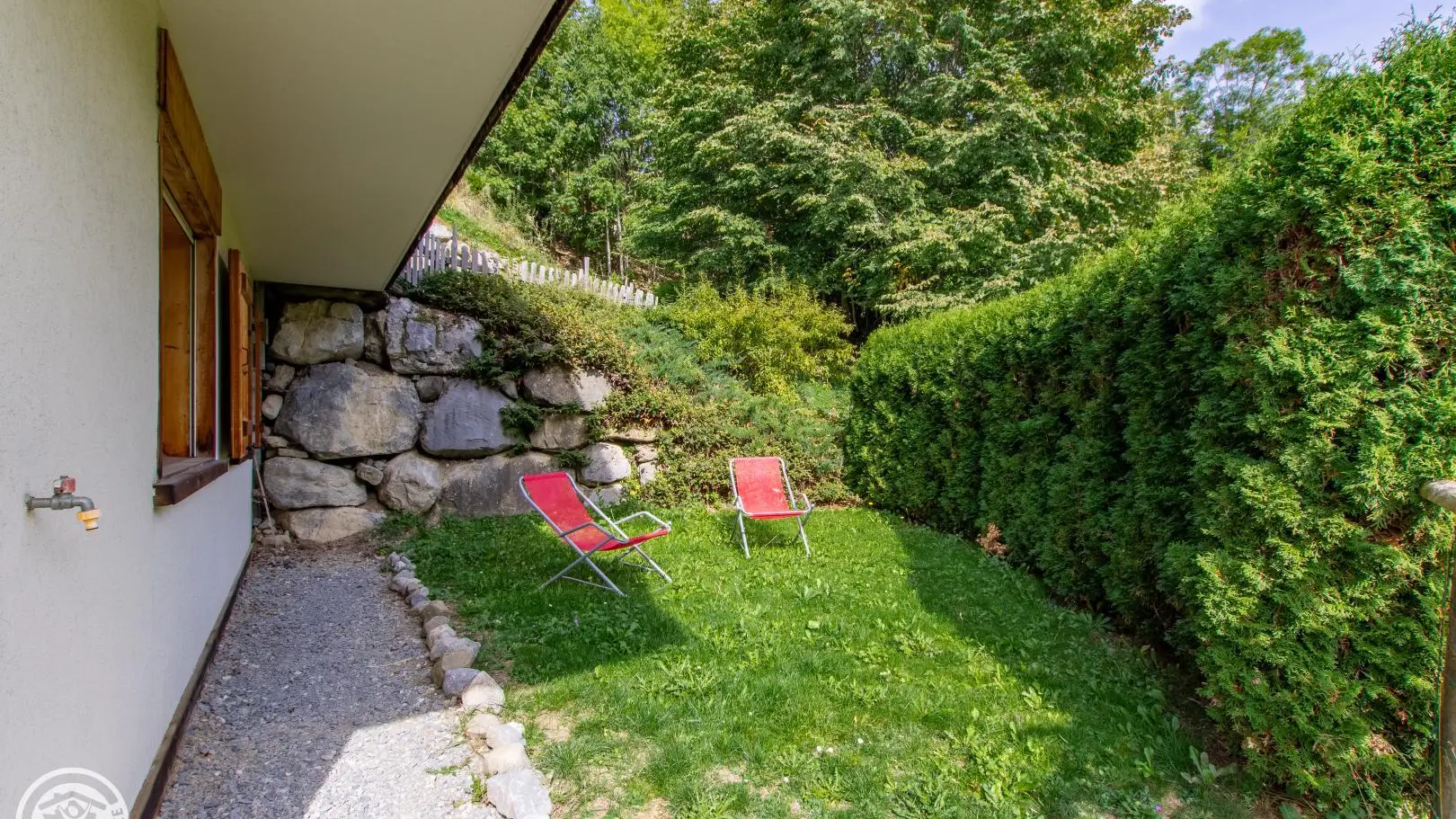 Gîte (47 sq. m.) on ground floor of owners' chalet in upper part of ski resort. South facing with views of Les Aravis range. Separate entrance accessed via outside stairs. Kitchen opening onto living room (flat screen TV, double sofa bed), access to south-facing terrace (BBQ, outdoor furniture) and garden. 2 bedrooms (2 single beds) (double bed), bathroom, separate WC. Utility room. Bed linen provided. Parking, single garage. Central heating. 10% reduction for stays of 3 weeks. La Clusaz ski areas 500m, cross-country skiing 3km. Free shuttle 400m. Many hiking/riding trails nearby. Lake des Confins (fishing) 3km. Centre of resort, all shops and activities 1.5km.