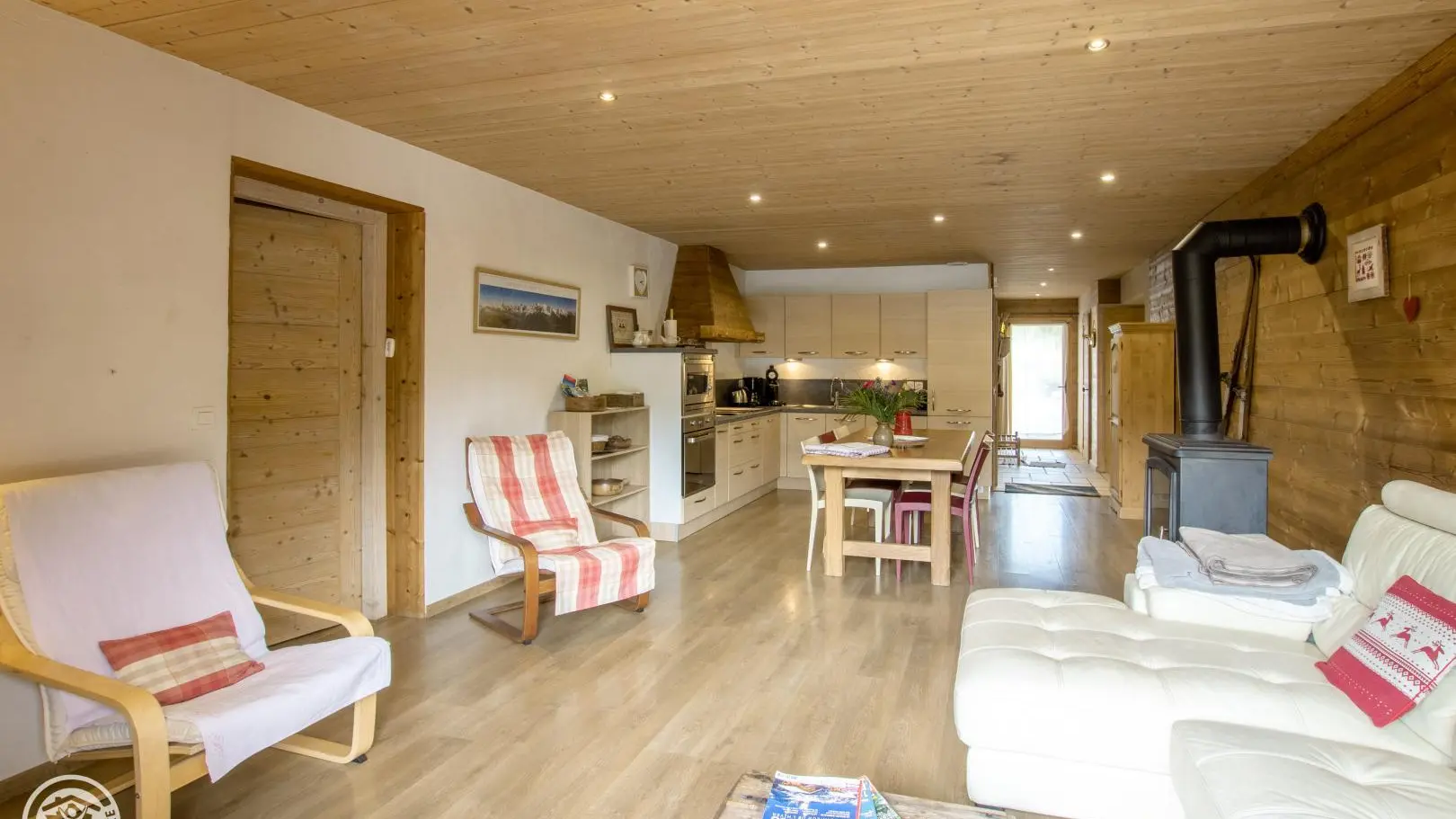 Entrance hall, fitted kitchen open to the living room with wood stove (wood provided), tv, stereo. Access to the terrace by French window.