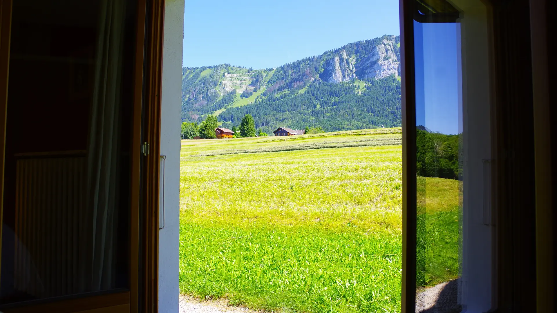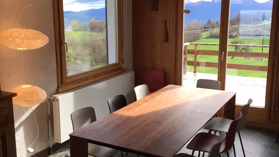 12 people family chalet on plateau (Le Hucel-Le Maravent) in the middle of the fields, double terraces (facing East-West) with open views on lake and mountains.