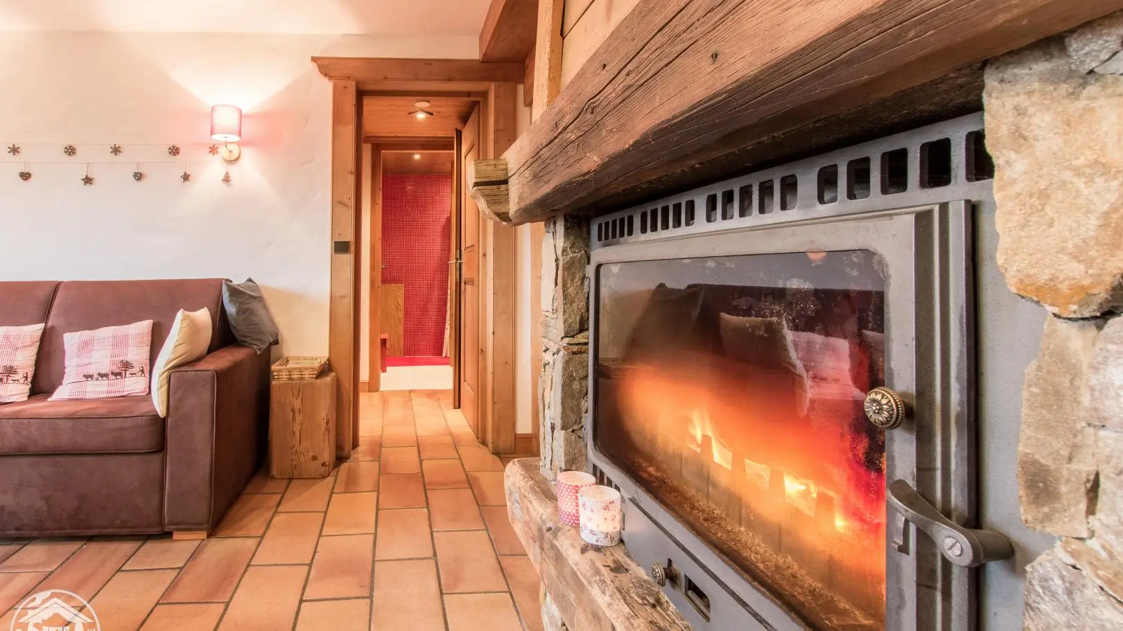 Hall, integrated kitchen open to living room (fireplace, sofa), bedroom (1 bed 160x200cm), bathroom (shower), separate wc.