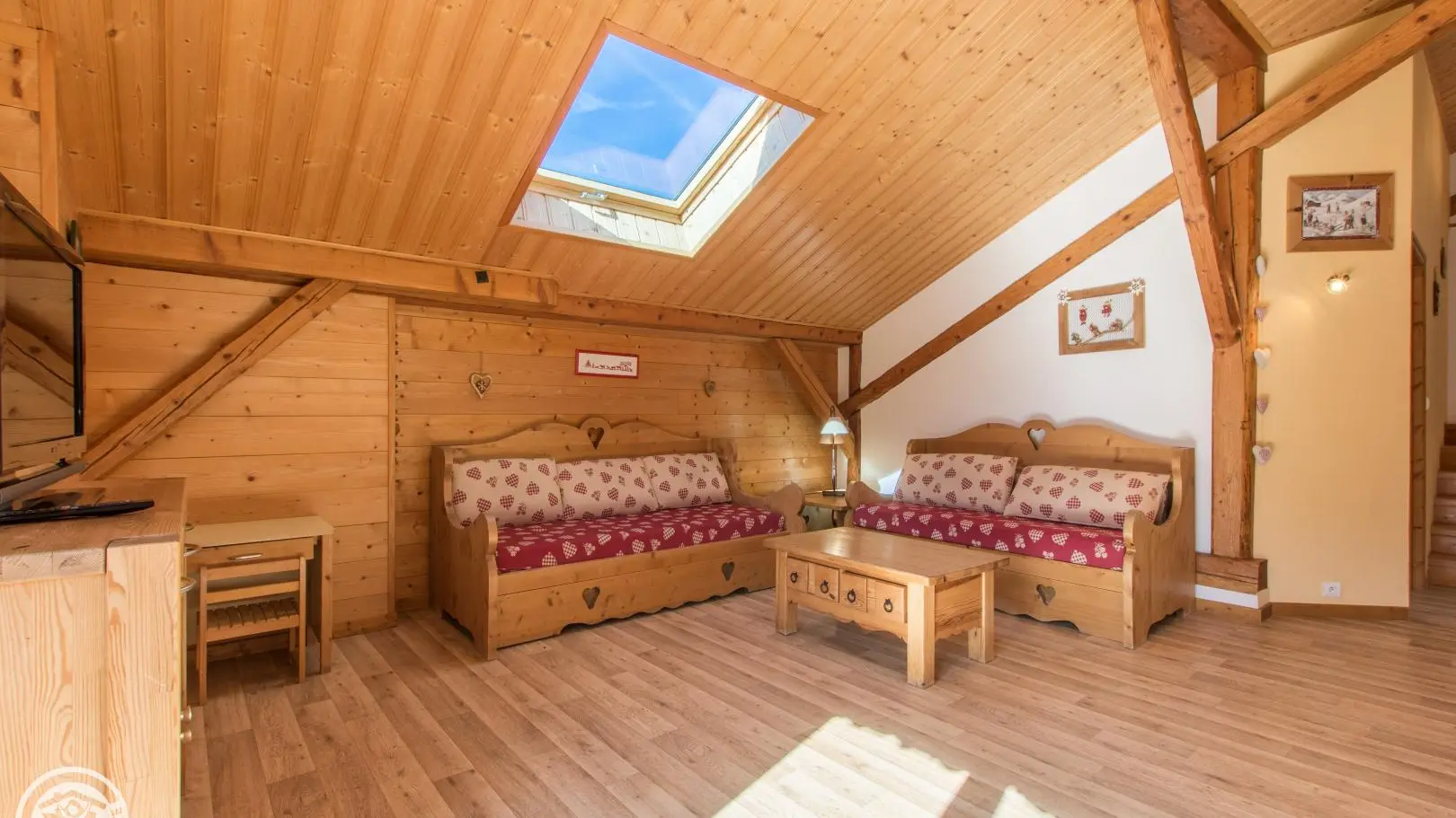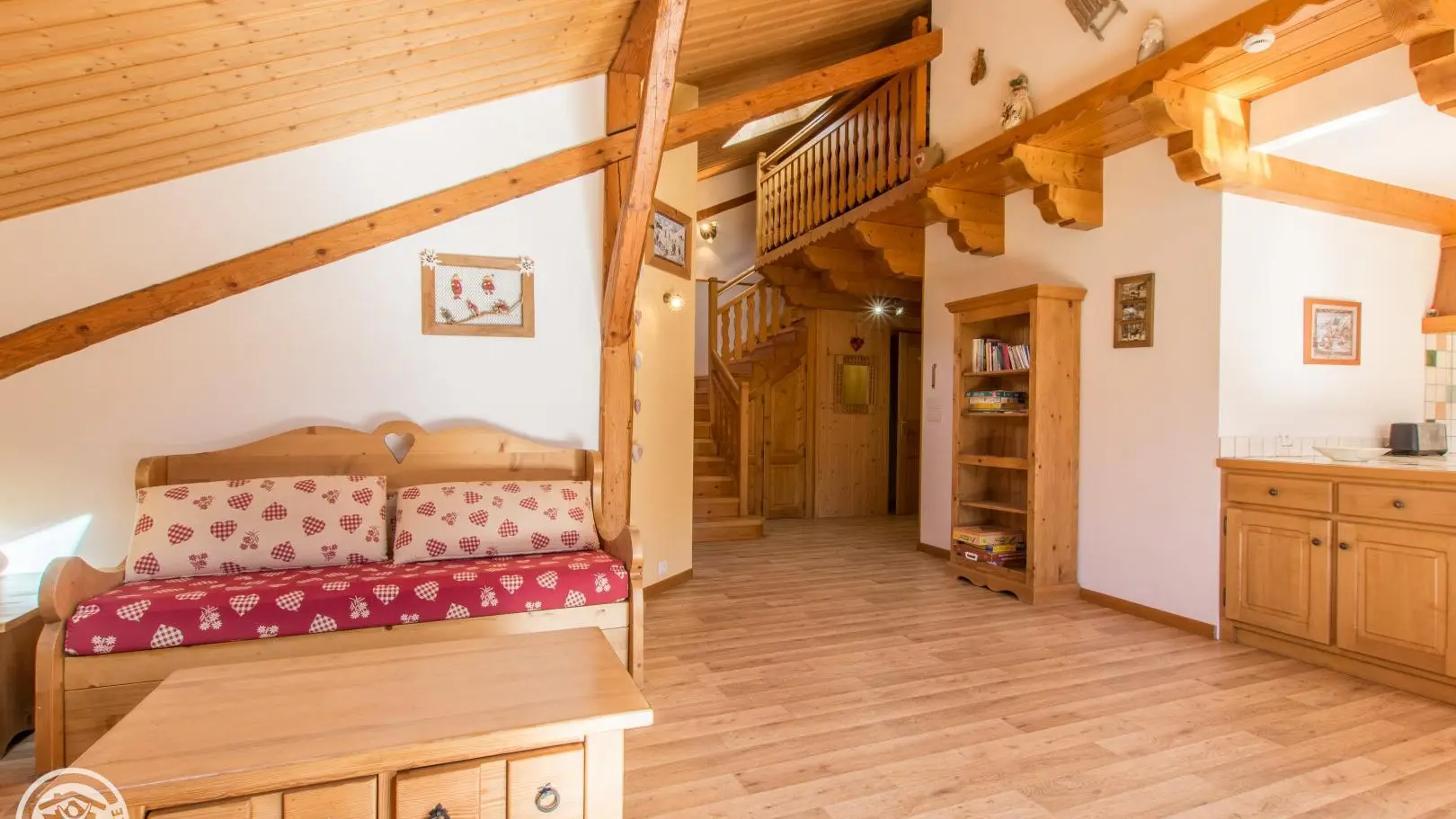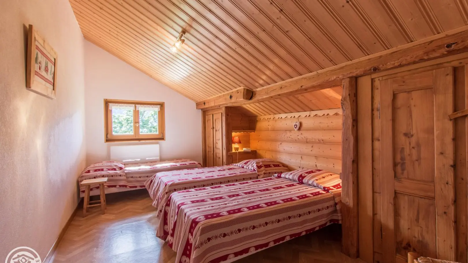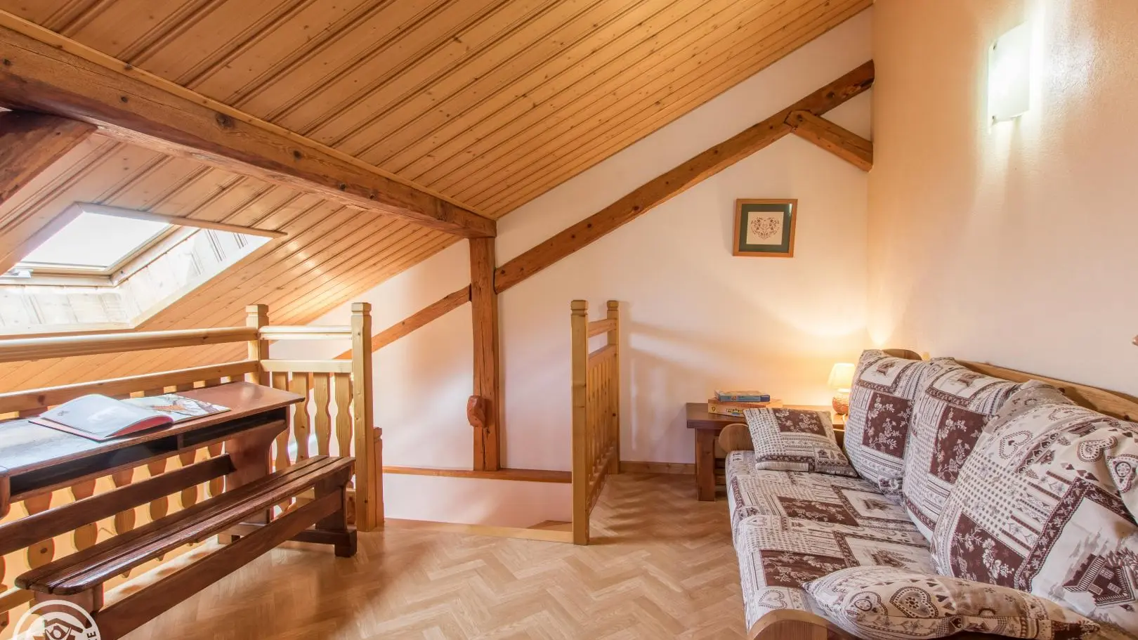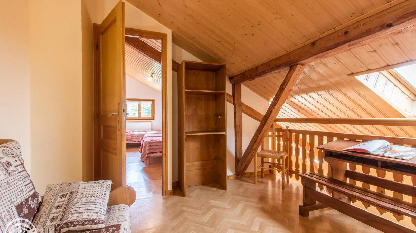 Duplex: mezzanine with sofa and desk, bedroom 2 with 3 beds 90x190cm, 2 of which can be combined.