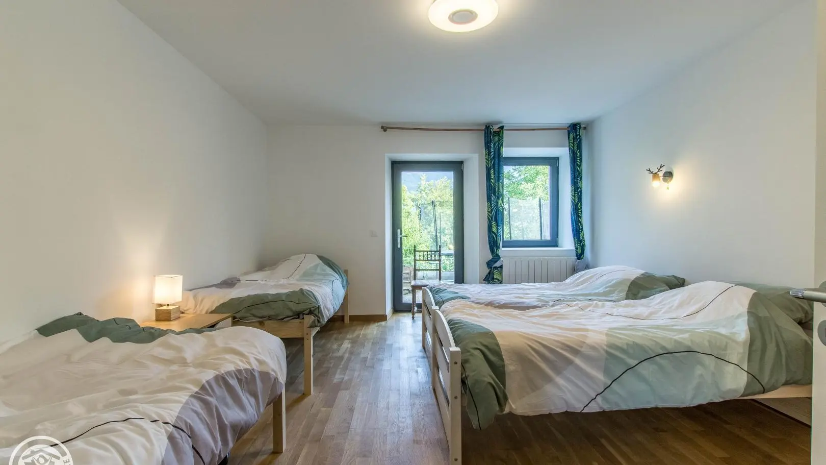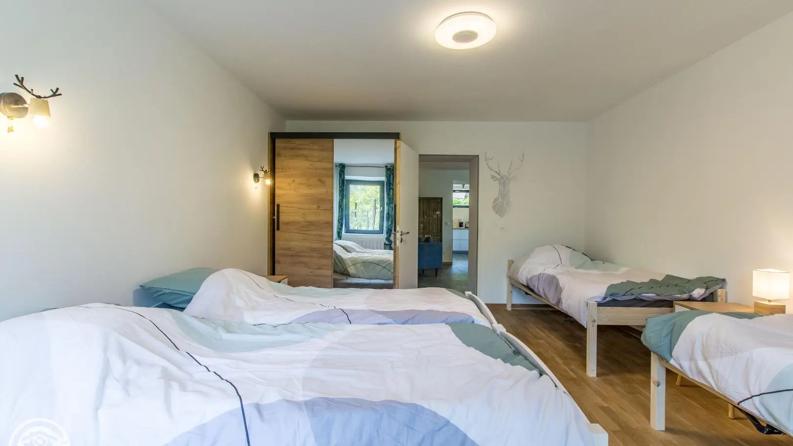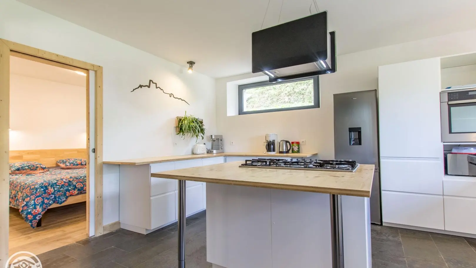 The cottage has its own independent entrance (access via 4 steps): fitted kitchen open to the living room/lounge area (TV, corner sofa, armchairs), bedroom 1 (1 160x200cm bed), bedroom 2 (1 160x200cm bed) , bedroom 3 (2 beds 90x190cm), bedroom 4 (4 beds 90x190cm).