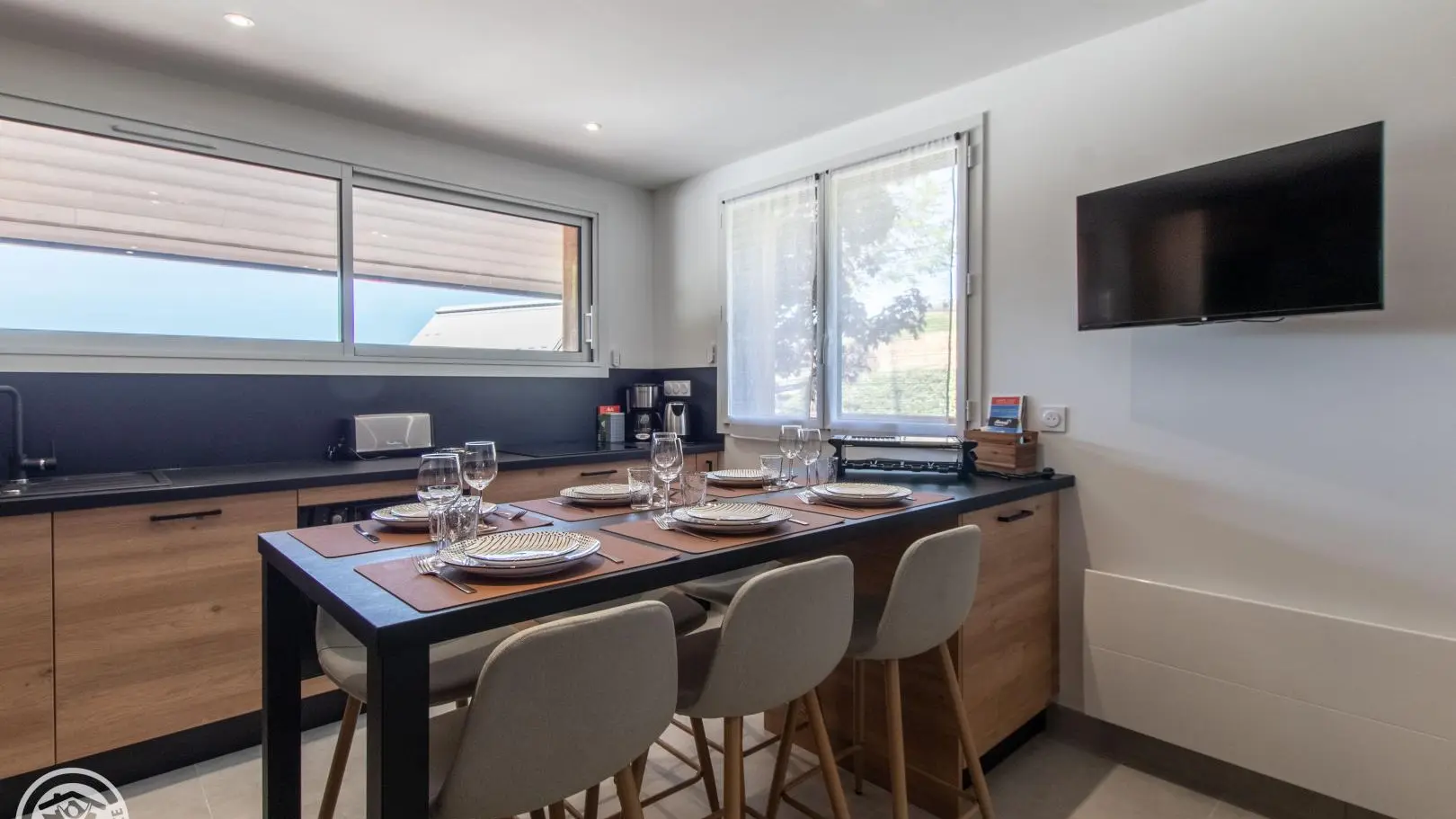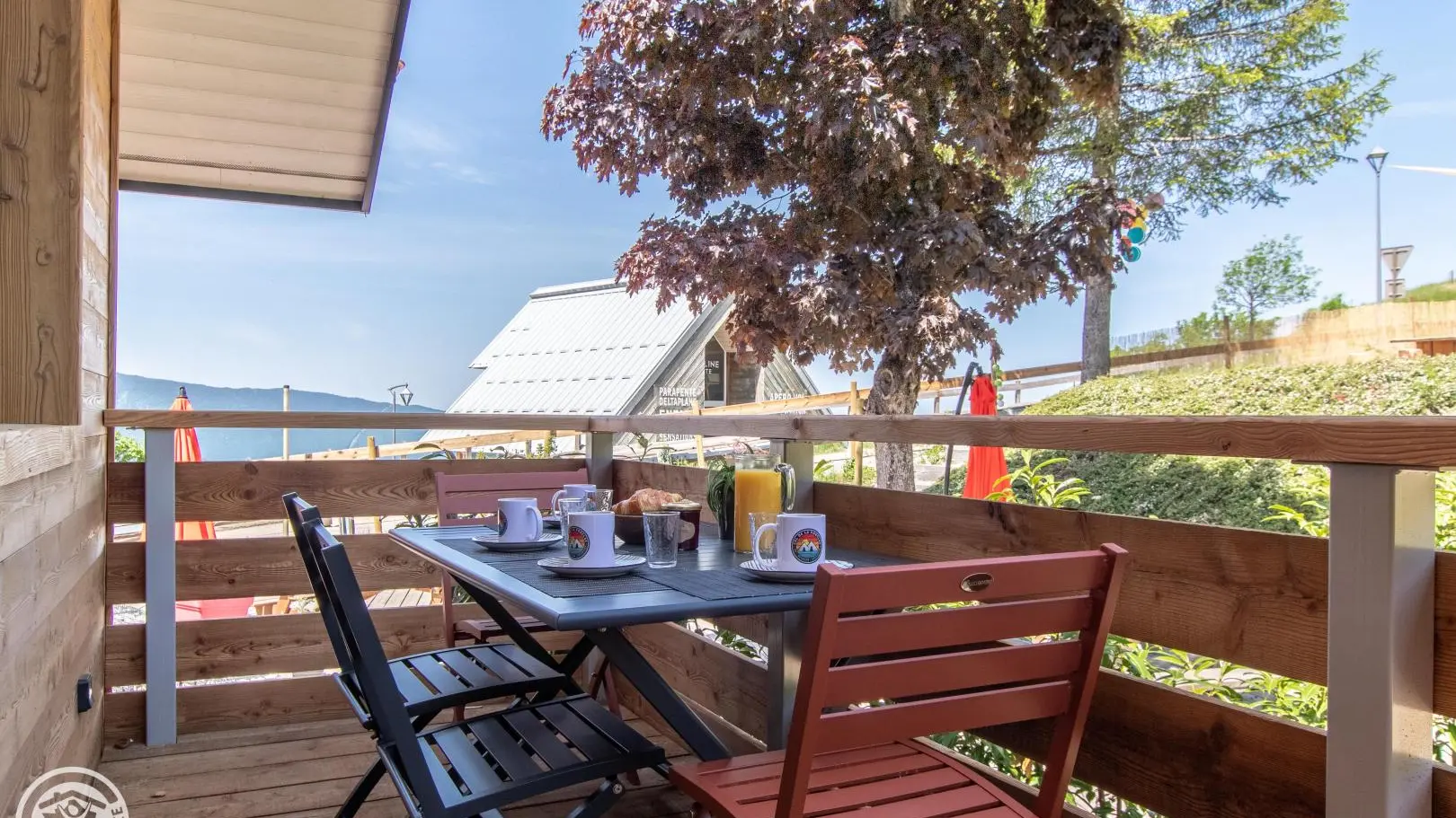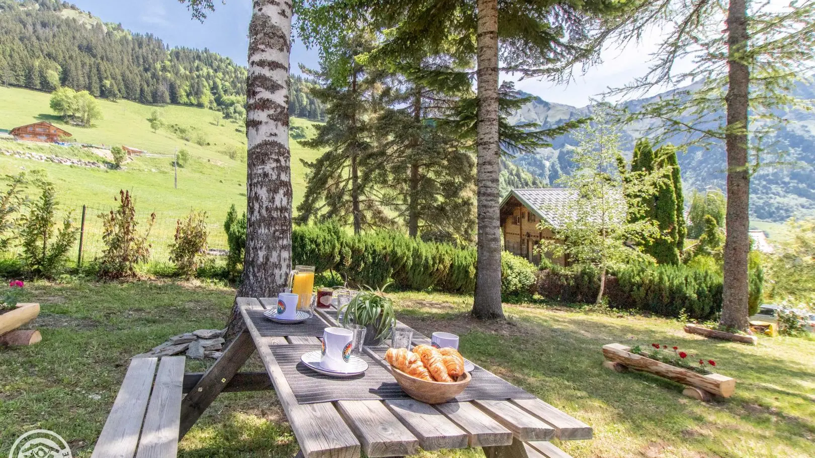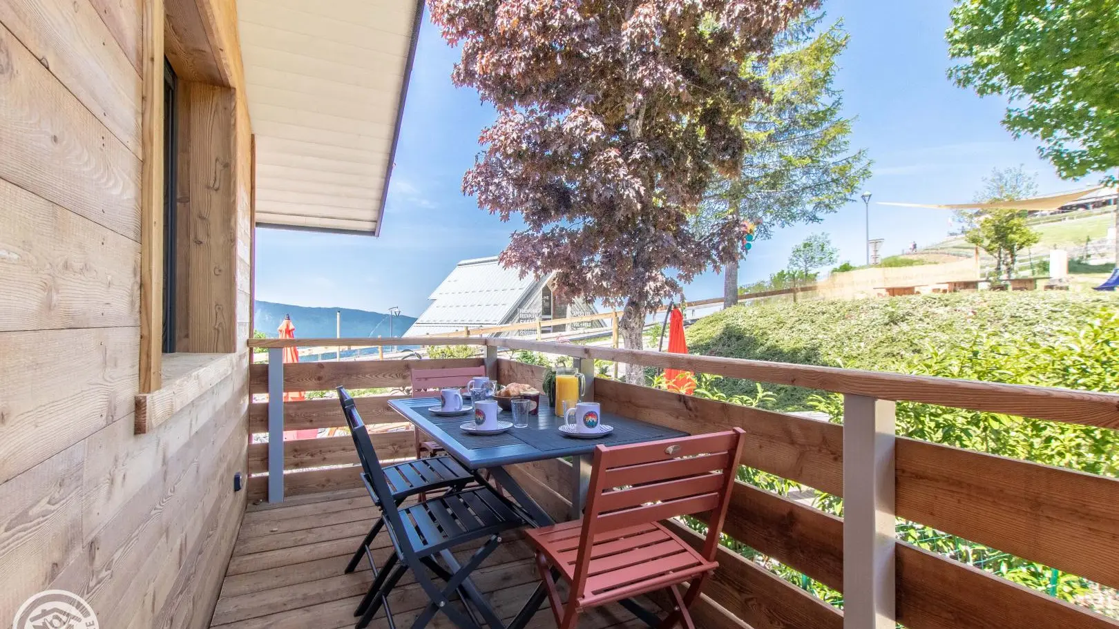 View of the Semnoz and the mountain pastures from the pass. Balcony with table and chairs overlooking the final access path to the pass. Land with mountain view, private to the three gîtes (additional developments in progress). Parking in a closed private car park.