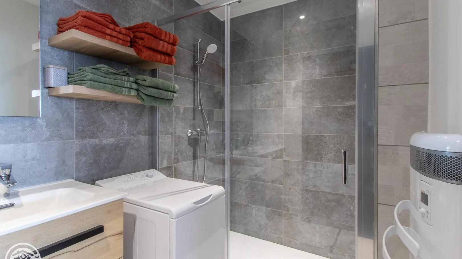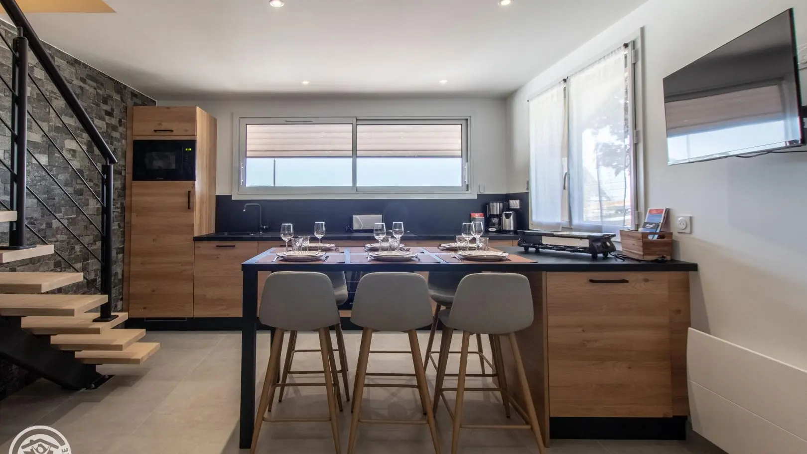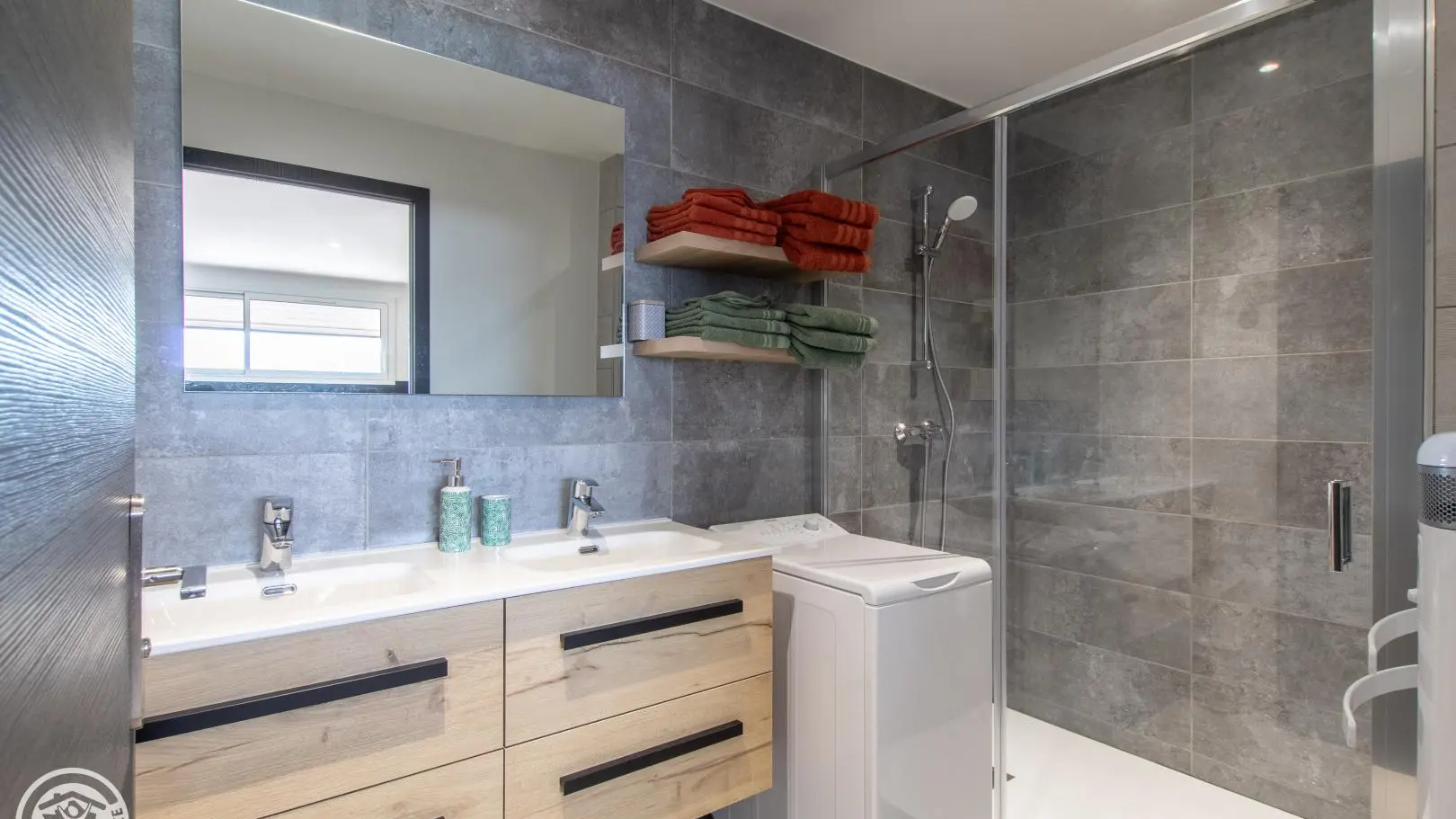 On the 1st, living room with living room comprising a sofa and an armchair, wall-mounted TV. Dining area on high chairs and fully equipped kitchen. Bathroom with large shower, double washbasin on cupboard, washing machine. Separate toilets. On the 2nd floor, small hallway giving access to bedroom 1 (140x190 cm bed, chest of drawers) and bedroom 2 (160x200 cm bed and 2 pull-out beds 80x200, chest of drawers).
