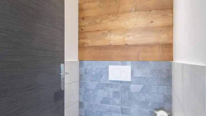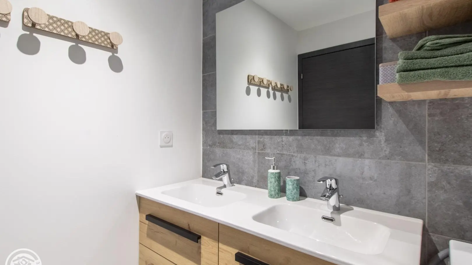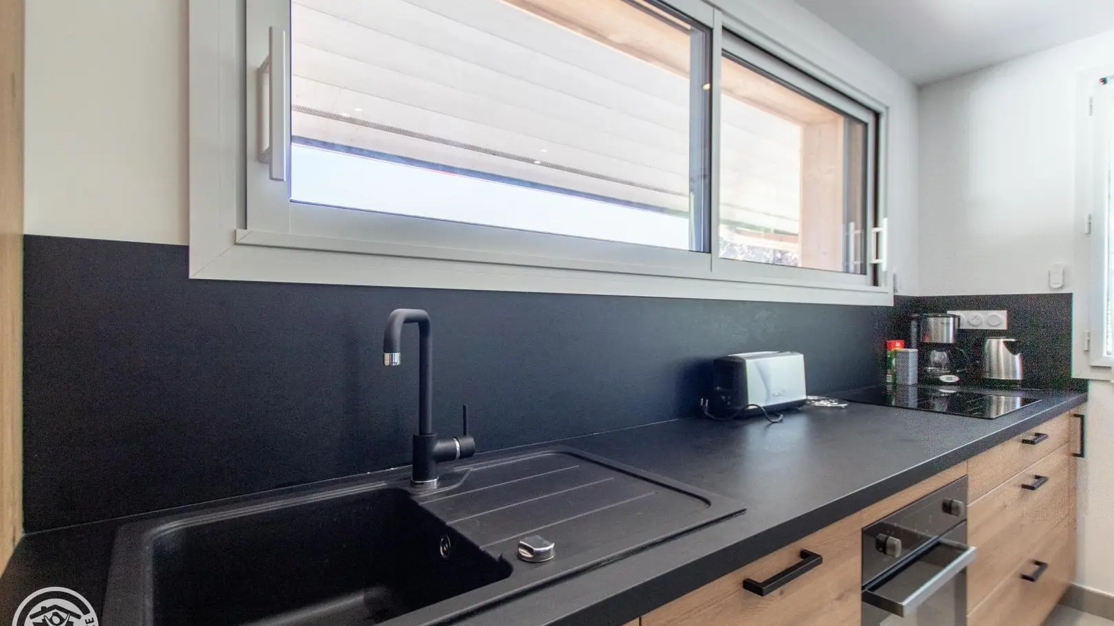 On the 1st, living room with living room comprising a sofa and an armchair, wall-mounted TV. Dining area on high chairs and fully equipped kitchen. Bathroom with large shower, double washbasin on cupboard, washing machine. Separate toilets. On the 2nd floor, small hallway giving access to bedroom 1 (140x190 cm bed, chest of drawers) and bedroom 2 (160x200 cm bed and 2 pull-out beds 80x200, chest of drawers).