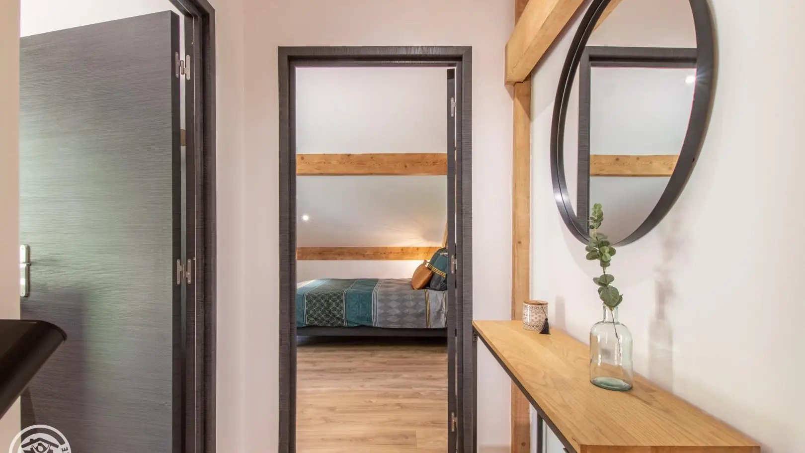 Gîte of 47 m² (+10 m² attic) on two levels, on the 1st floor of a chalet-type house which also includes two other gîtes. Located above a trade of souvenirs and regional products. Access by external staircase, shared with a second gite.