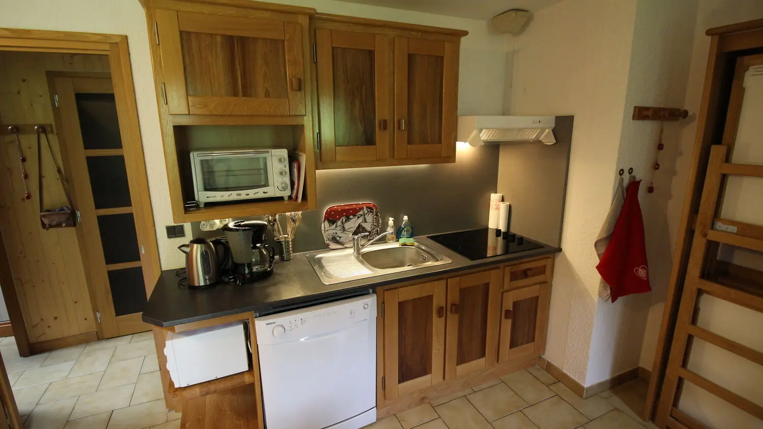 - Kitchenette: fridge, ceramic hob, dishwasher, conventional oven, microwave oven, kettle, coffee maker, toaster, raclette + fondue machines, crockery.