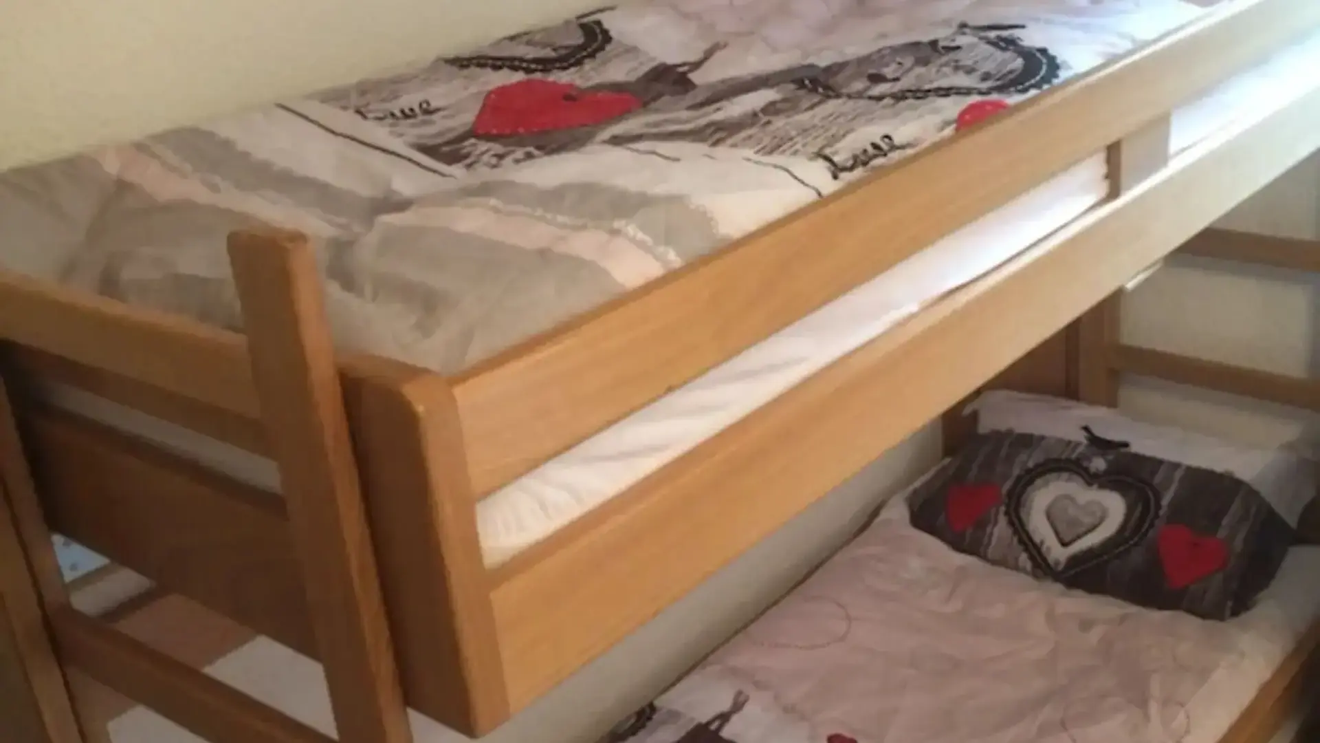 -Living room: BZ sofa bed, mini table and stools, TV, two bunk beds (folding out to the wall)