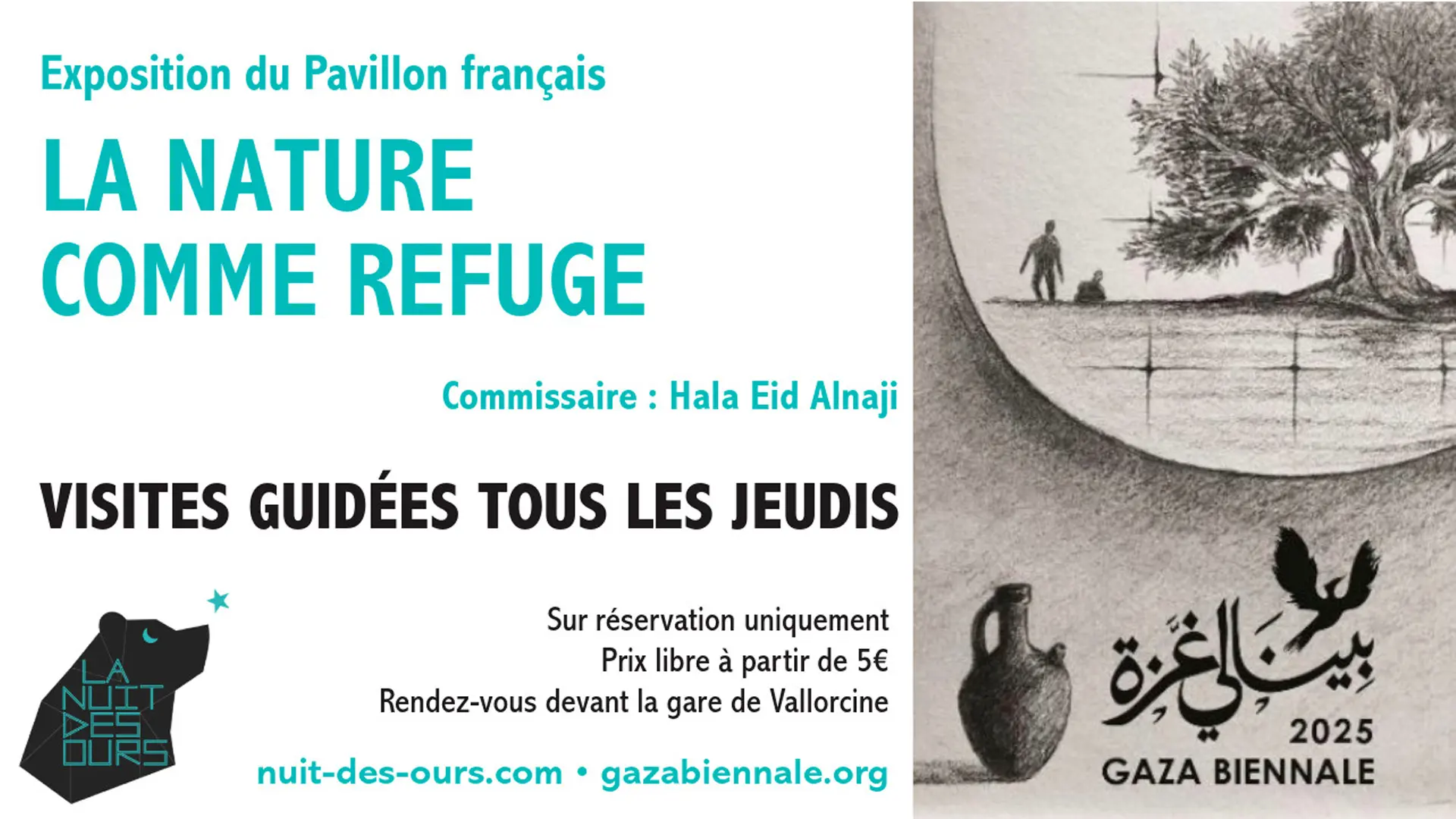 This autumn, we are offering guided tours of the exhibition NATURE AS A REFUGE, the French pavilion of the GAZA BIENNALE in Vallorcine. This outdoor exhibition presents works by Palestinian artists from Gaza and artists in exile.