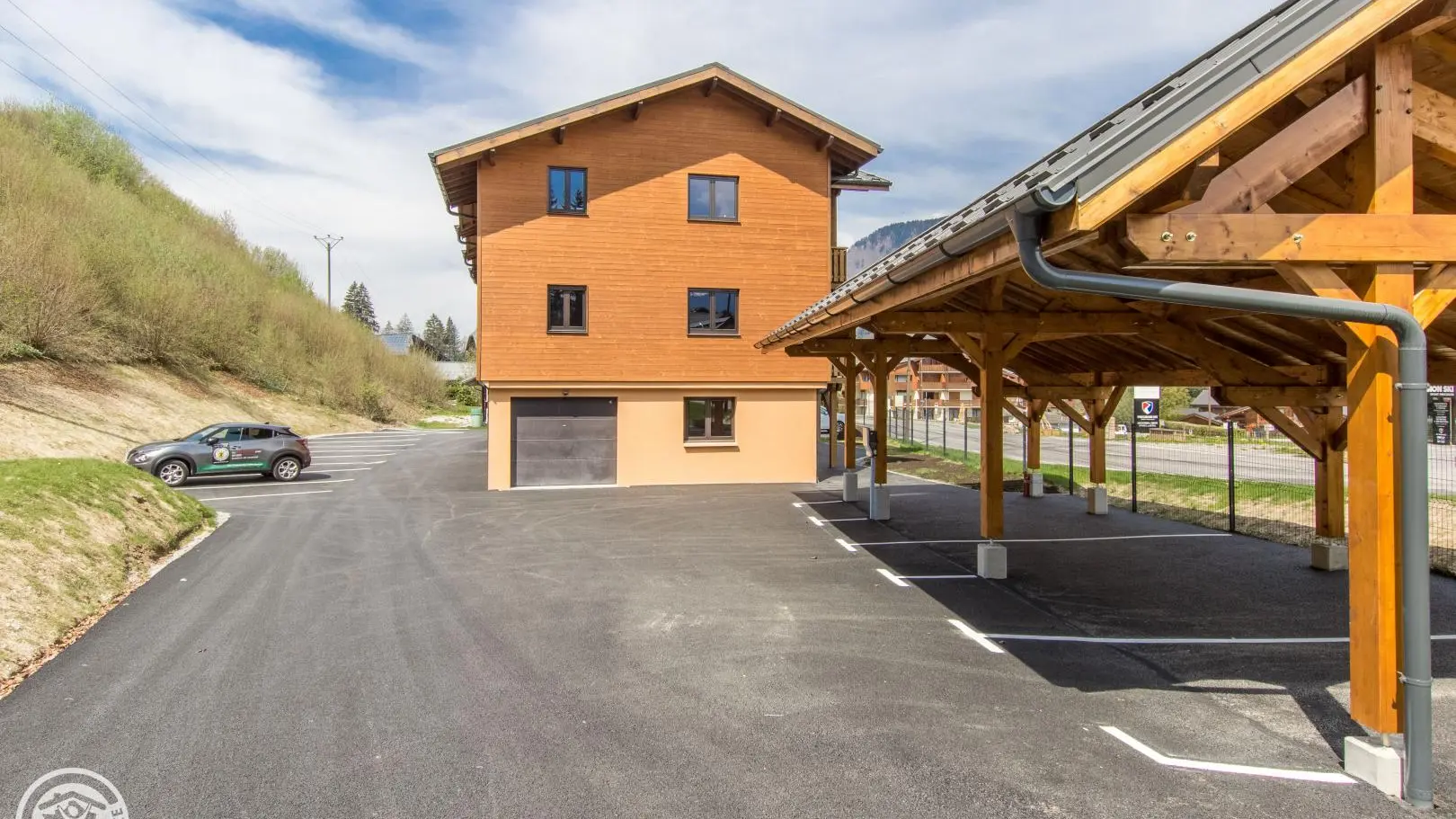 Ample on-site parking with one covered space per apartment. Electric charging station.