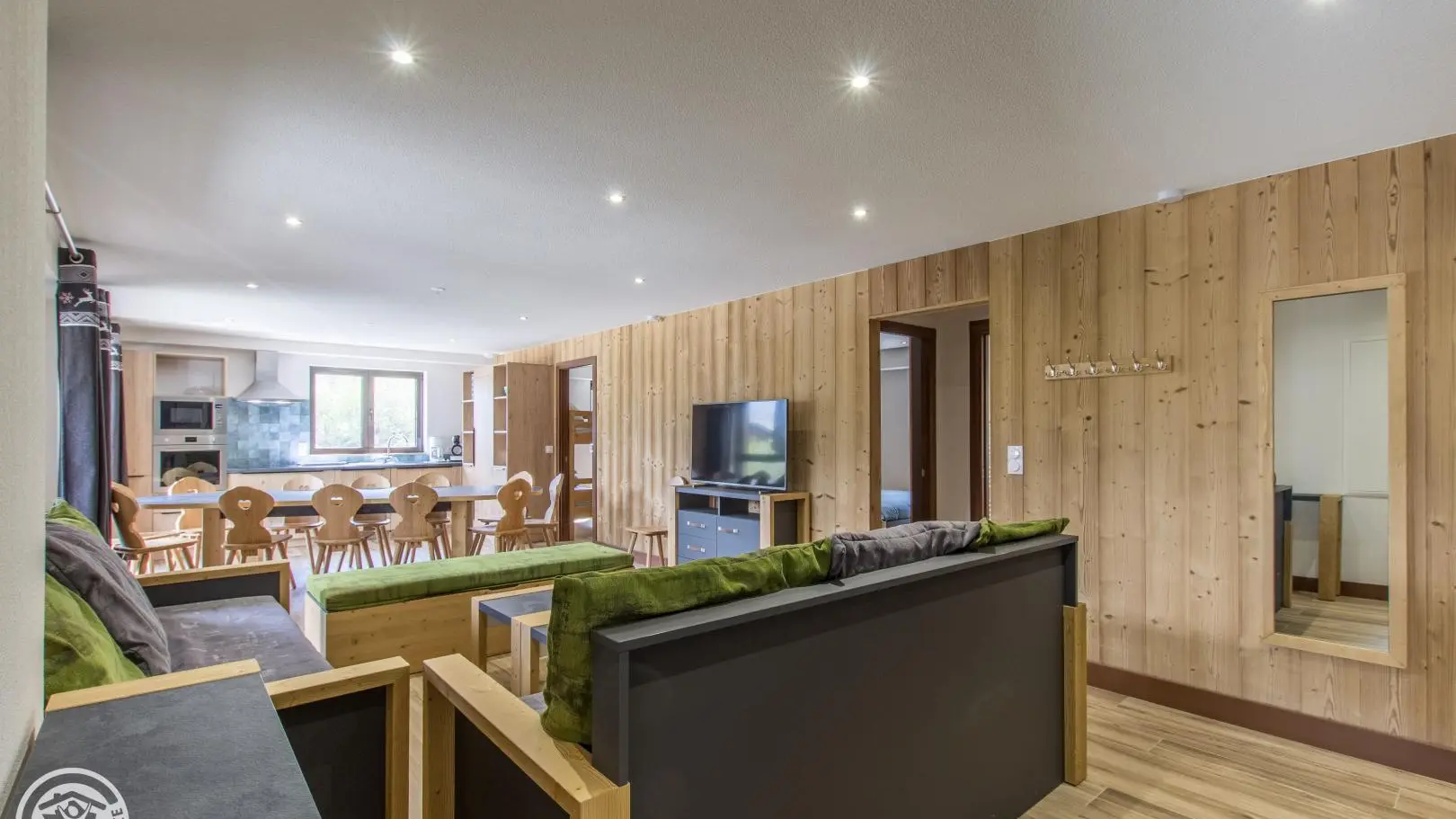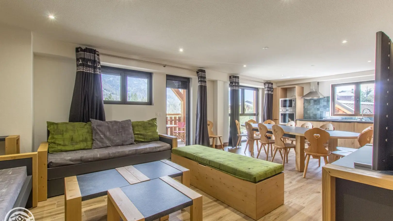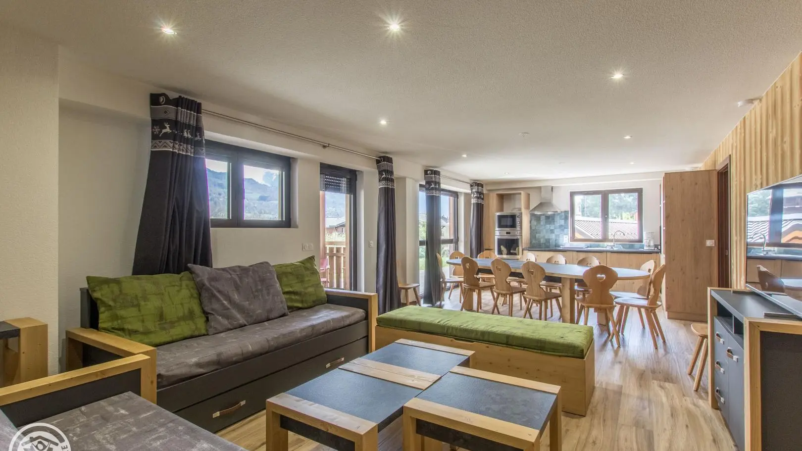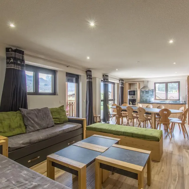 Large living room with integrated kitchen area opening onto the living room (TV, pull-out sofa bed offering 2 extra beds 80x190cm that can be combined).