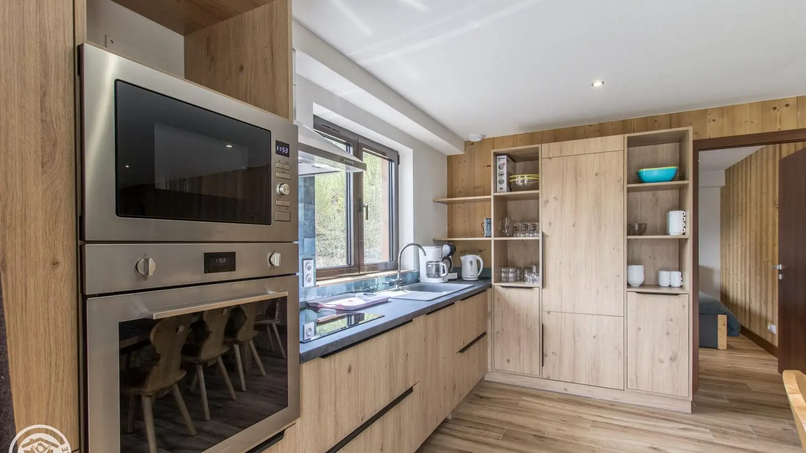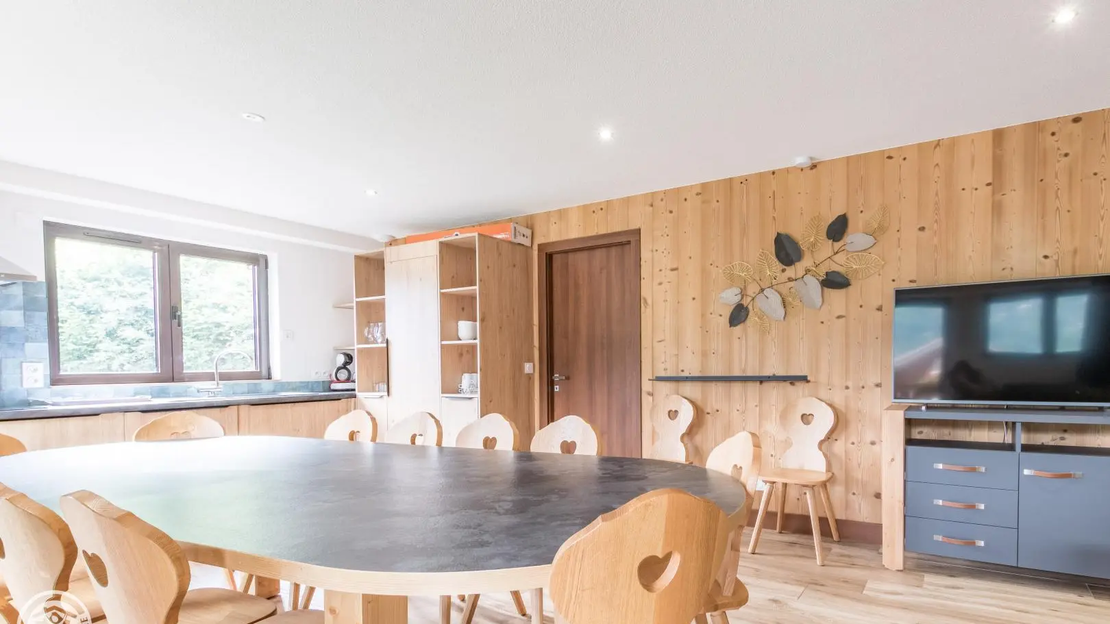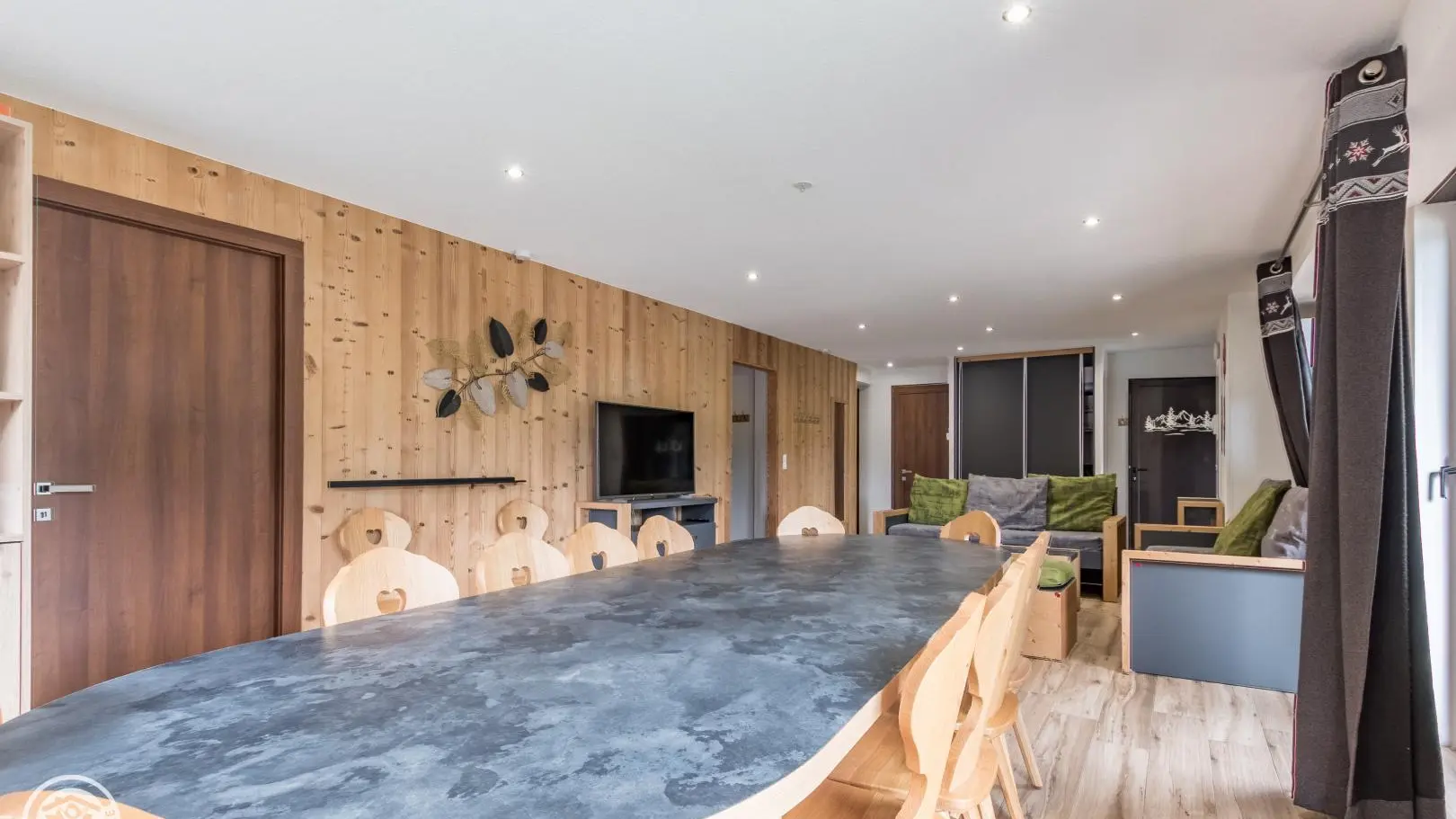 Large living room with integrated kitchen area opening onto the living room (TV, pull-out sofa bed offering 2 extra beds 80x190cm that can be combined).