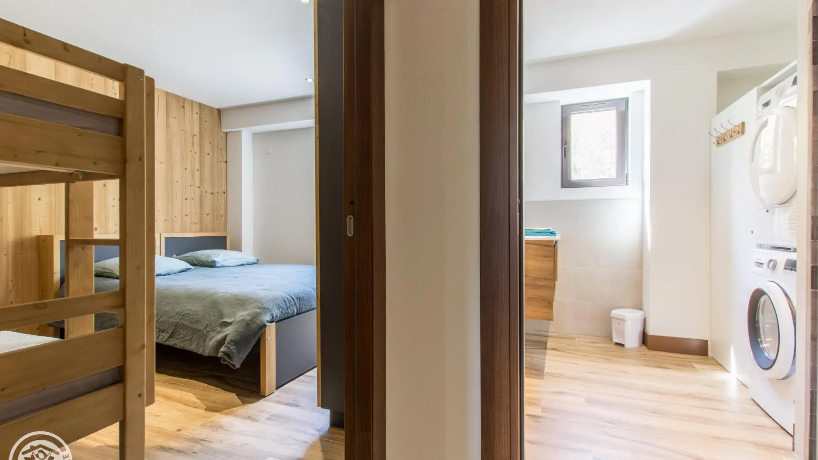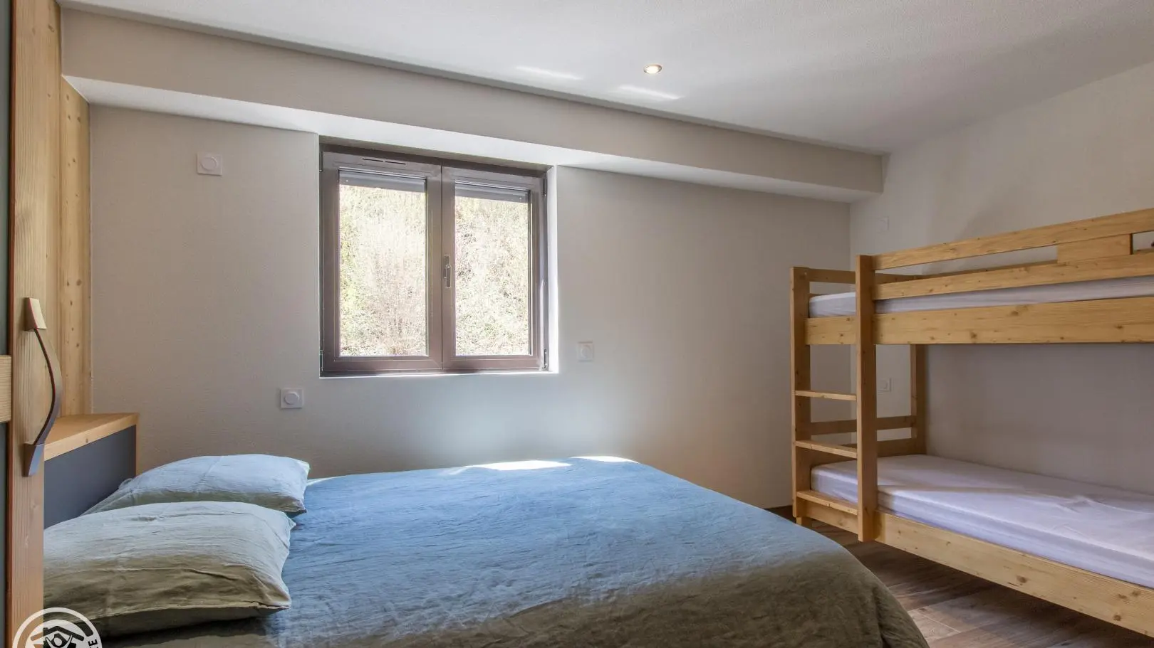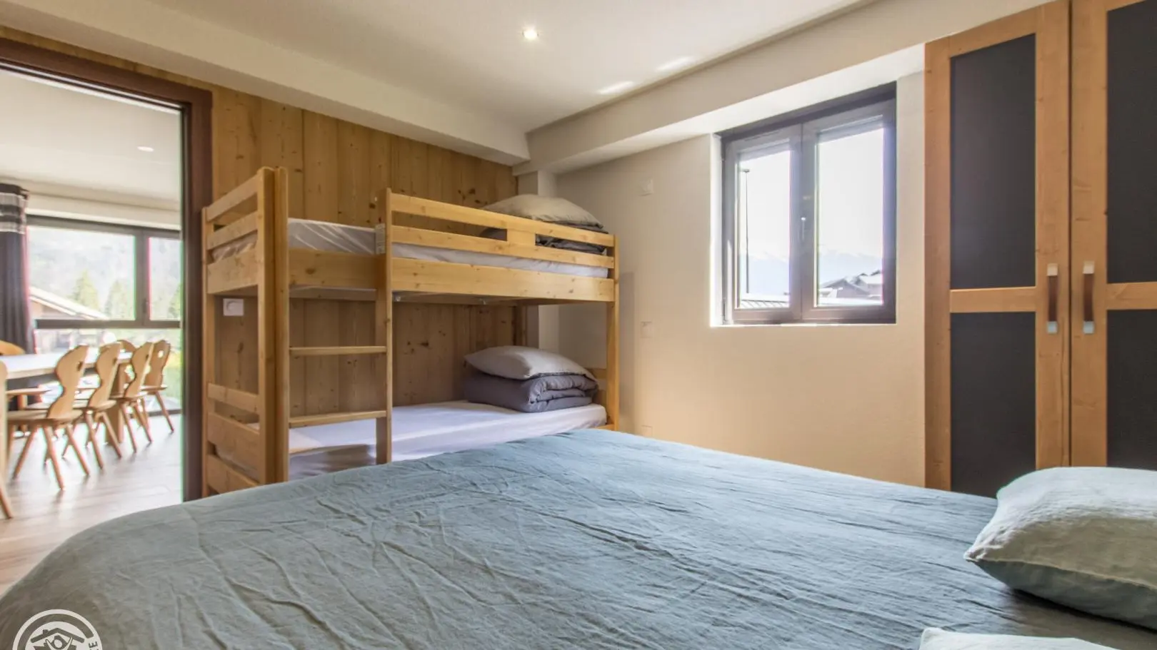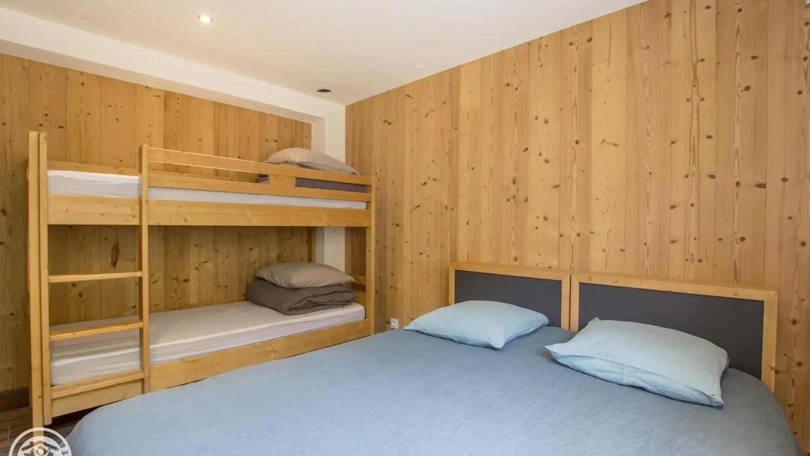 Bedroom 1 (2 80x200cm beds that can be twinned into a 160cm bed + 2 90x190cm bunk beds), bedroom 2 (2 80x200cm beds that can be combined into a 160cm bed + 2 90x190cm bunk beds), bedroom 3 (1 140x200cm bed + 2 90x190cm bunk beds).