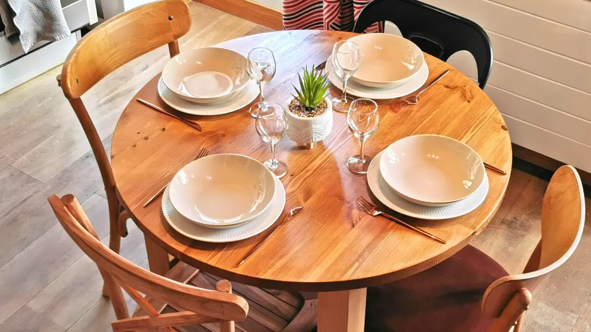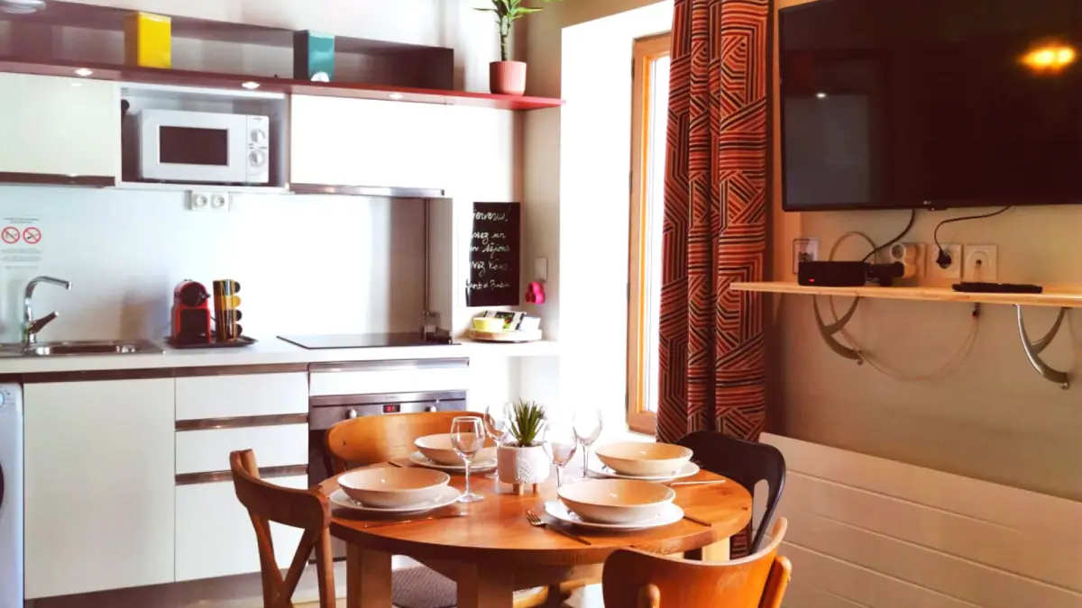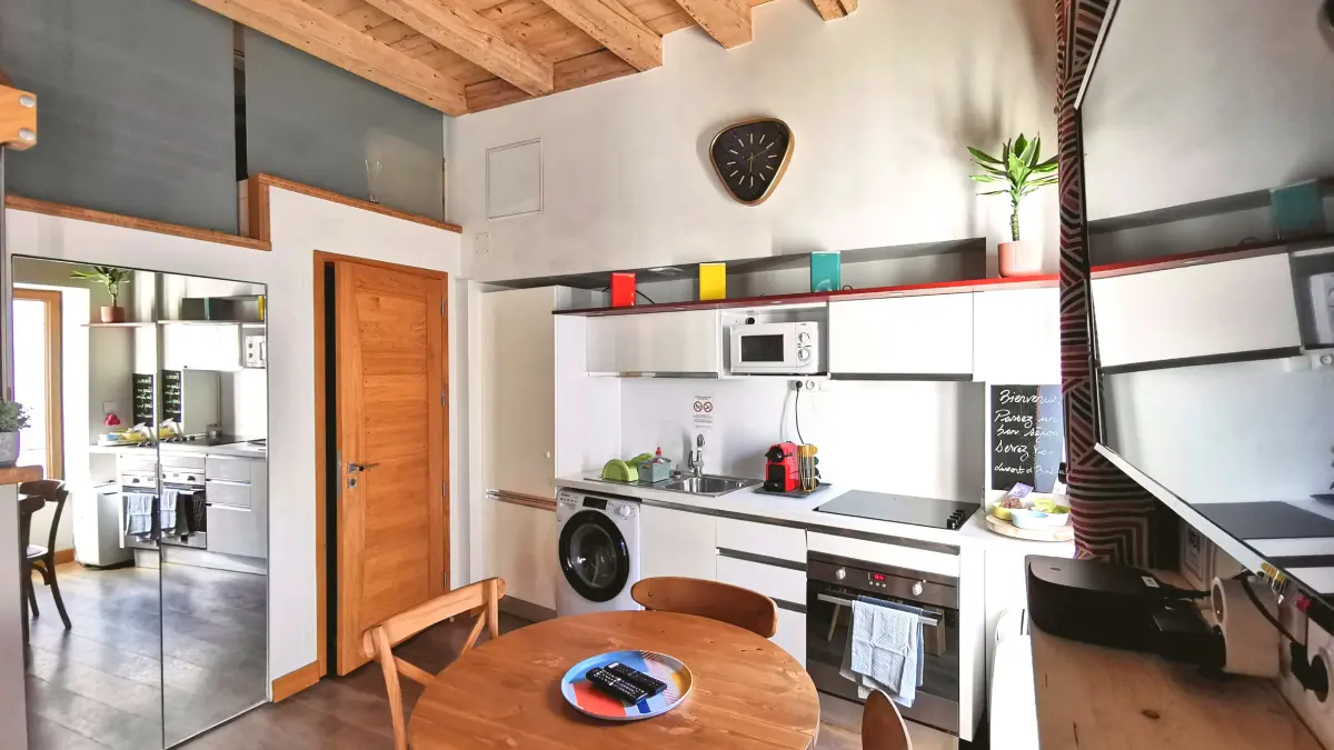 A main room with a fully equipped kitchen (oven, fridge, electric hob, washing machine, toaster, Nespresso coffee machine) and its dining table