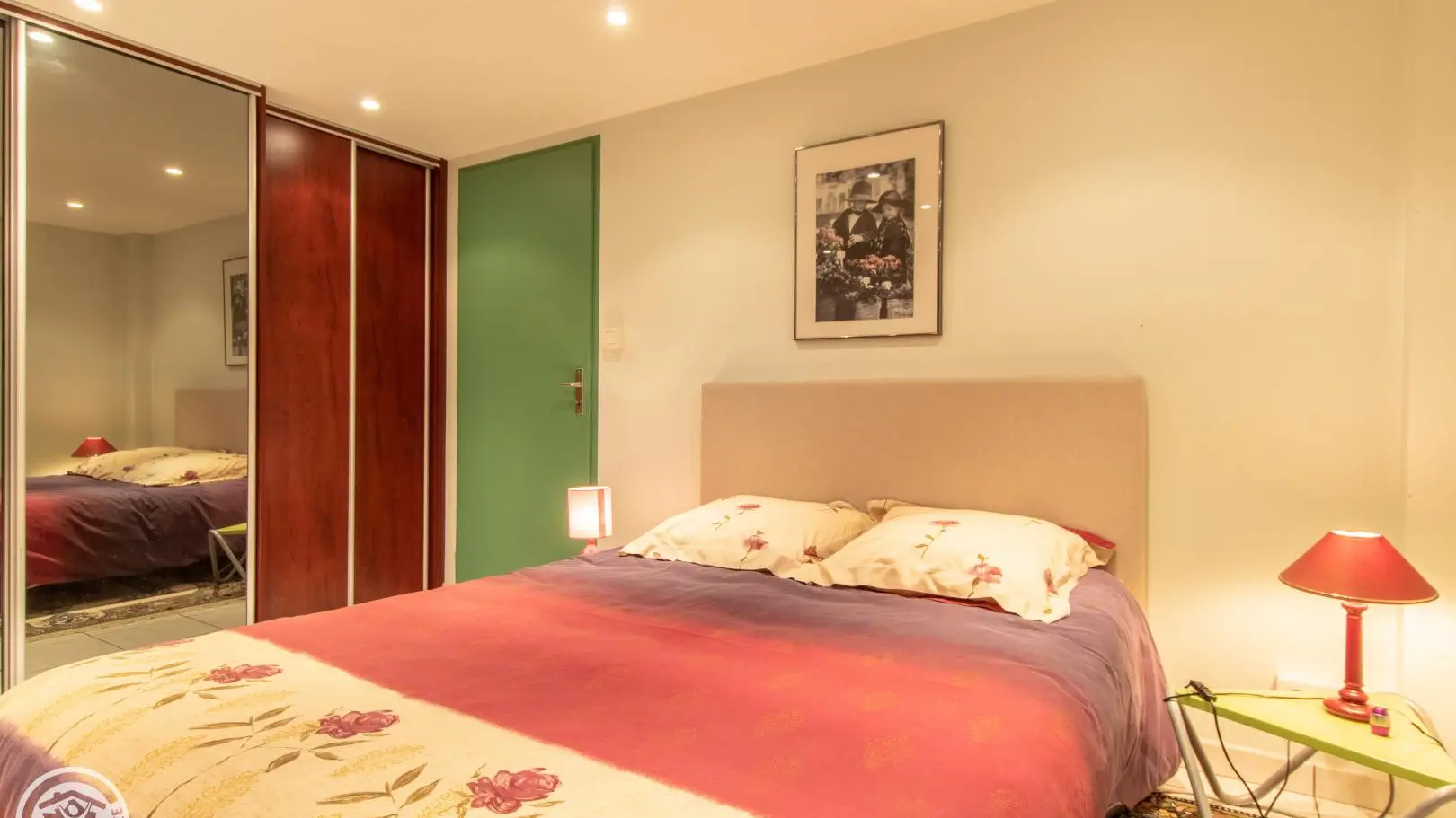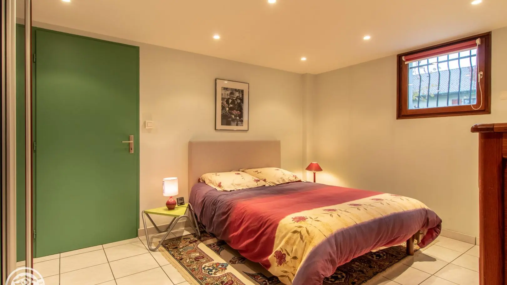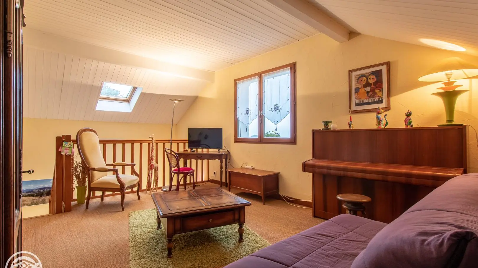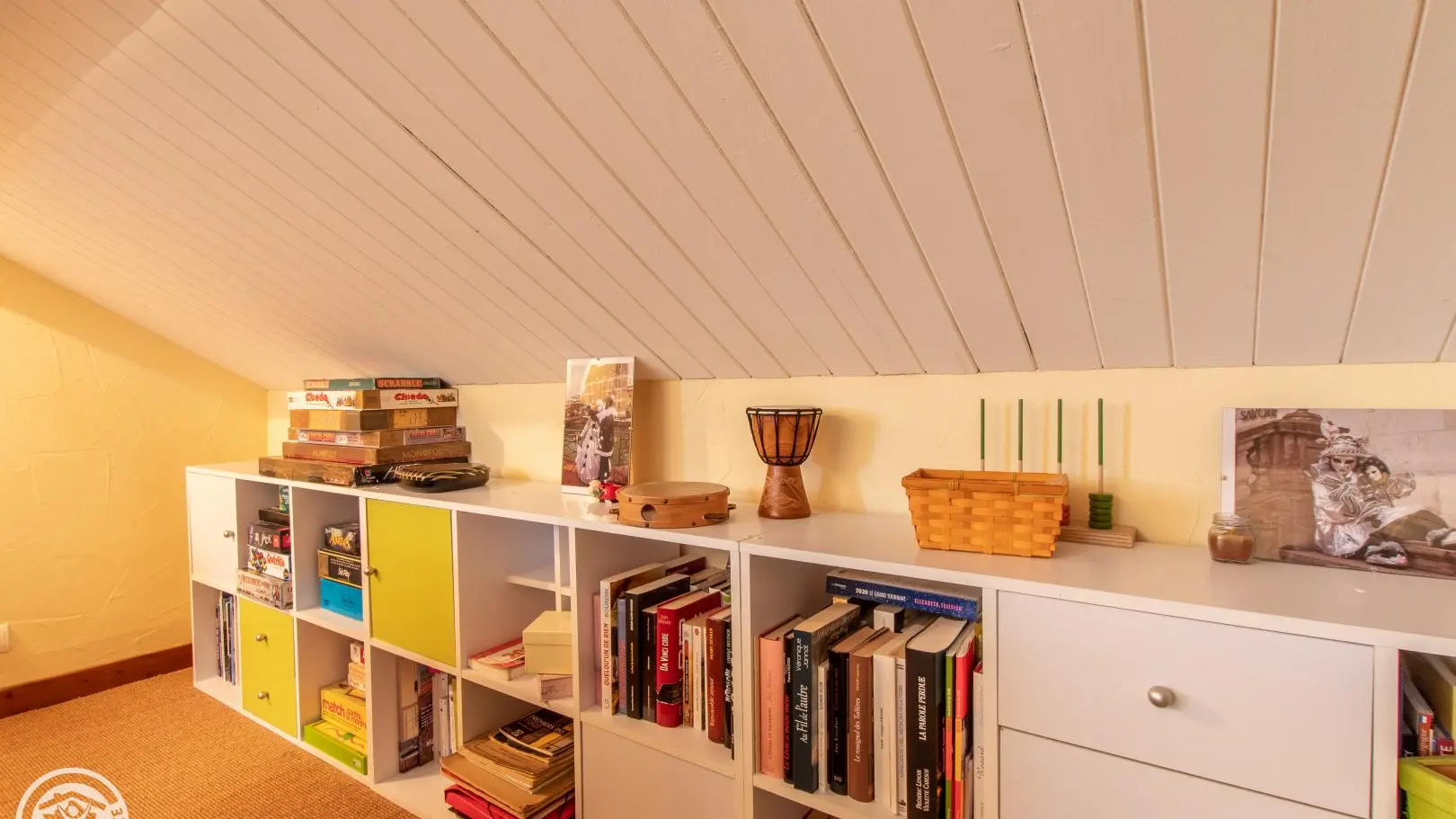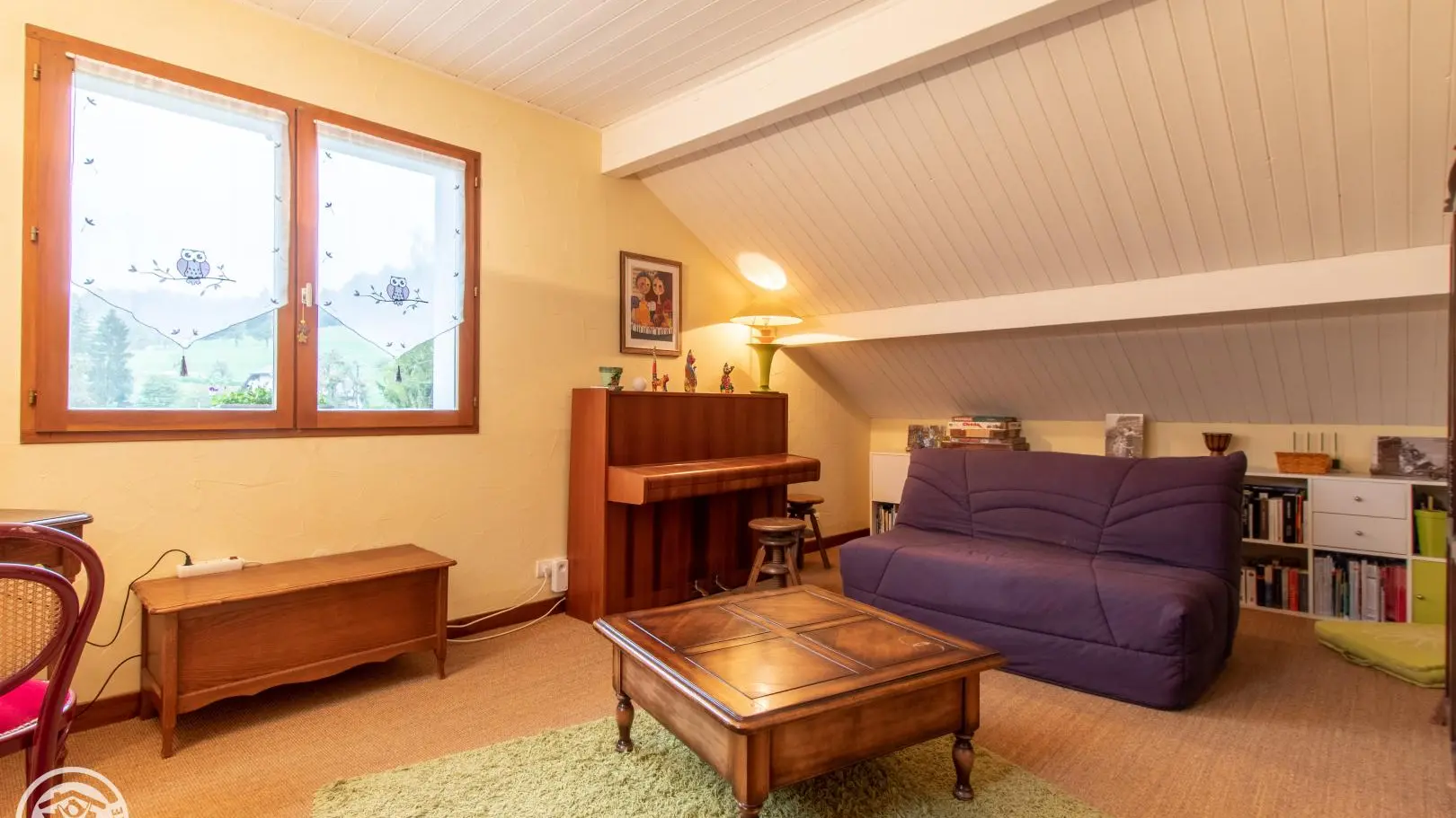 Upstairs, mezzanine accessible by an internal staircase and comprising a 140x190 cm sofa bed, armchair, TV on desk, small library and piano. TV sockets available to connect the TV in the main room or in the bedroom. Wi-Fi internet. No baby equipment. Sheets and towels provided. Bathroom linen and end-of-stay cleaning offered as an option.