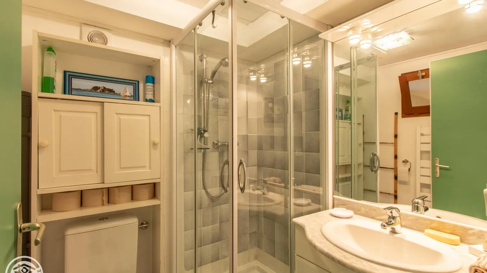 On the ground floor, access to the main room comprising the kitchen (fully equipped with fixed dining table for 4 people), open to a relaxation area (two armchairs, table). Access to the bedroom (bed 140x190cm, high window with curtain and mosquito net). Crossing access to a laundry area (washing machine) separated from the bedroom by a curtain as well as to the bathroom (shower cabin, WC).