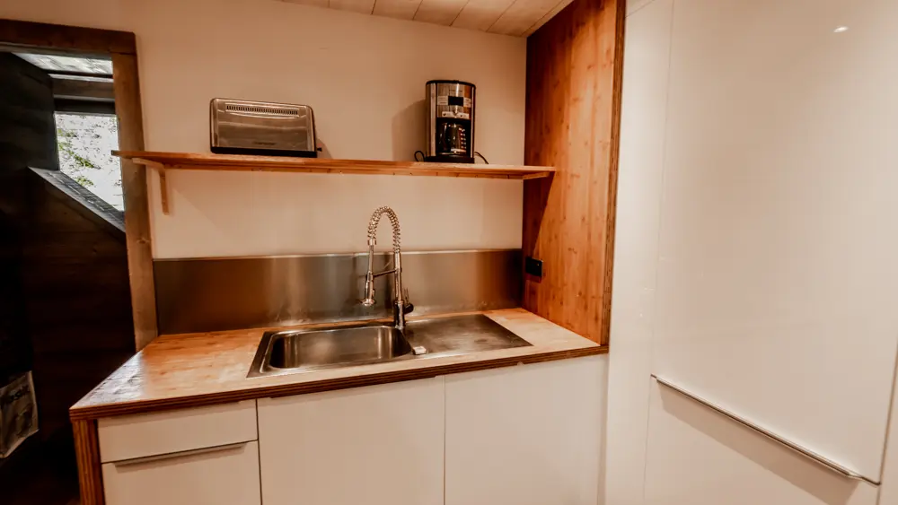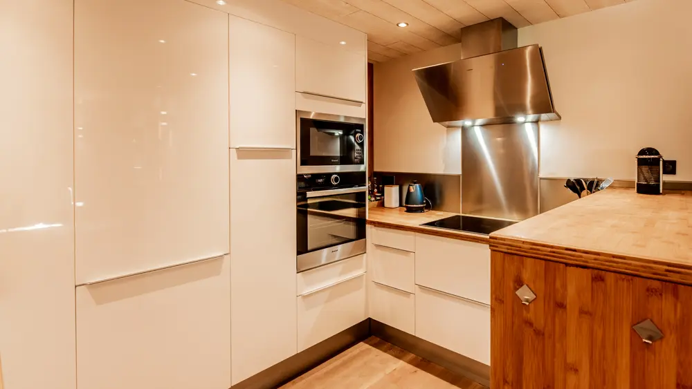 Fully-equipped kitchen opening onto living room: fridge, oven, microwave, hood, ceramic hob, toaster, electric kettle, blender, juicer, Nespresso and filter coffee machines, dishwasher, washing machine and dryer. Two raclette and two fondue machines.