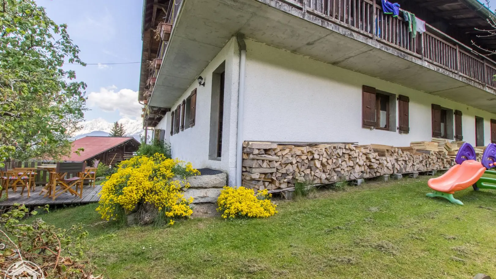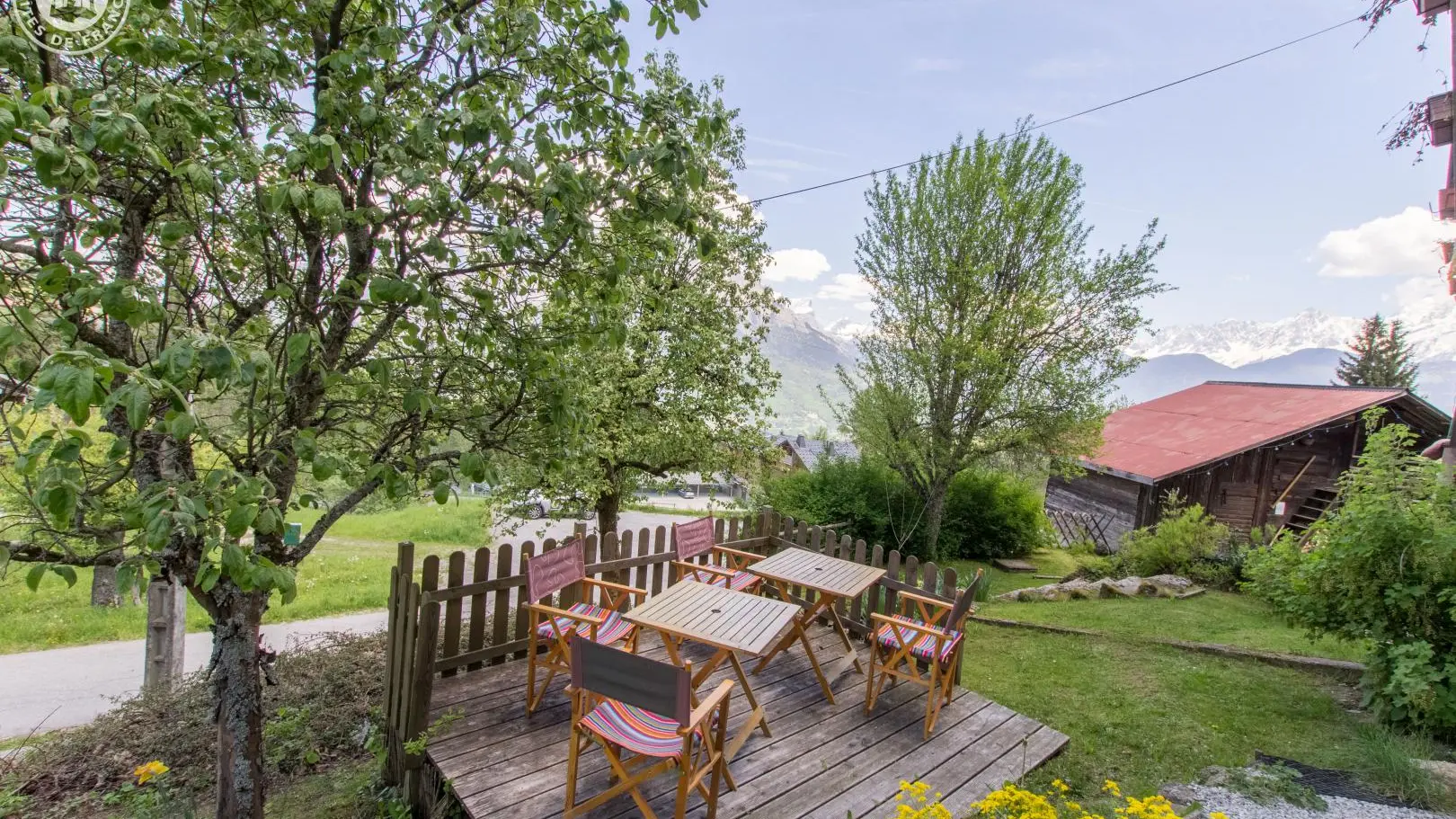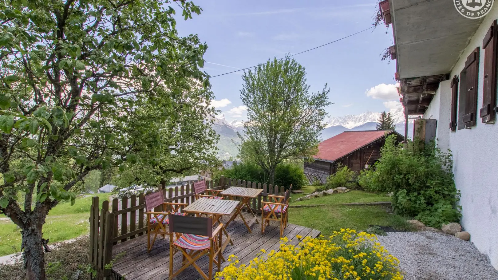 Wooden terrace with furniture and barbecue offering a beautiful view on the Mont Blanc massif, terrain. Internet wifi. Bed linen is provided.
