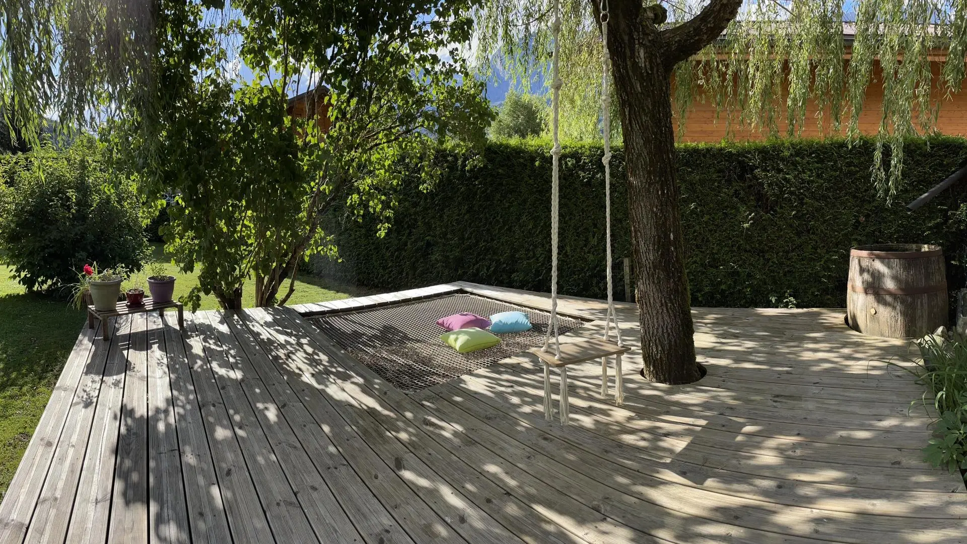 Large enclosed garden in front of the gite shared with the owners. Private terrace area with barbecue, parasol, forest table.