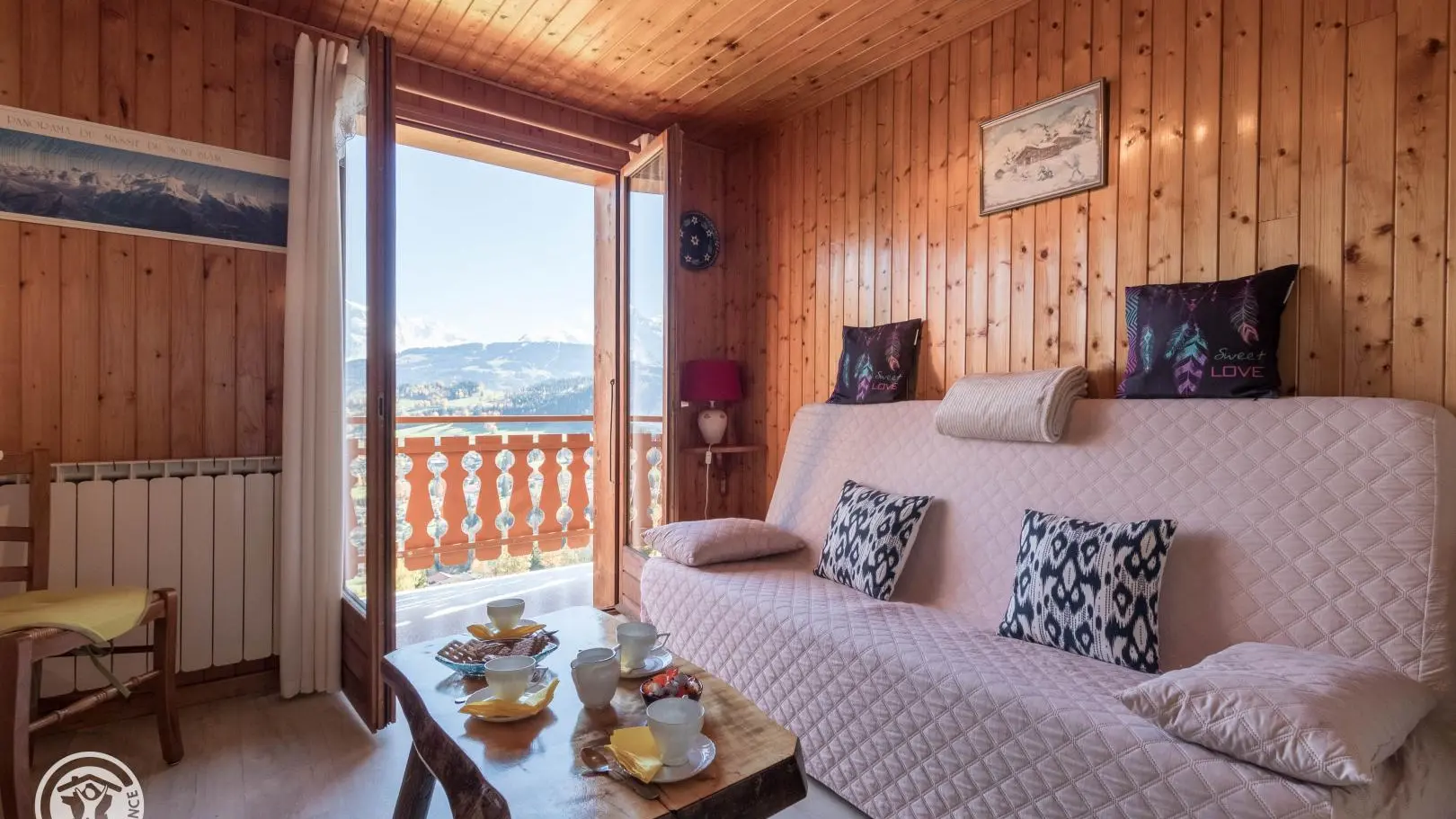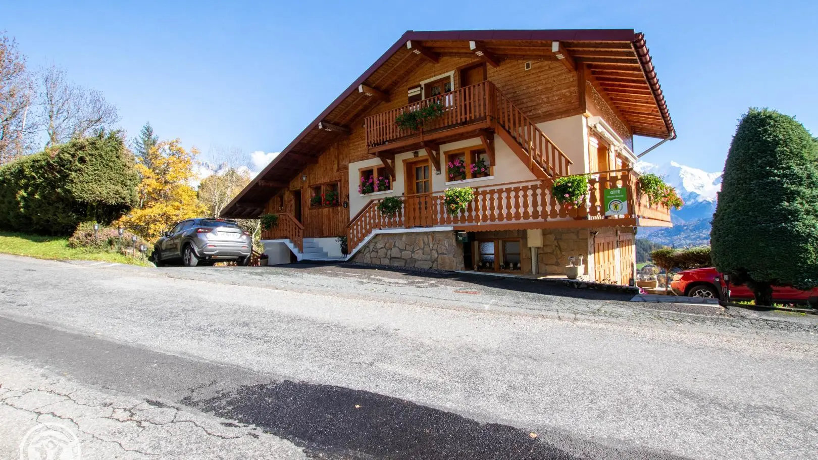 Overlooking the Vallée de l'Arve et mountain ranges (Mont-Blanc, Les Fiz), gîte (38m2) on raised ground floor of house also containing owners' home et another gîte. Kitchen, living room (double sofabed), bedroom (double bed), balcony, shower room, WC. Central heating. Shared terrace, garden furniture, barbecue, courtyard. Shared washing m/c. Ski areas: Cordon 2km, Megève 8km (La Princesse, Le Jaillet, Rochebrune). Shuttle 1km. Many hiking/riding tracks from the doorstep. Panoramic view.