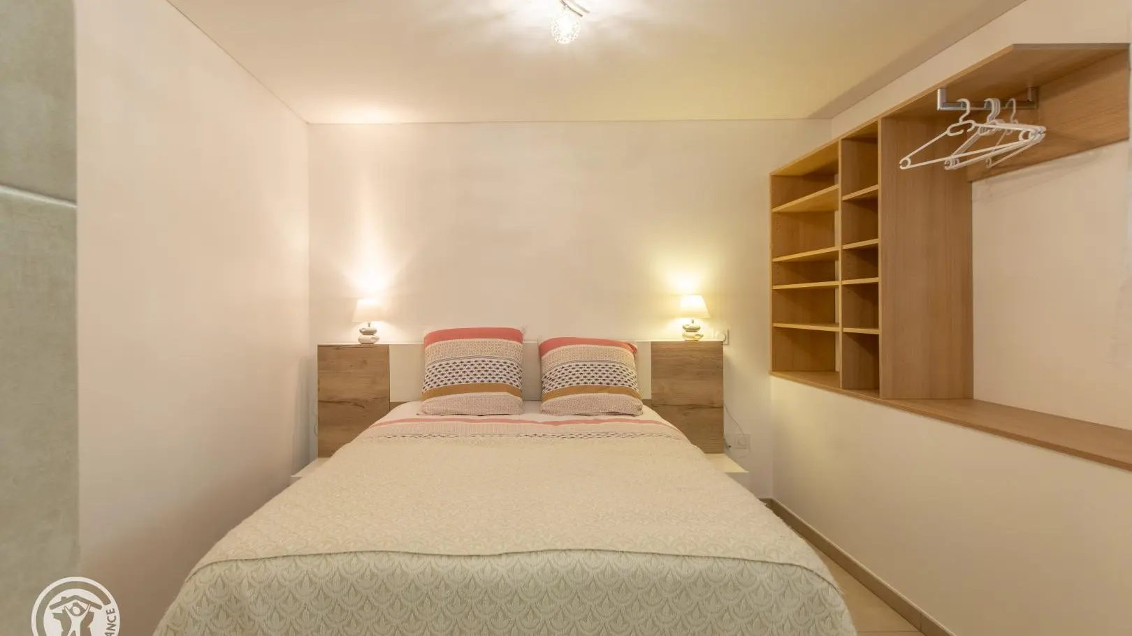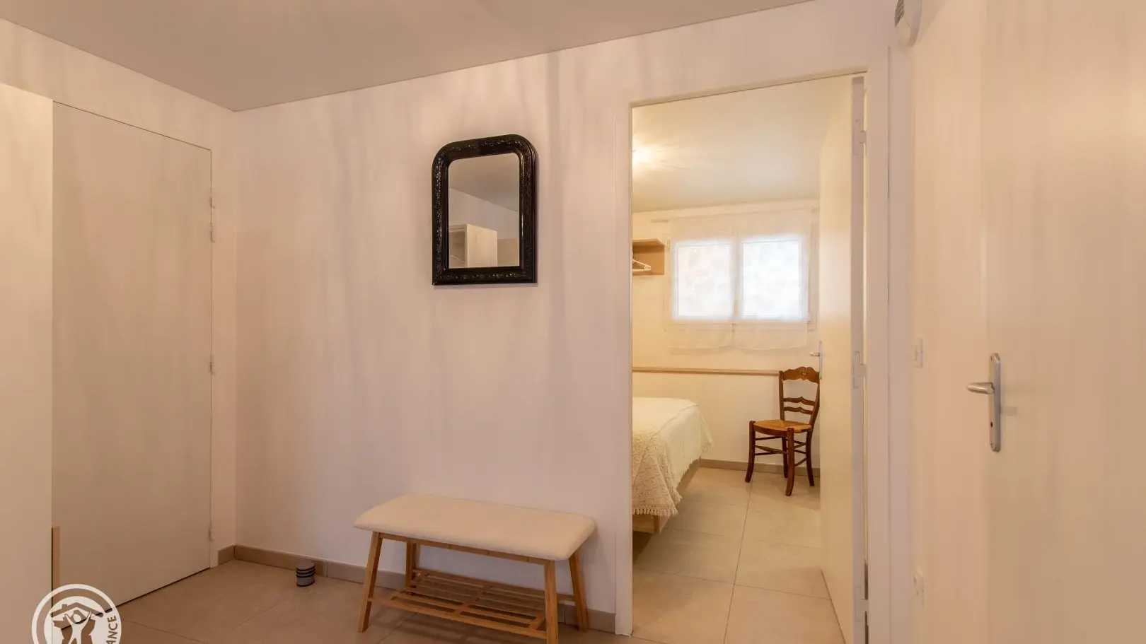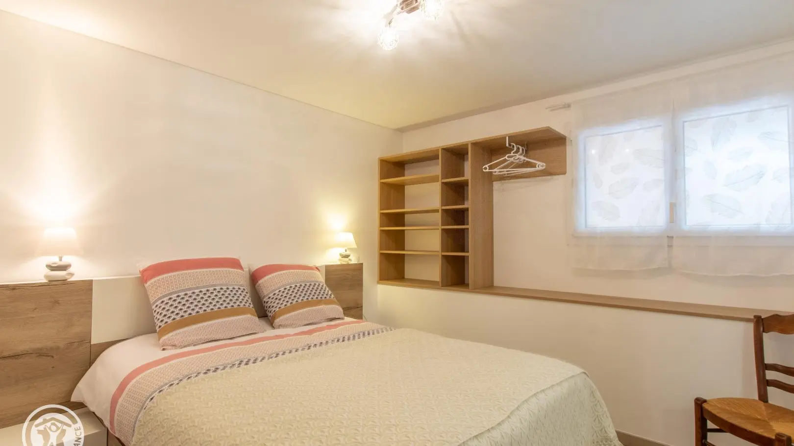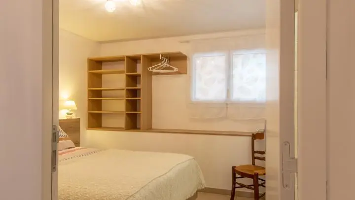 Bedroom 1 (90x200 cm bed, open wardrobe) with access to the bathroom without door (washbasin on cabinet, shower). Independent WC.