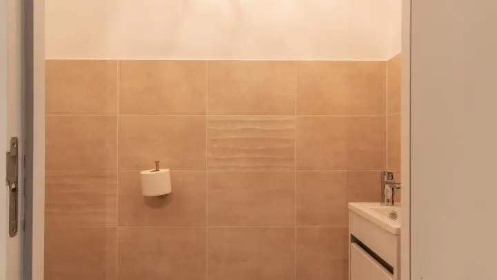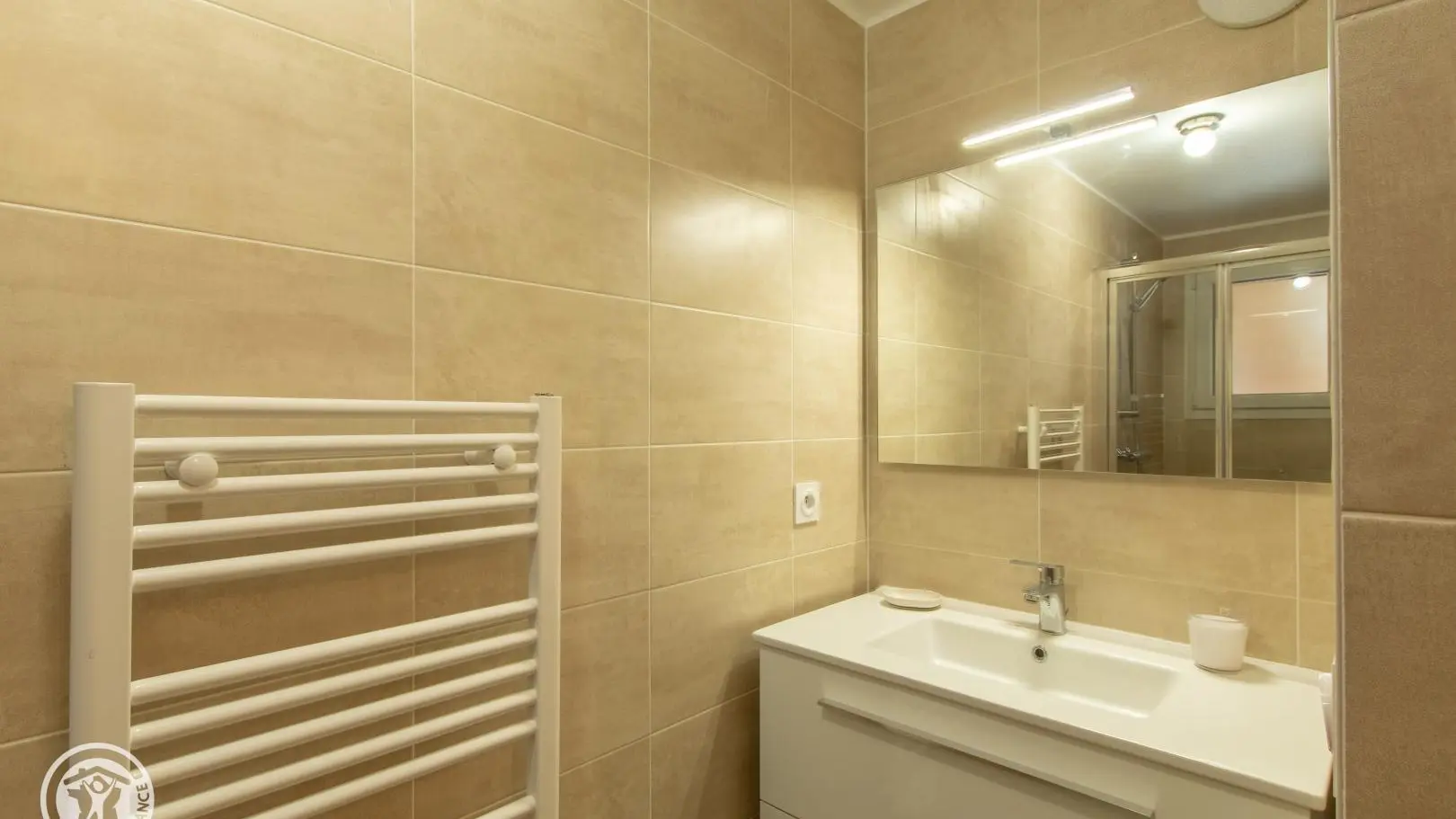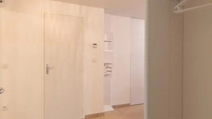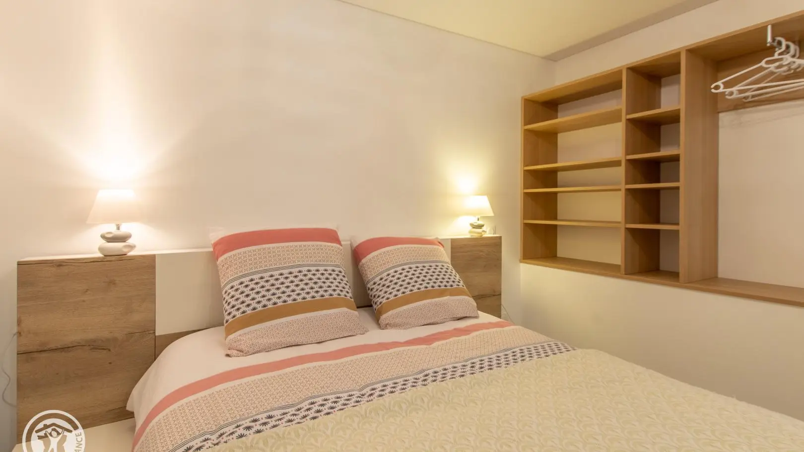 Bedroom 1 (90x200 cm bed, open wardrobe) with access to the bathroom without door (washbasin on cabinet, shower). Independent WC.