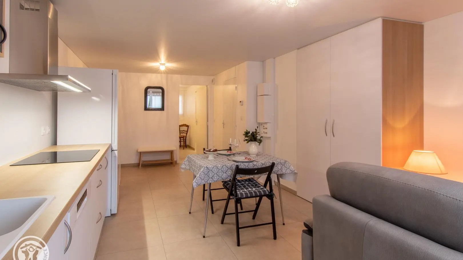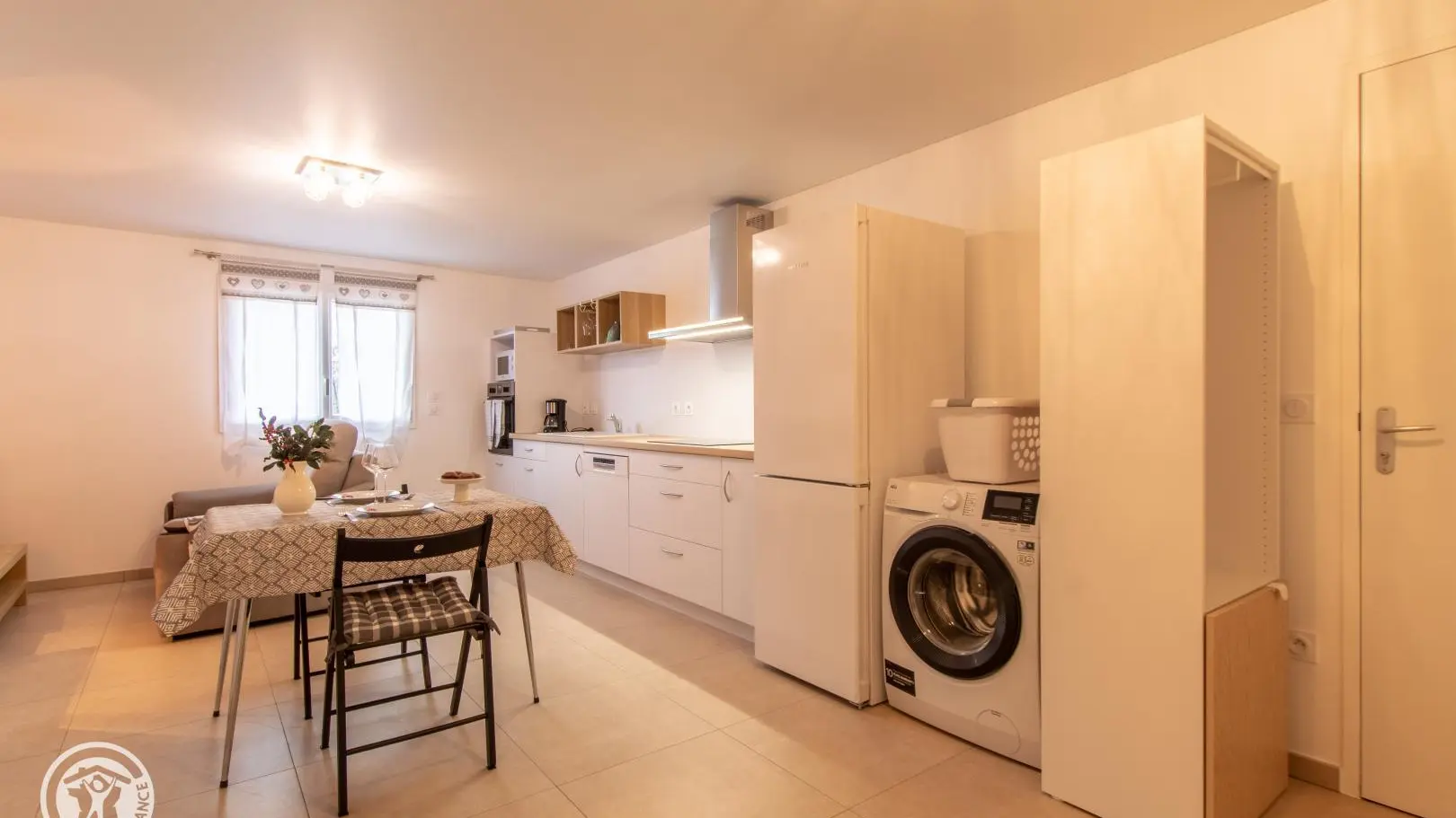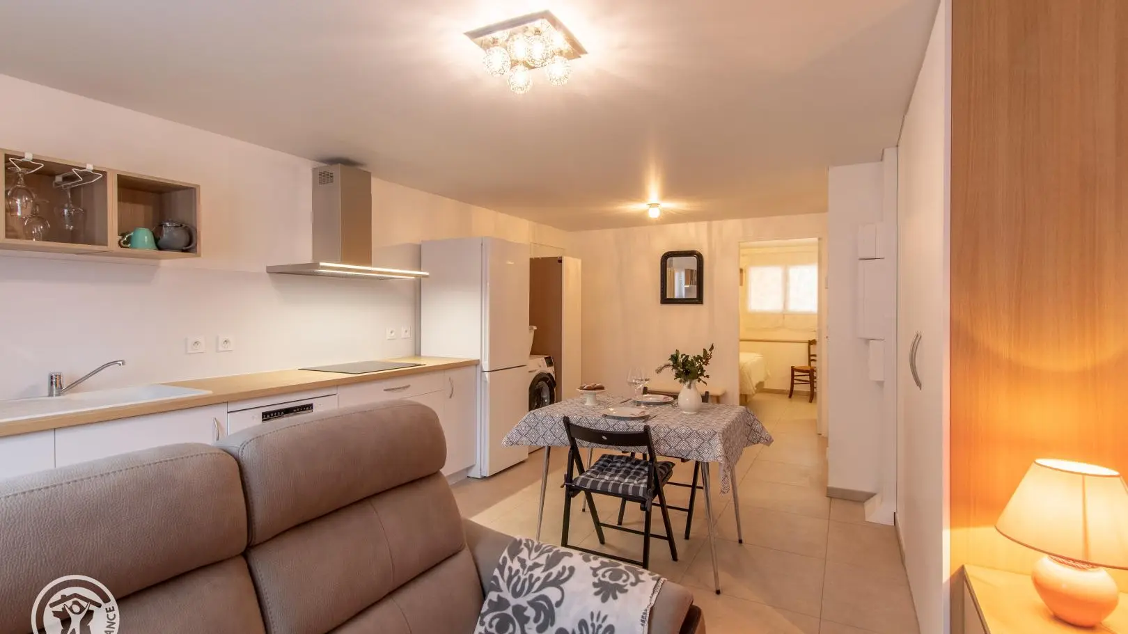Access via living room with fitted kitchen opening onto a lounge area (sofa, TV on furniture). Dining table for 2 people. Washing machine.