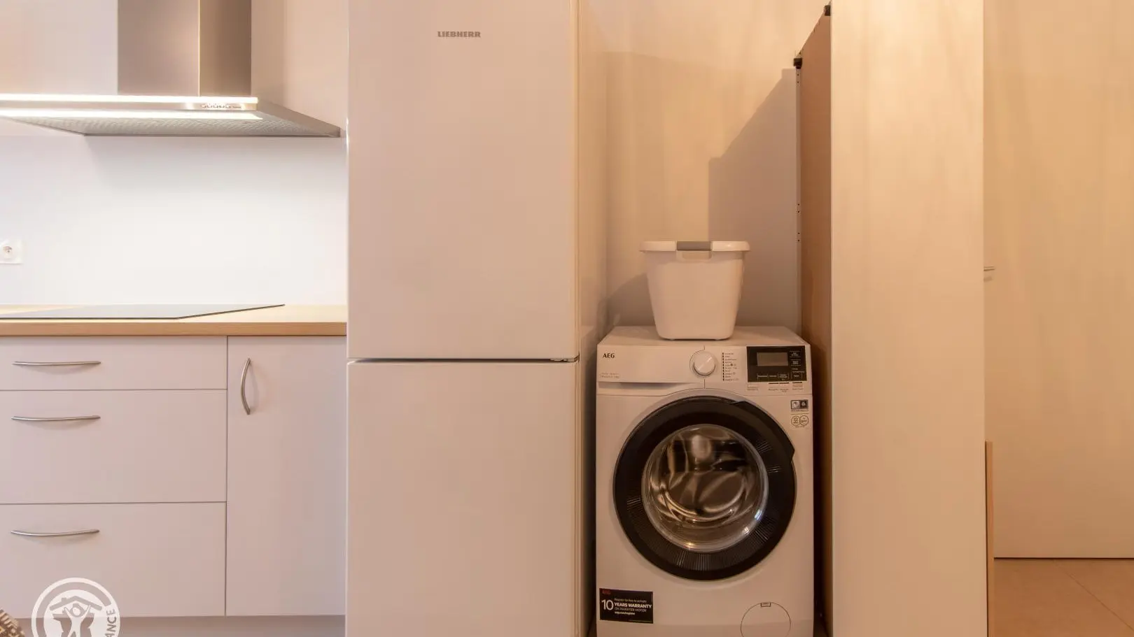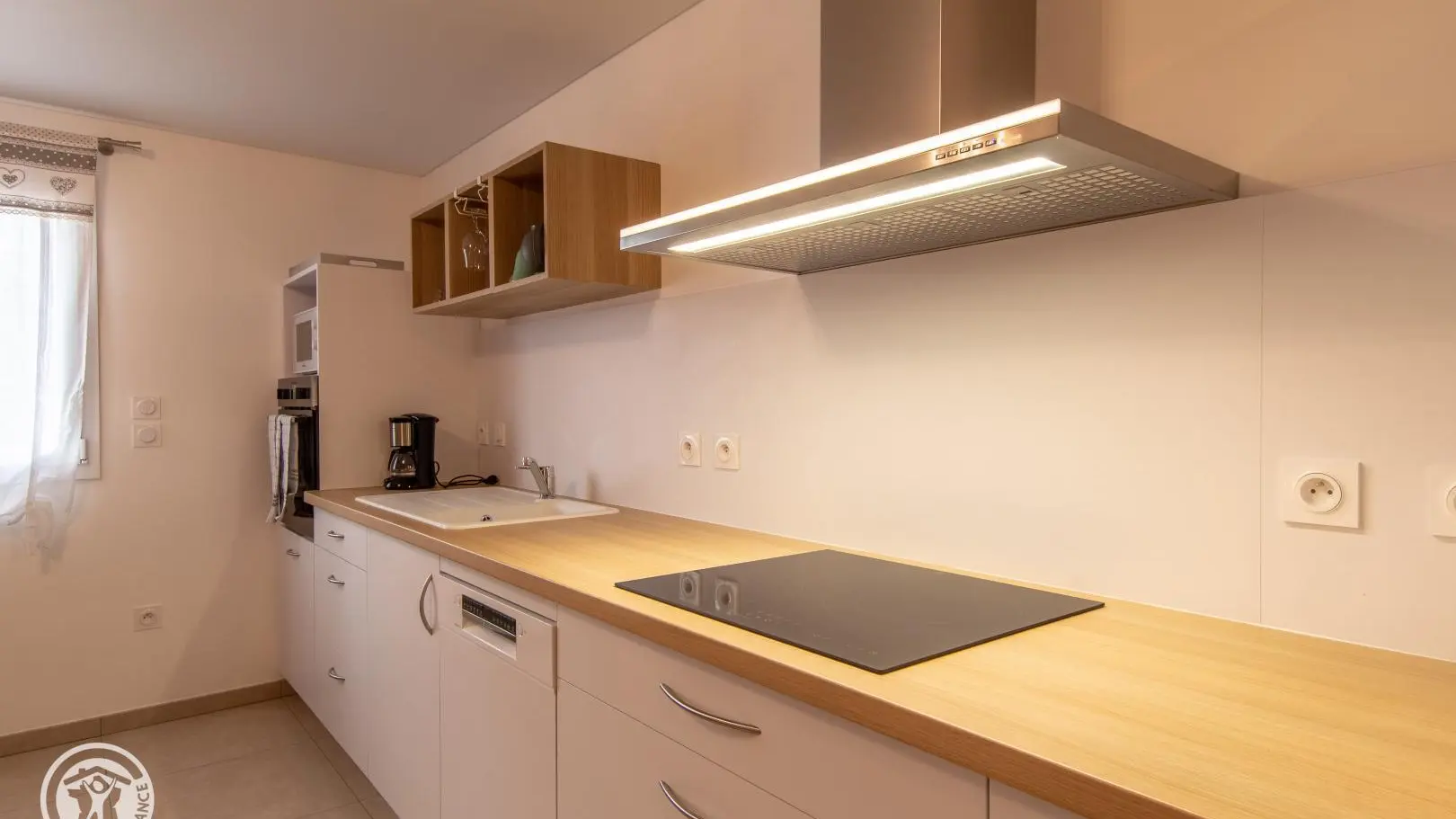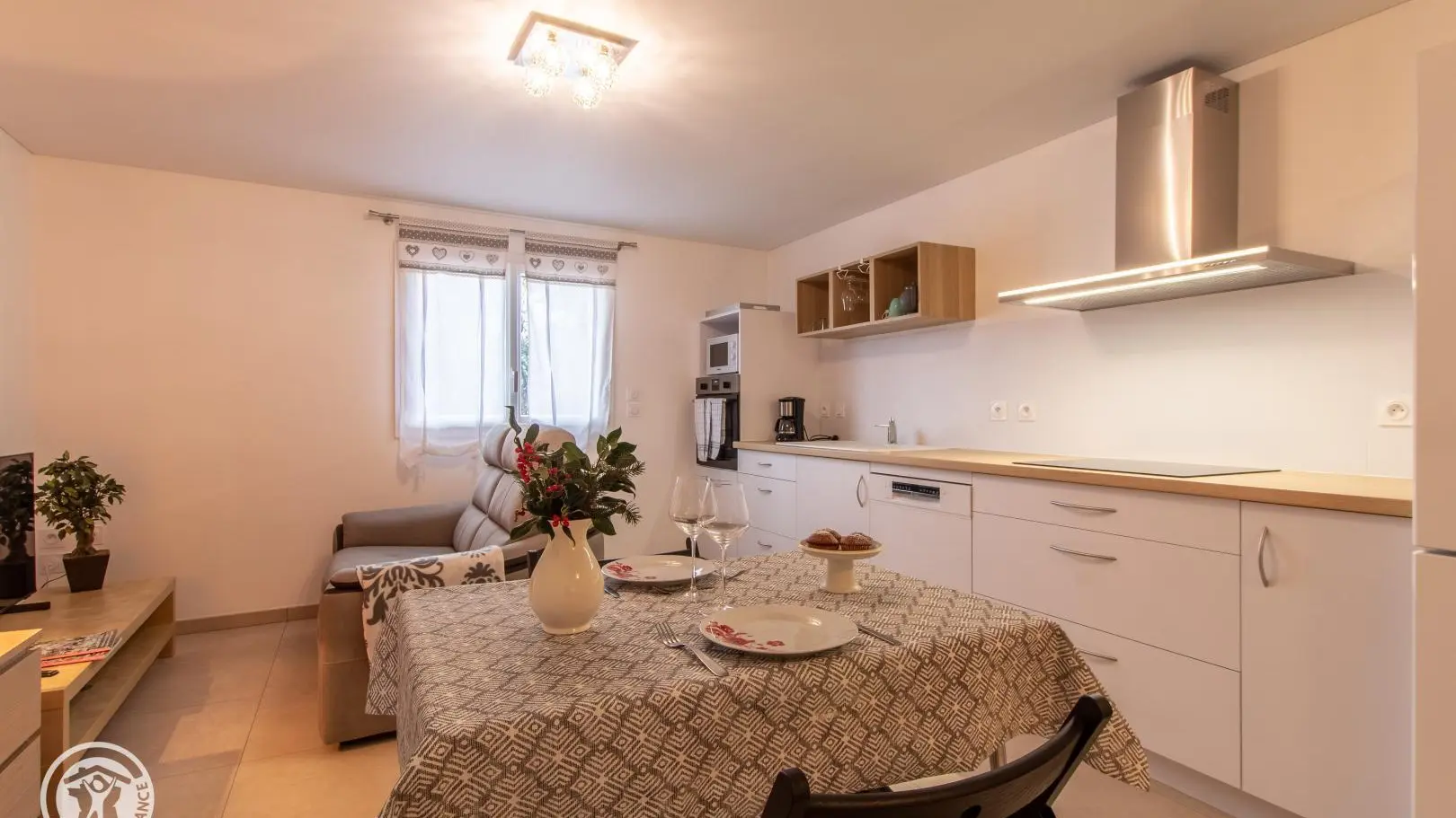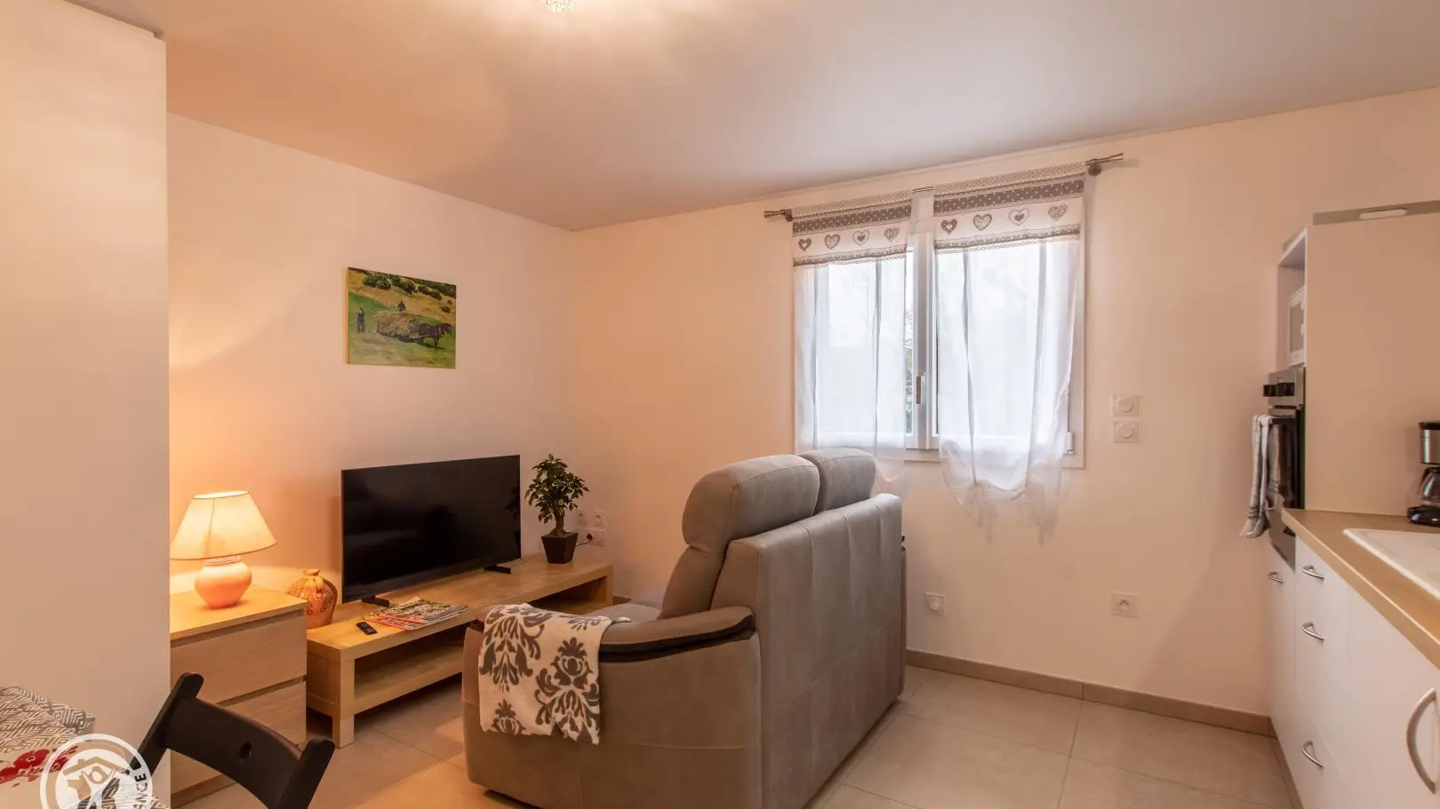 Access via living room with fitted kitchen opening onto a lounge area (sofa, TV on furniture). Dining table for 2 people. Washing machine.
