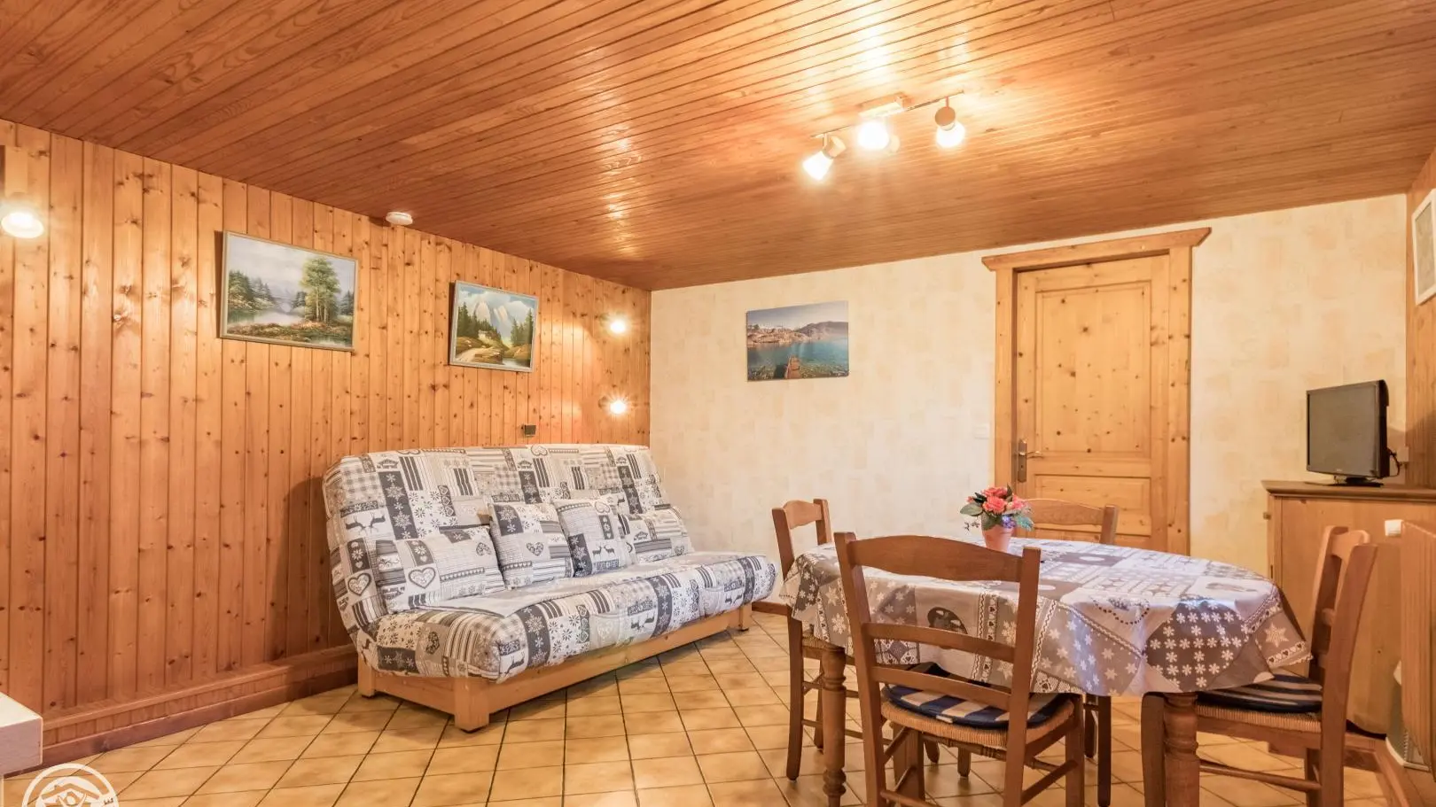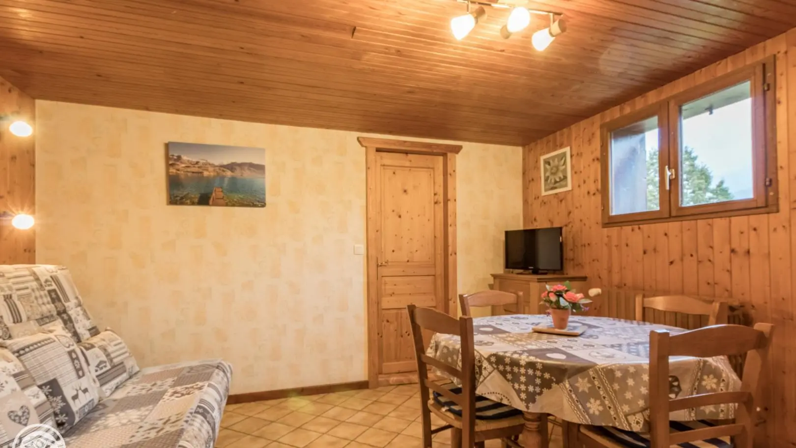 Opposite mountains (Le Sulens, La Tournette), house comprising 2 gîtes & owners' home. Gîte 2 (36m2) at garden level: kitchen opening onto living room (double sofabed), 1 bedroom (2 single beds), bathroom/WC. Electric heating. Shared garden (garden furniture, barbecue). 10% reduction for stays of 3 weeks. For hire: bed linen. Equipment storage. Gîte situated on road leading to village. La Croix-Fry/Merdassier ski area linked to La Clusaz 7km. Cross-country skiing, snow-shoeing, ski trekking, footpaths. Day nursery, shops 200m. Free shuttle 100m. Thônes 6km (swimming pool, tennis, cinema, museum).