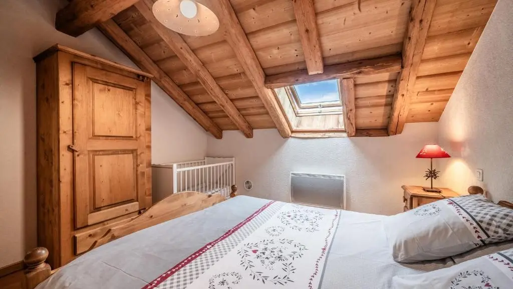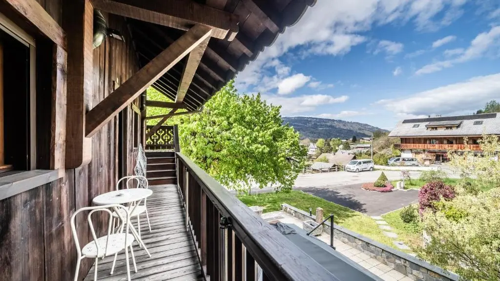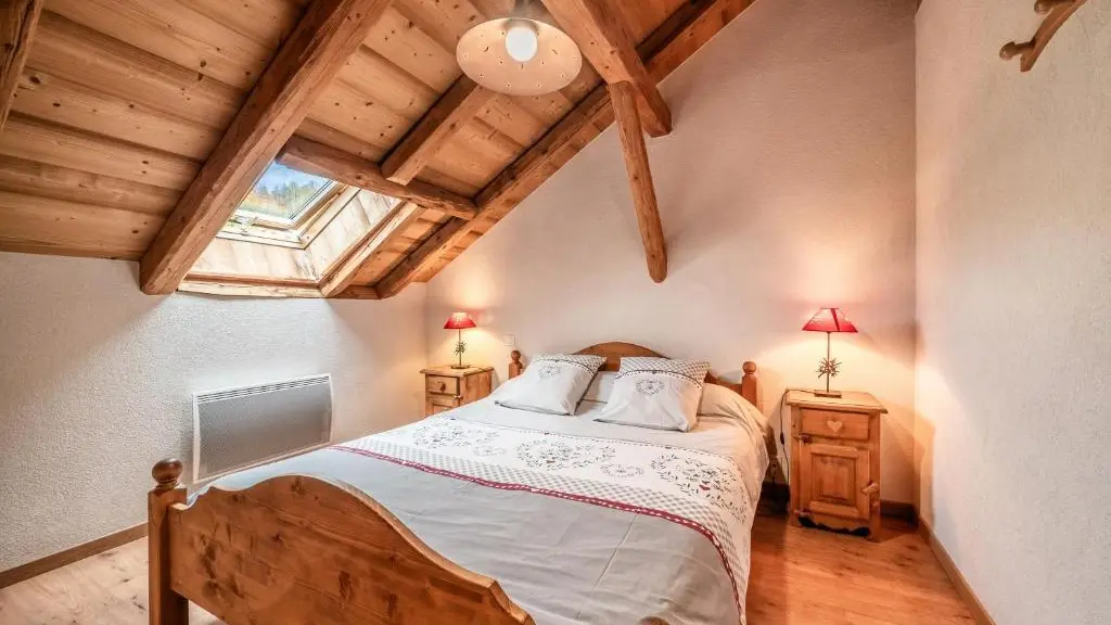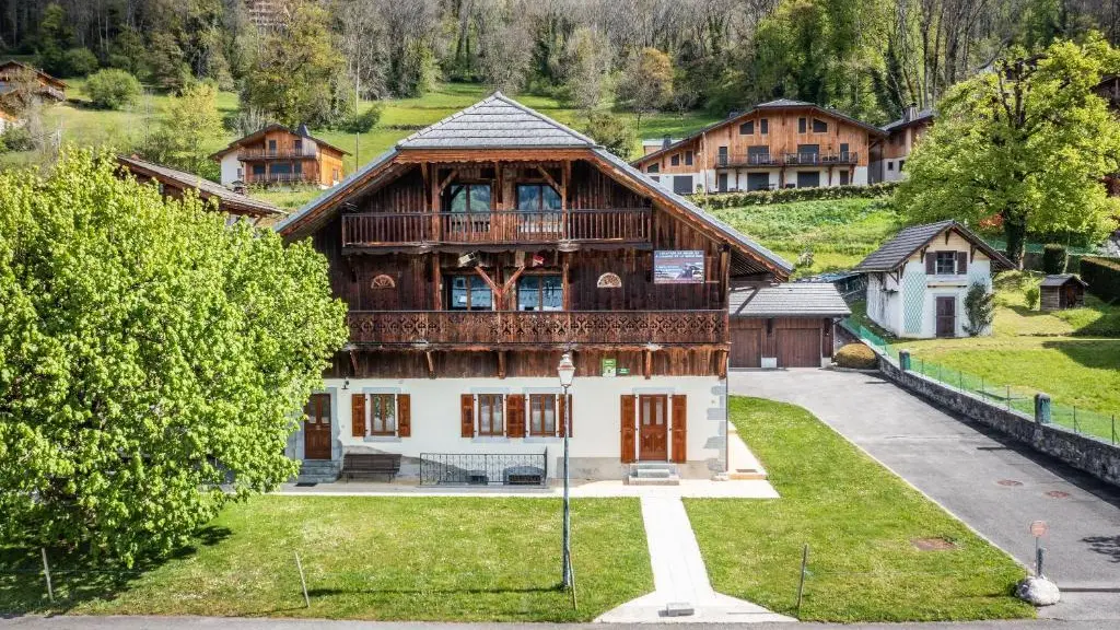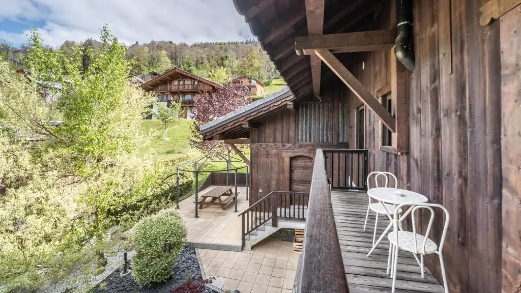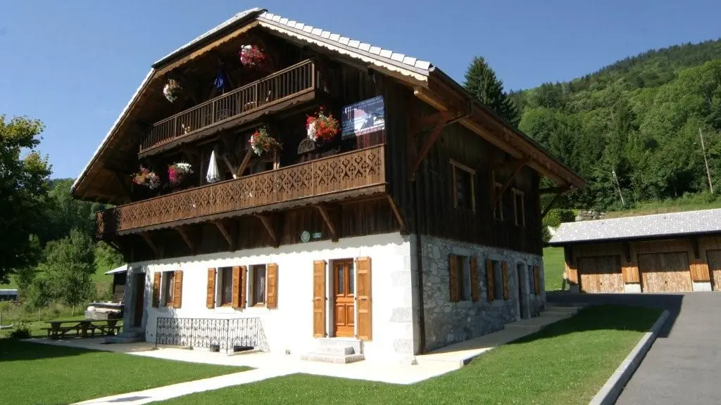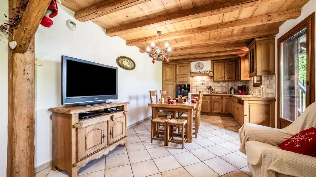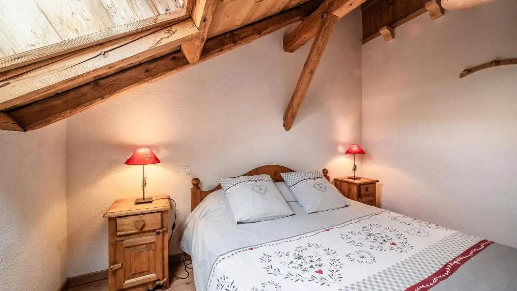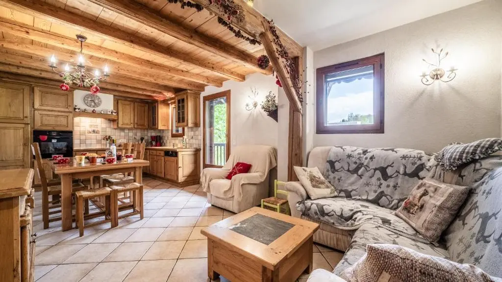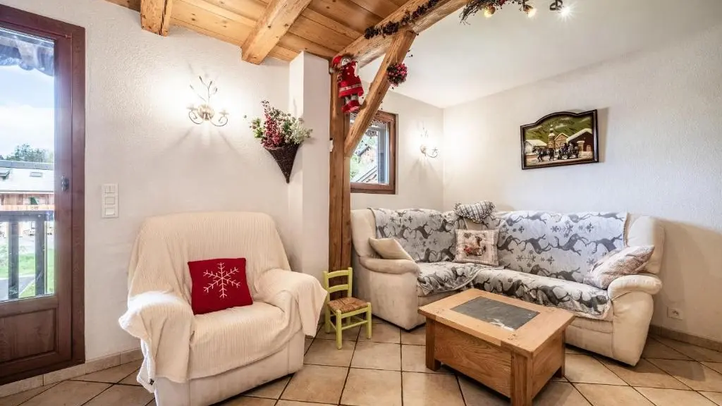 250m from village centre et 1km from Le Grand Massif Express (cable-car), superb 2-level gîte (67m2) on 1st floor of old traditional farmhouse also containing 3 other gîtes. Entrance hall, fitted kitchen (microwave) opening onto living room (flat screen satellite TV, DVD player), access to balcony, bedroom 1 (double bed), shower room/WC. Upper level: bedroom 2 (double bed), bedroom 3 (beds: 1 single, 2 bunk), bathroom (washing m/c, tumble-drier). Beds made on arrival, bed linen supplied, housework included in rent. Central heating. Private garage, storage for skis shoes. Garden (shared barbecue). Extra charge for pets. Leisure centre 1km.