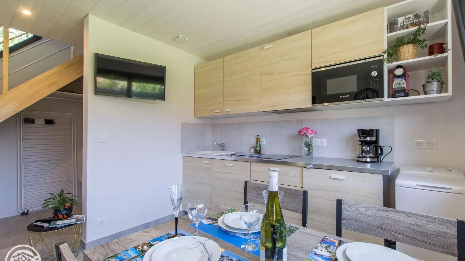 Ground floor: kitchen open to living room (television, sofa bed), separate toilet. Washing machine.