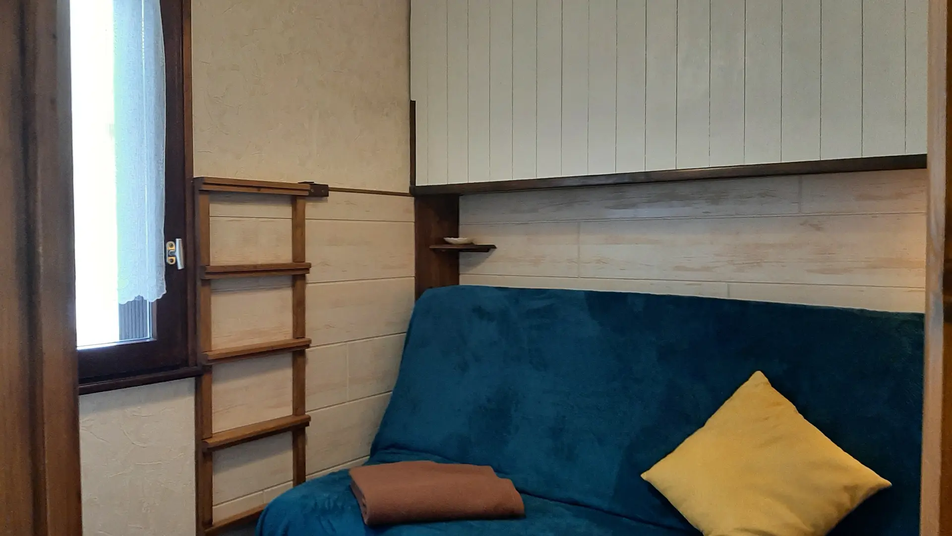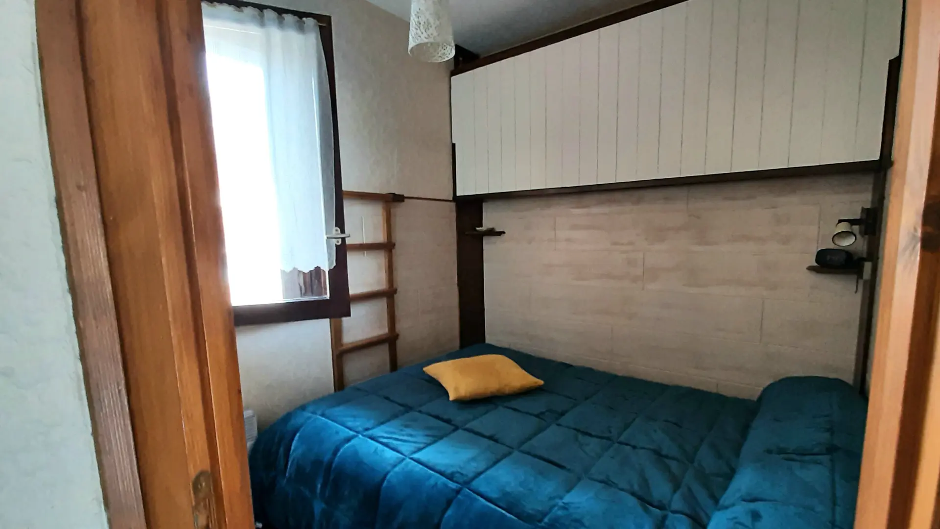 Small mountain-style bedroom (window facing West): double convertible bed (140cm quality mattress), plus an overhead fold-out bunk bed suitable for a child over 6