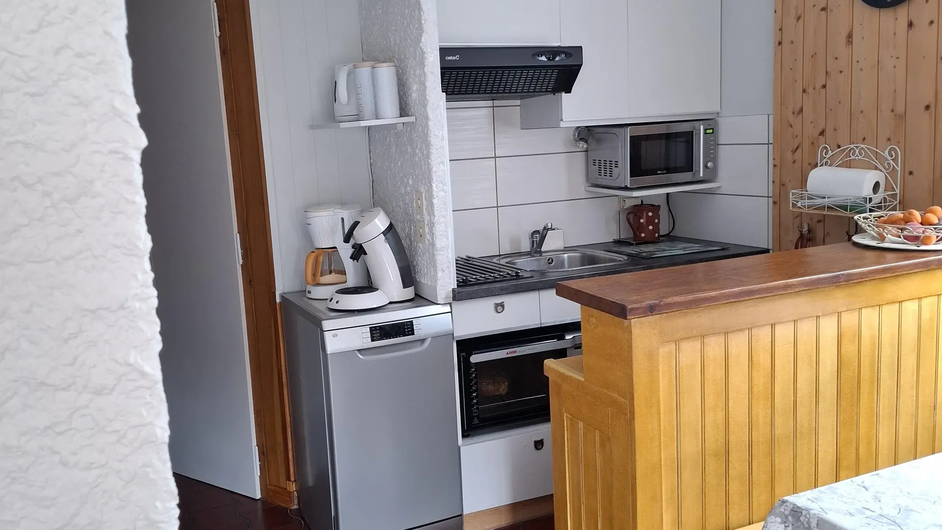 Fully equipped open kitchen: dishwasher, oven, microwave, vitroceramic hob, full range of small appliances, fondue and raclette sets, cookware and tableware