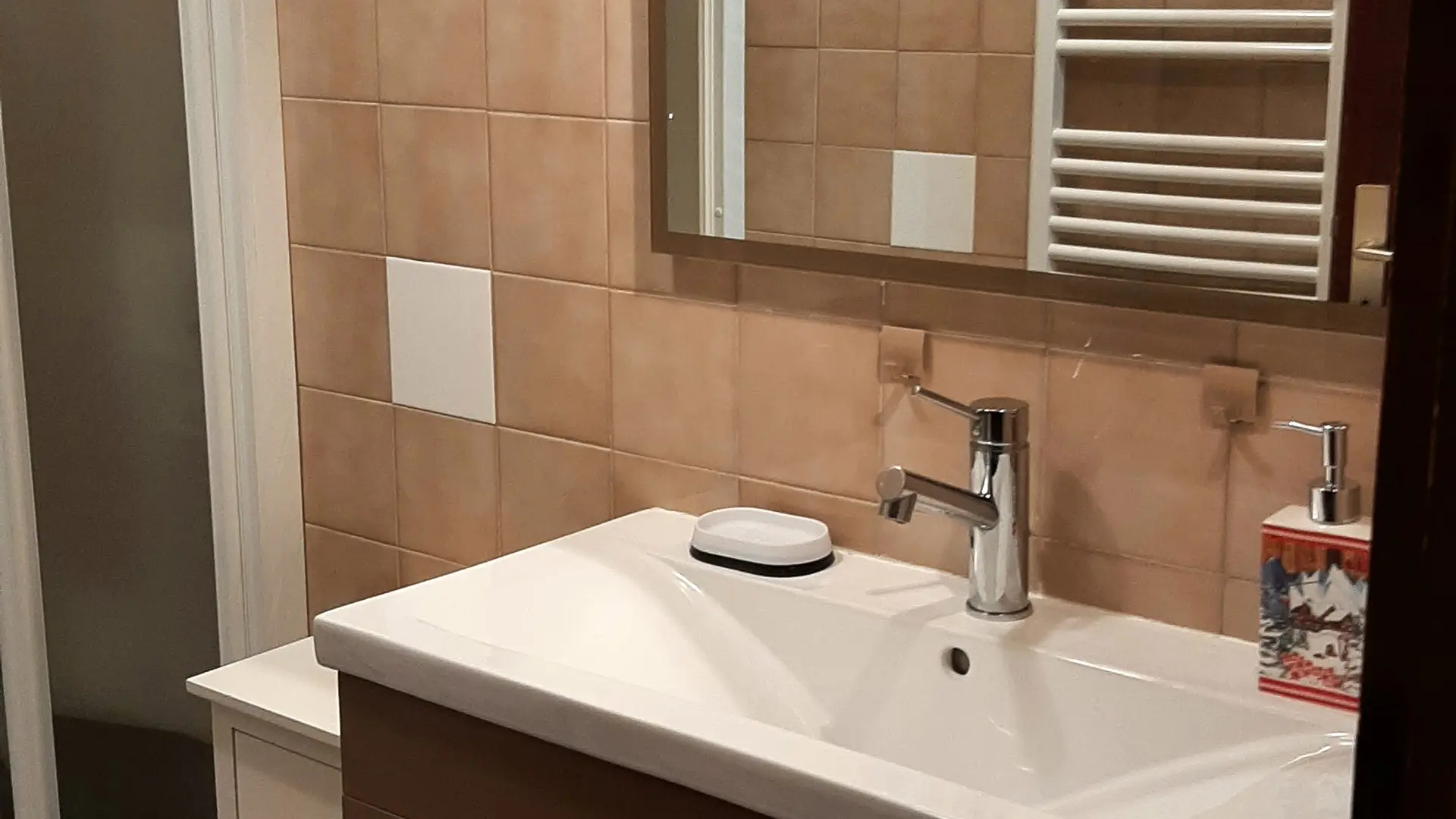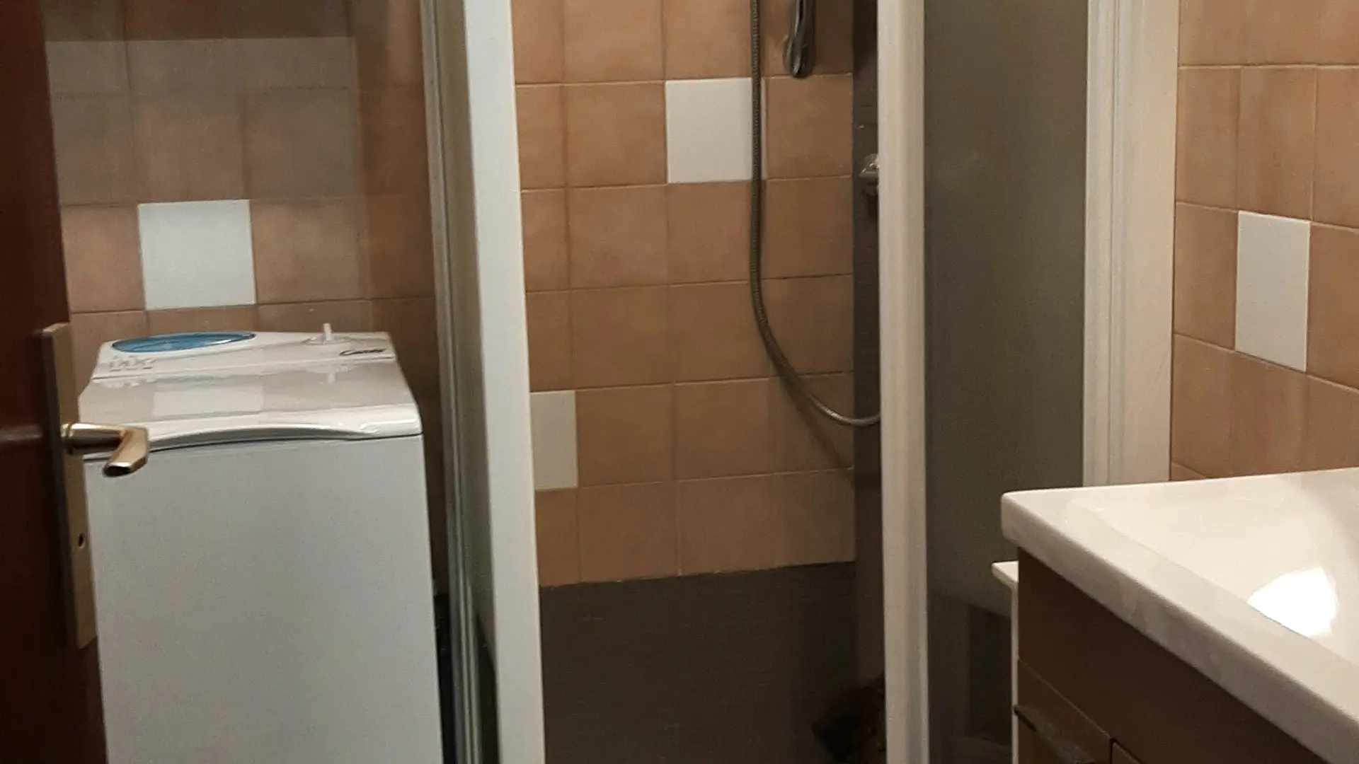 Bathroom: shower cabin, vanity with sink, towel heater, washing machine, hairdryer