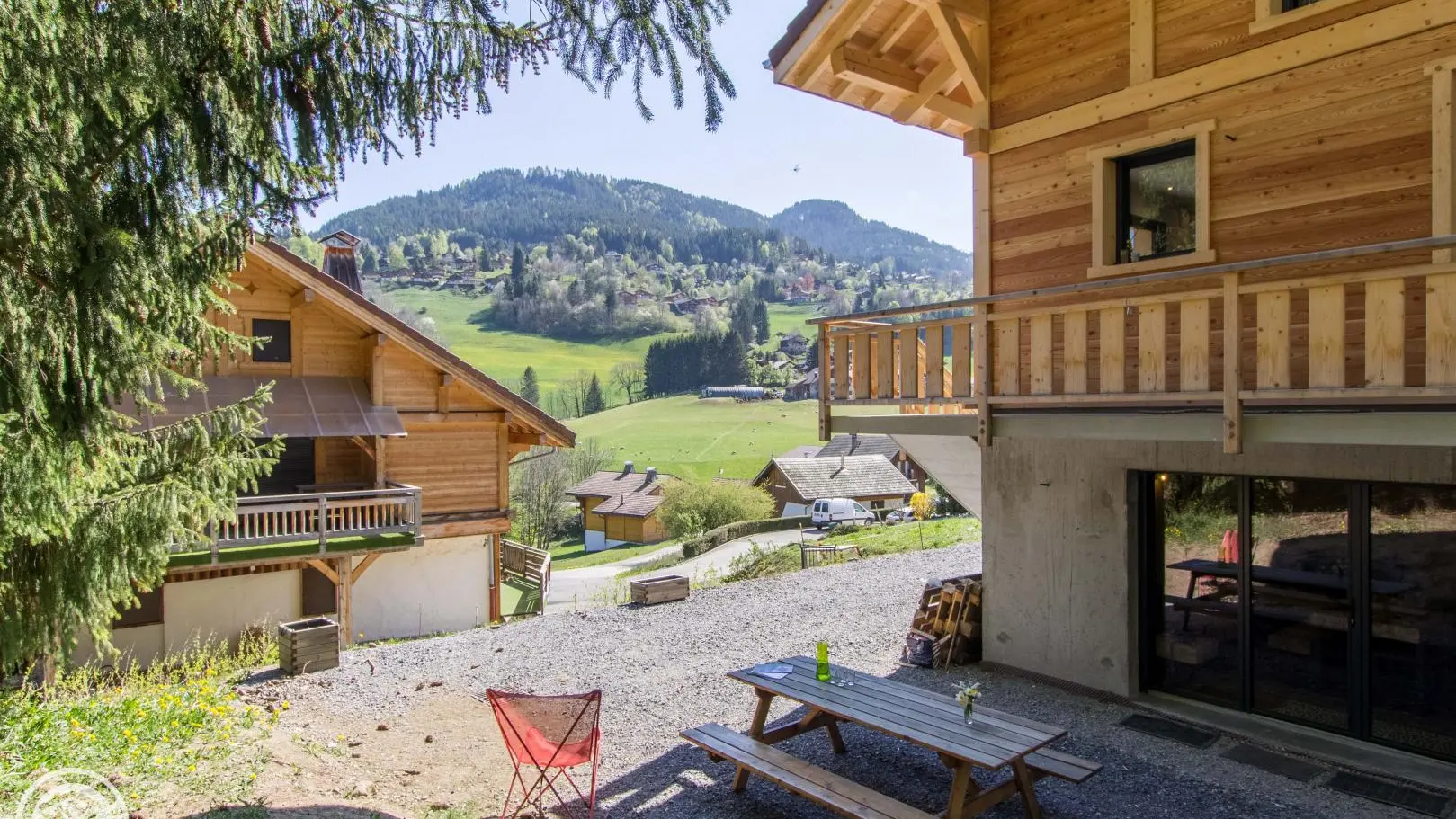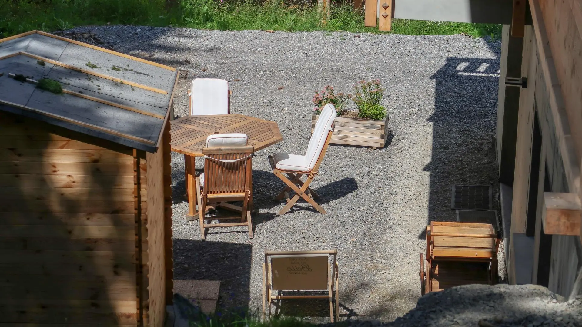 Private terrace in front of the gîte with garden furniture, deckchairs, barbecue, garden shed for the gîte (storage of skis, bikes, etc.). Common land with the owners around the chalet. Parking on the property.