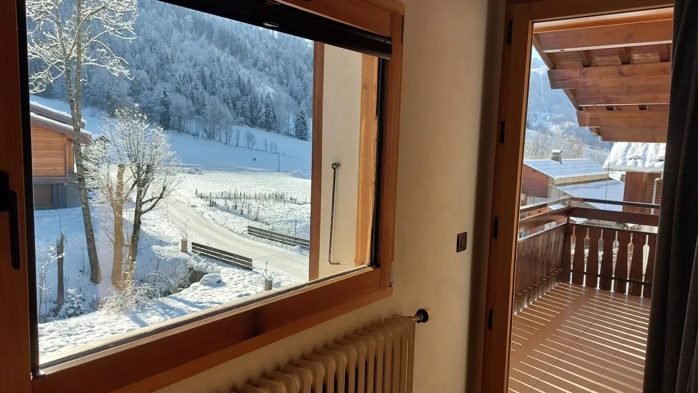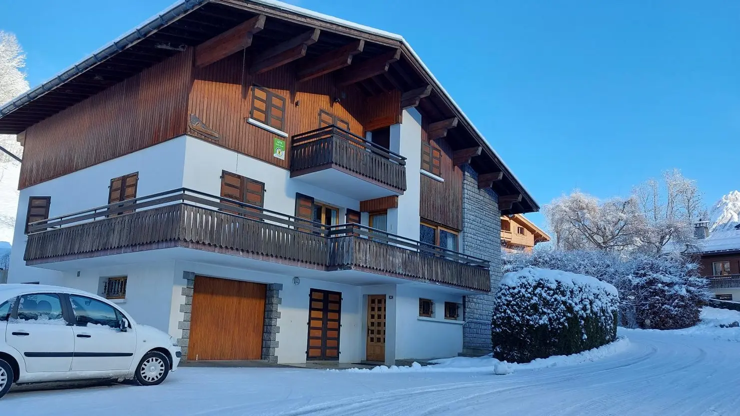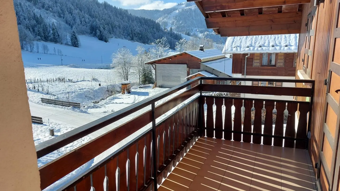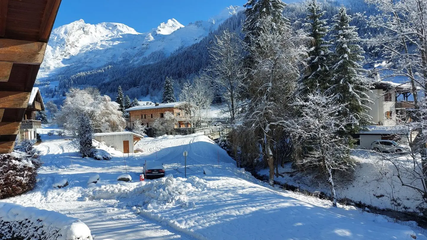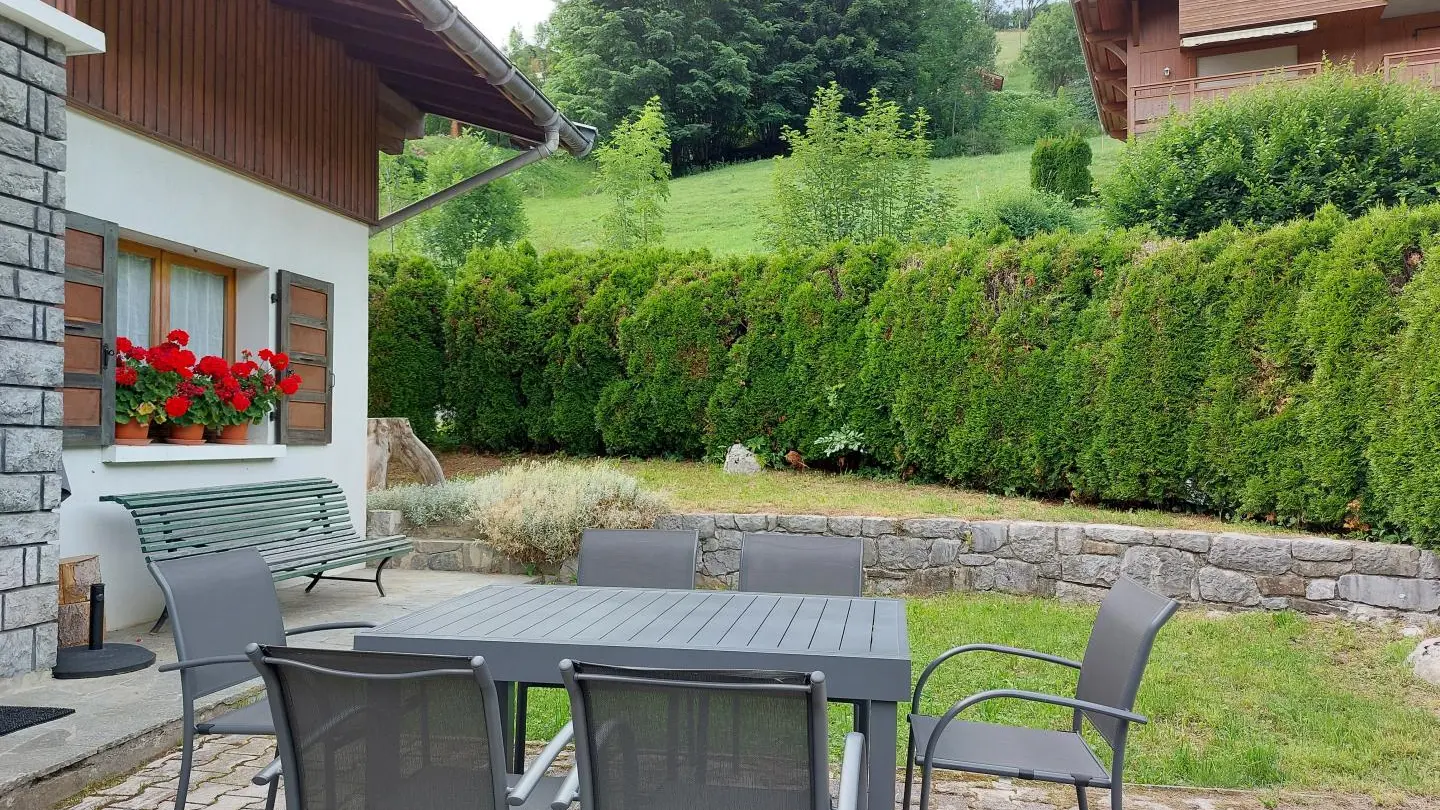 Small south-facing balcony with beautiful view of the mountains + garden on the side of the house (common space, 1st floor level), garden furniture, barbecue. Private parking on site. Local skis / bikes.