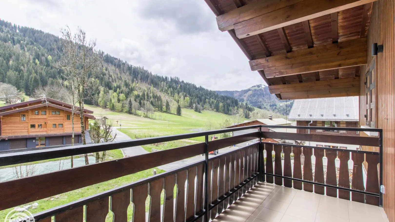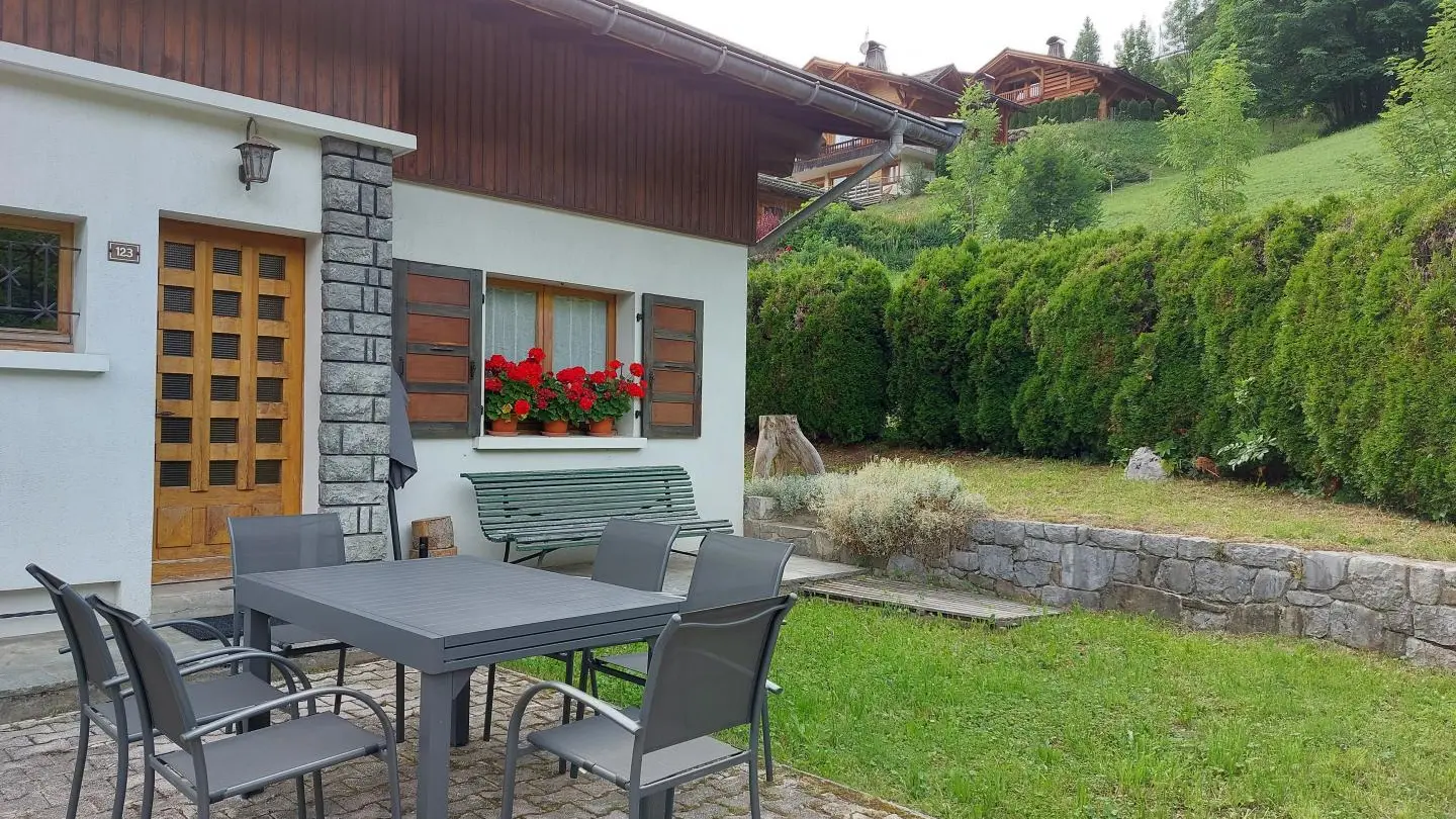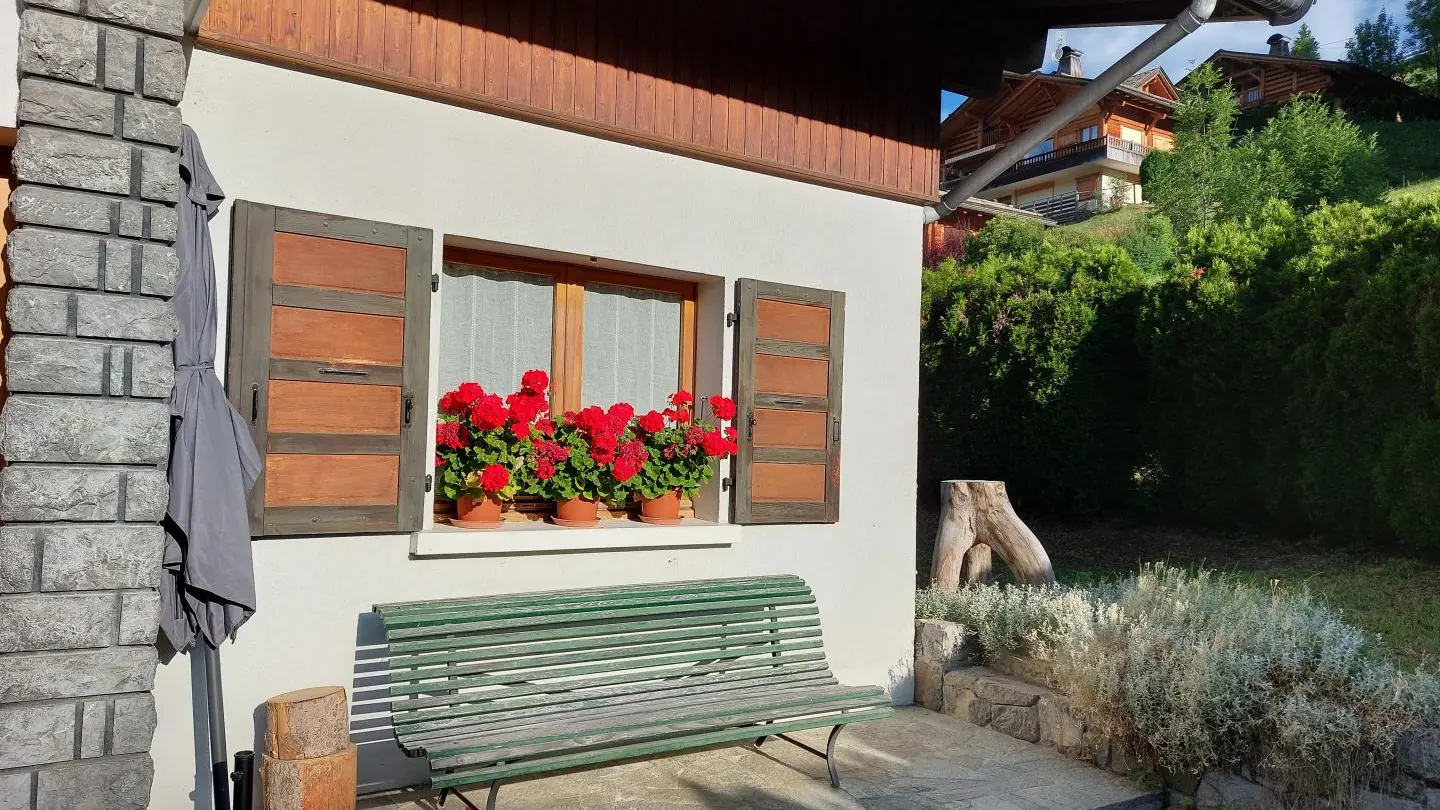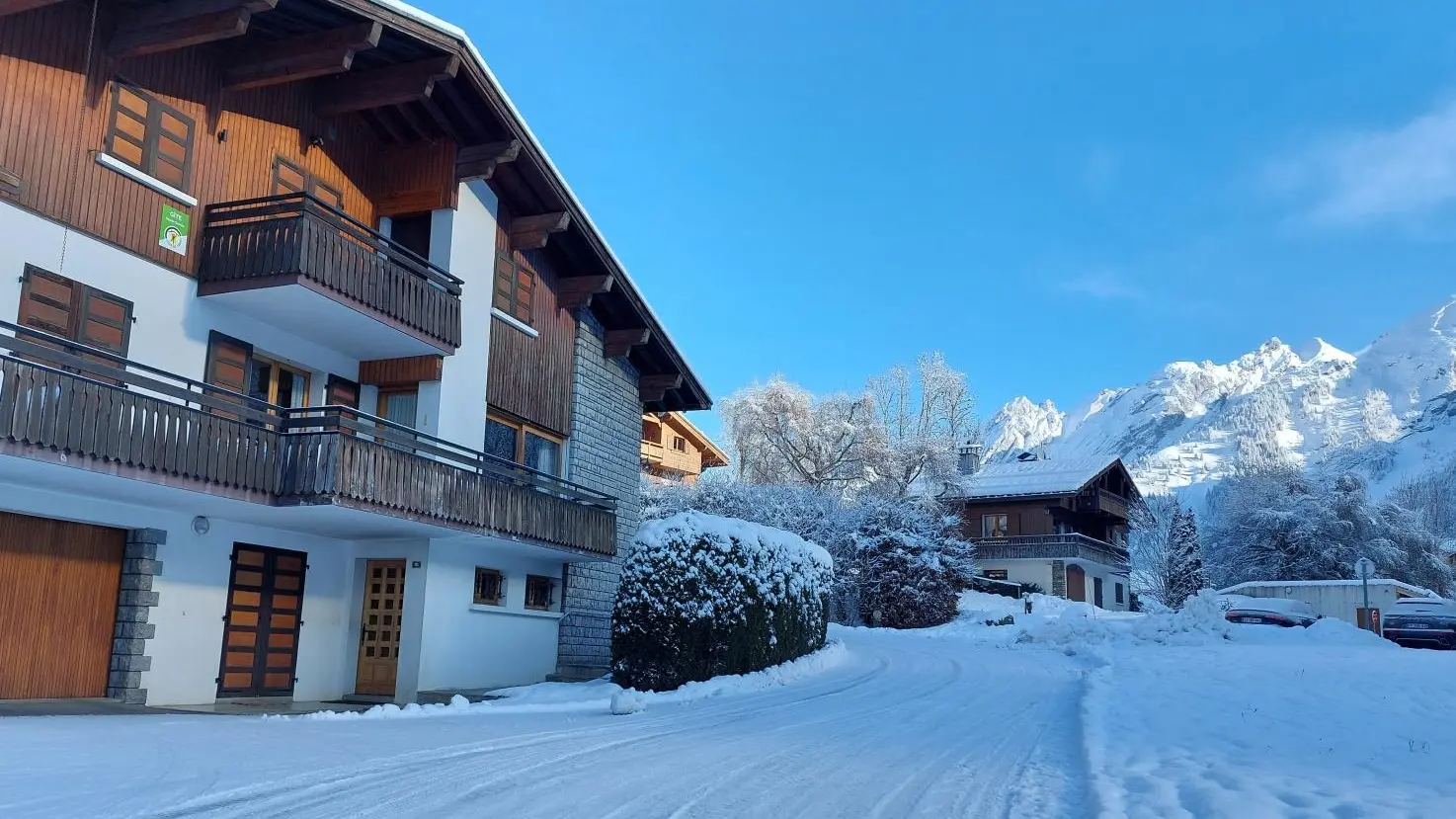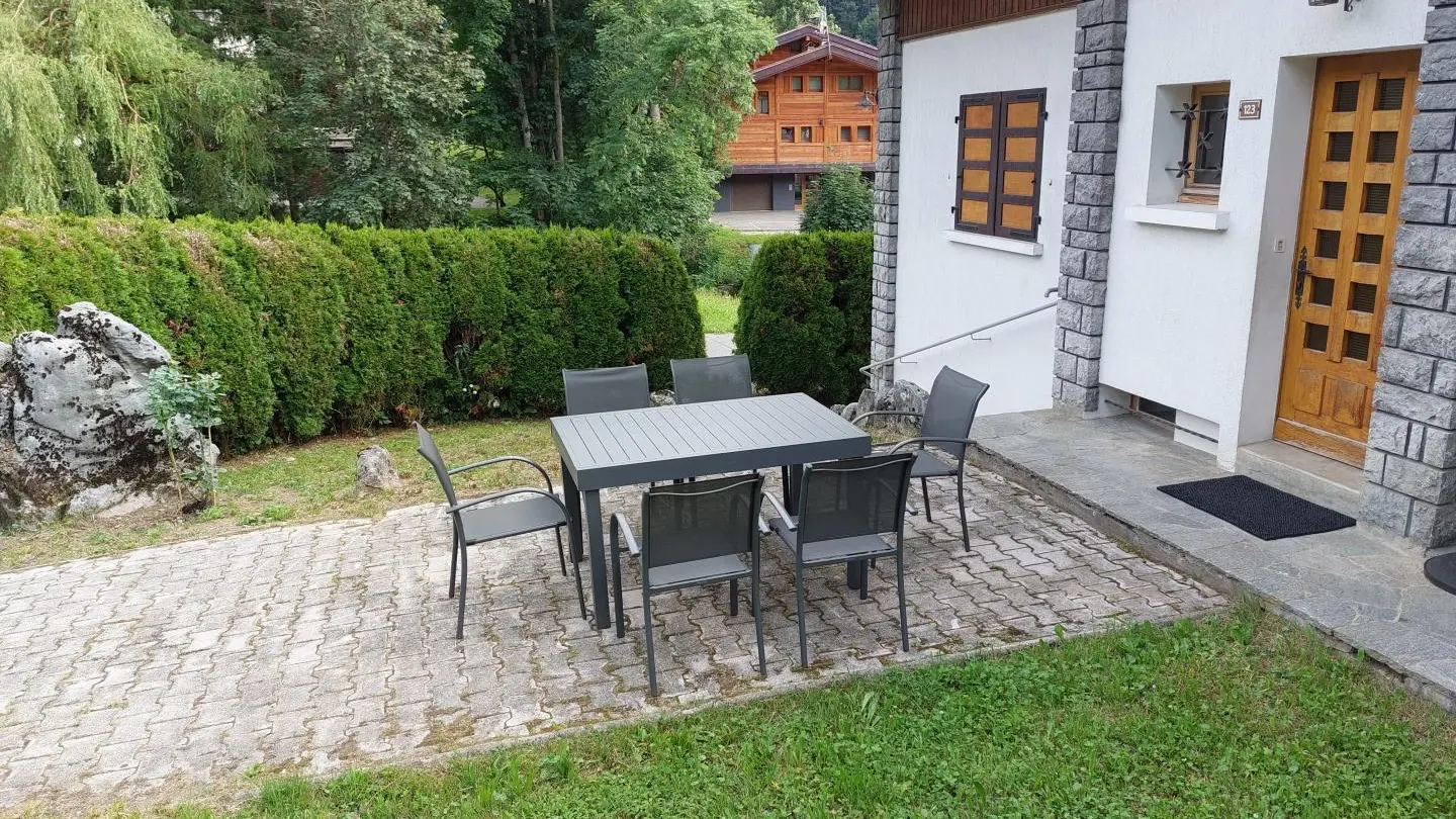Small south-facing balcony with beautiful view of the mountains + garden on the side of the house (common space, 1st floor level), garden furniture, barbecue. Private parking on site. Local skis / bikes.