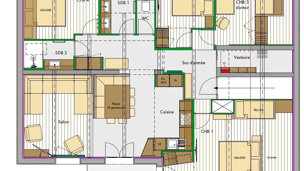 4 bedrooms: bedroom 1 (1 bed 160x200cm), bedroom 2 (1 bed 140x190cm), bedroom 3 with sloping ceilings (2 beds 90x190cm), bedroom 4 (3 beds 80x190cm including 2 that can be combined to create 1 double bed).