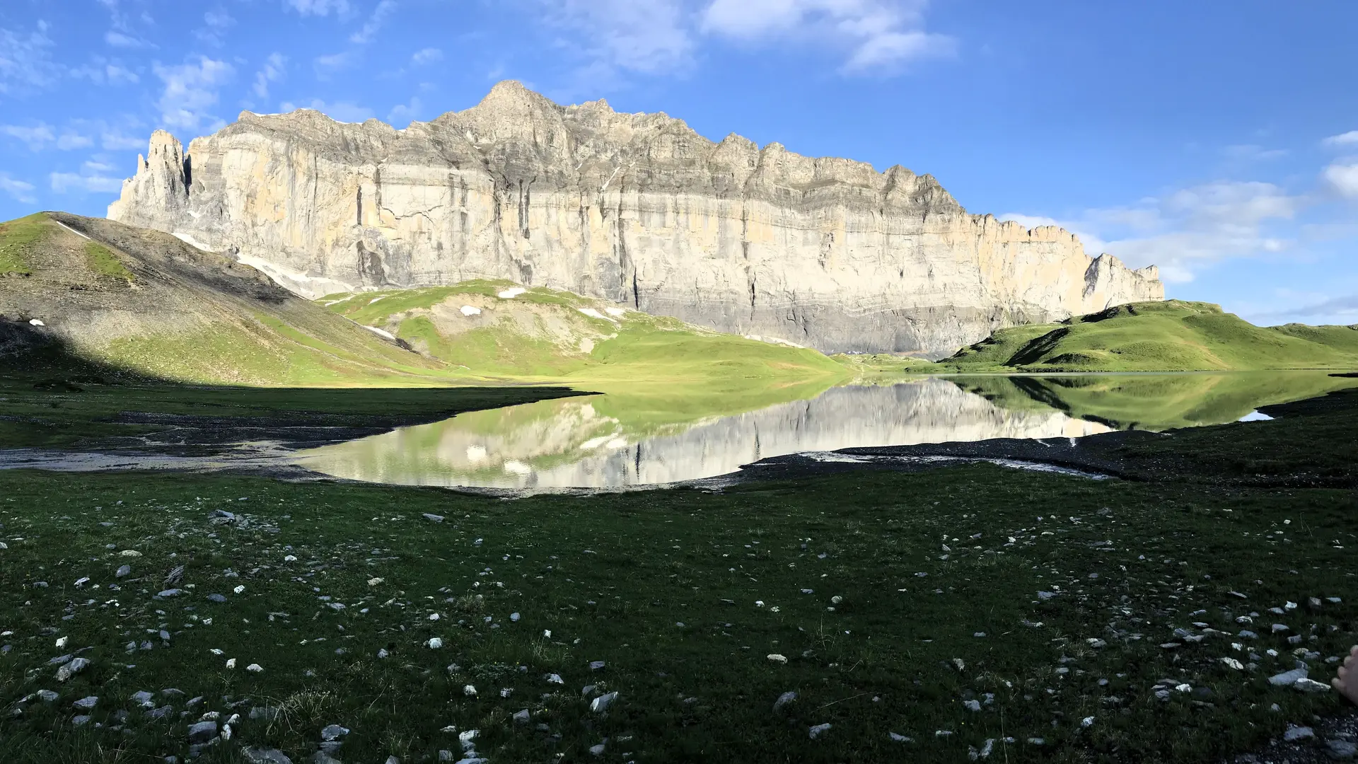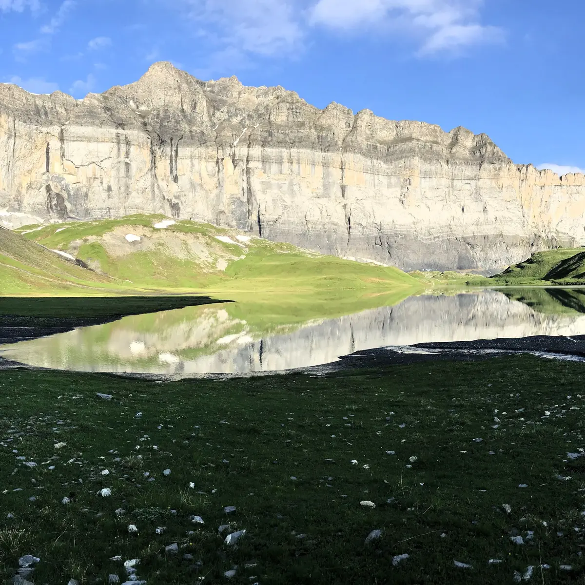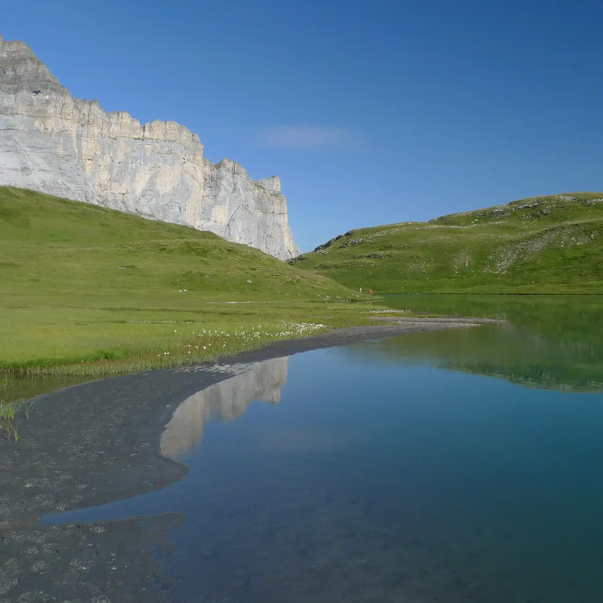 With a surface area of around 10 hectares, it lies at the bottom of a cirque bordered by peaks, to the north of the Fiz cliff. Surrounded by alpine meadows, the environment appears rather wild, but nevertheless populated by marmots, ptarmigan and ibex.
