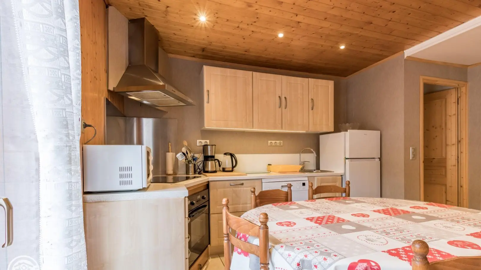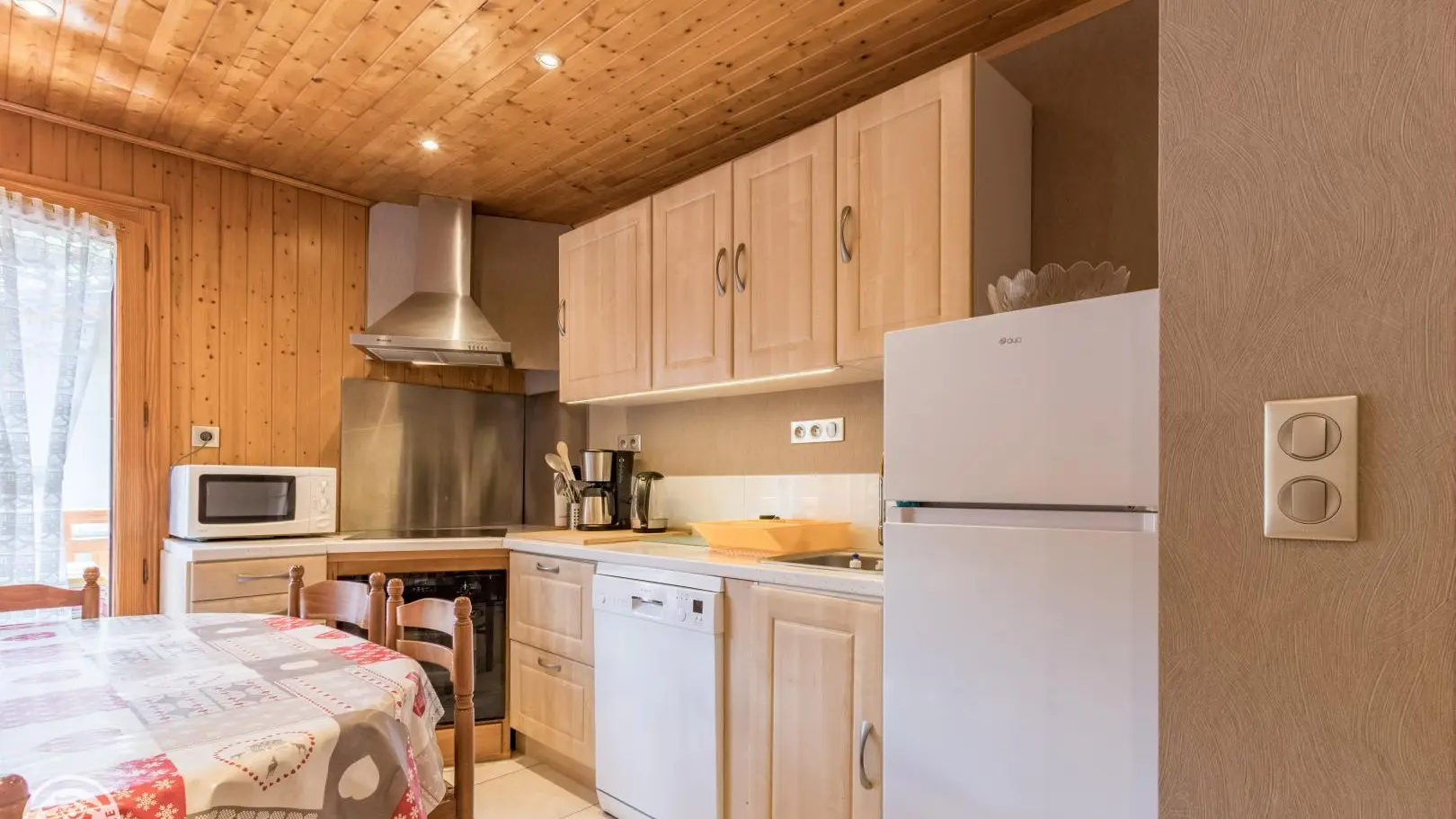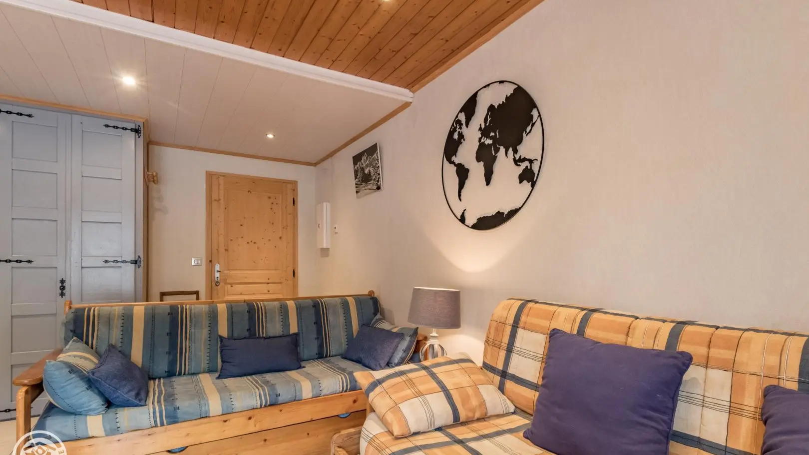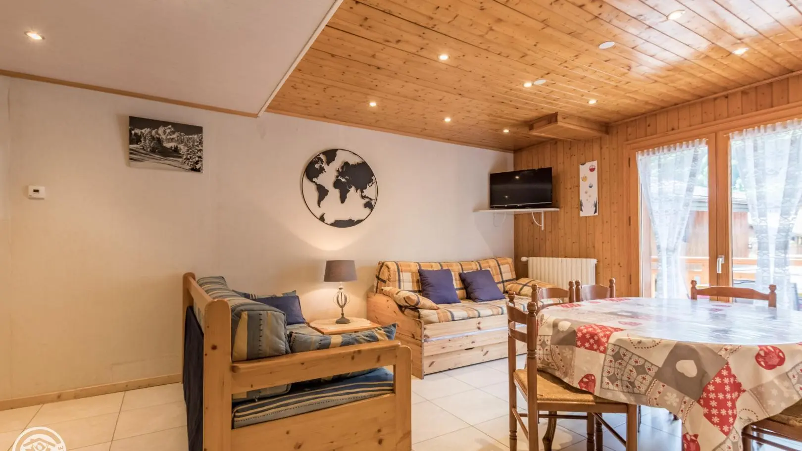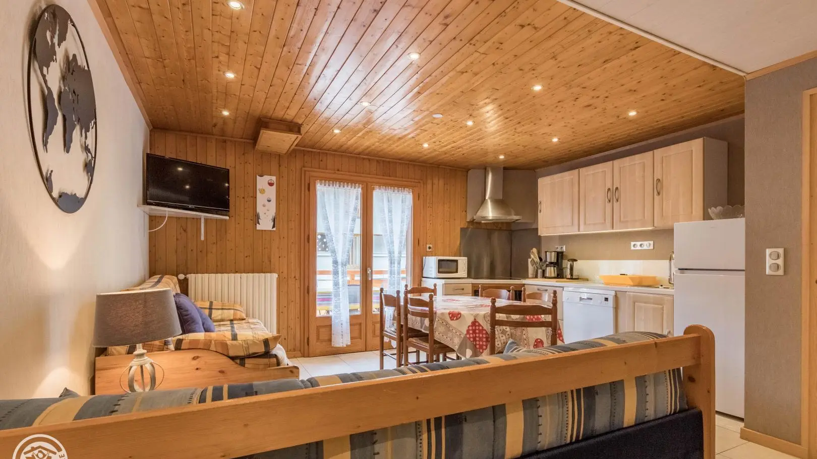 Near the center of Morzine, 50m from the Tourist Office, house with 2 cottages and housing owners. Gîte of 39 m² on the 1st floor. Kitchenette in living room (sofa bed 2 x90), 1 bedroom (1 bed 140). Washing machine at the owner's. Shower room, separate wc. Central heating, small balcony, ski storage, washing machine at the owners, small common fenced. Garage. Possibility of renting sheets. Ski resort: Morzine track and bottom at 0,5 km. Free shuttle bus at 50 m. Gondola for Avoriaz at 150m. Gondola for the Pleney at 250m. Stay 3 weeks - 10%.
