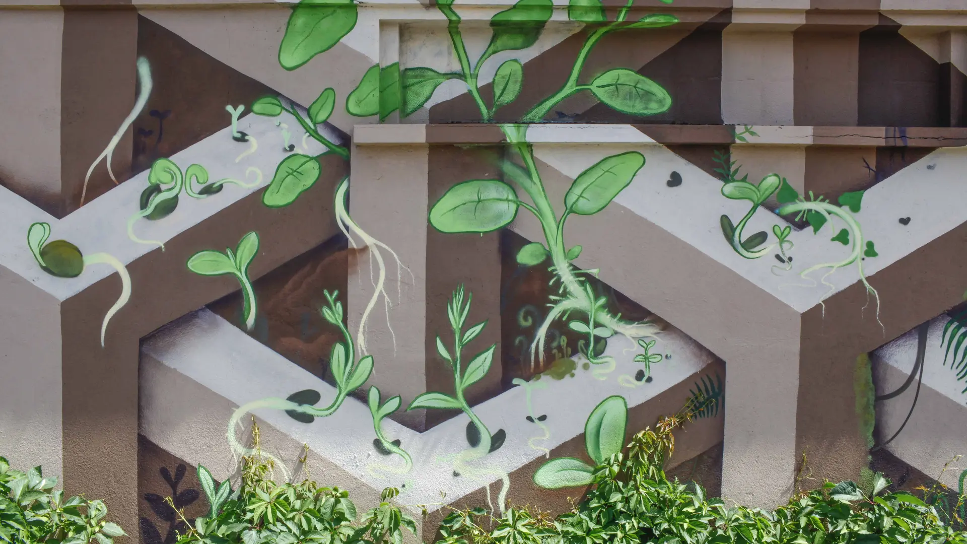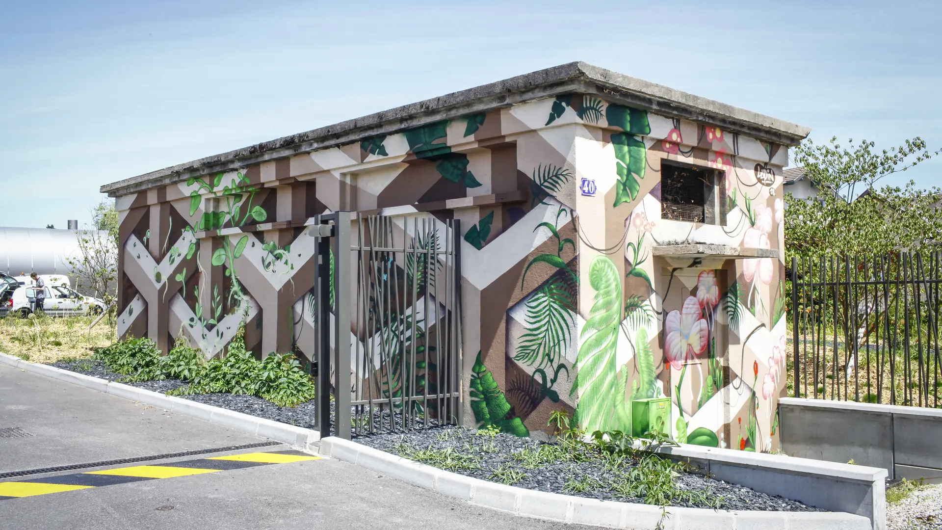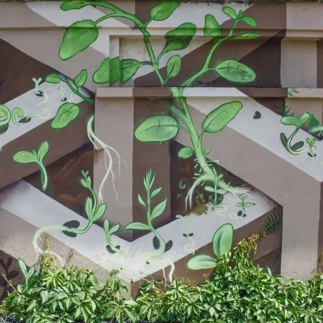 Located in the horticultural center of the city, Lapin’s mural represents the stages of germination of a plant. “Lapin” meaning rabbit, will you find the animal hidden in the mural?