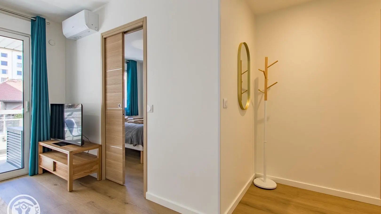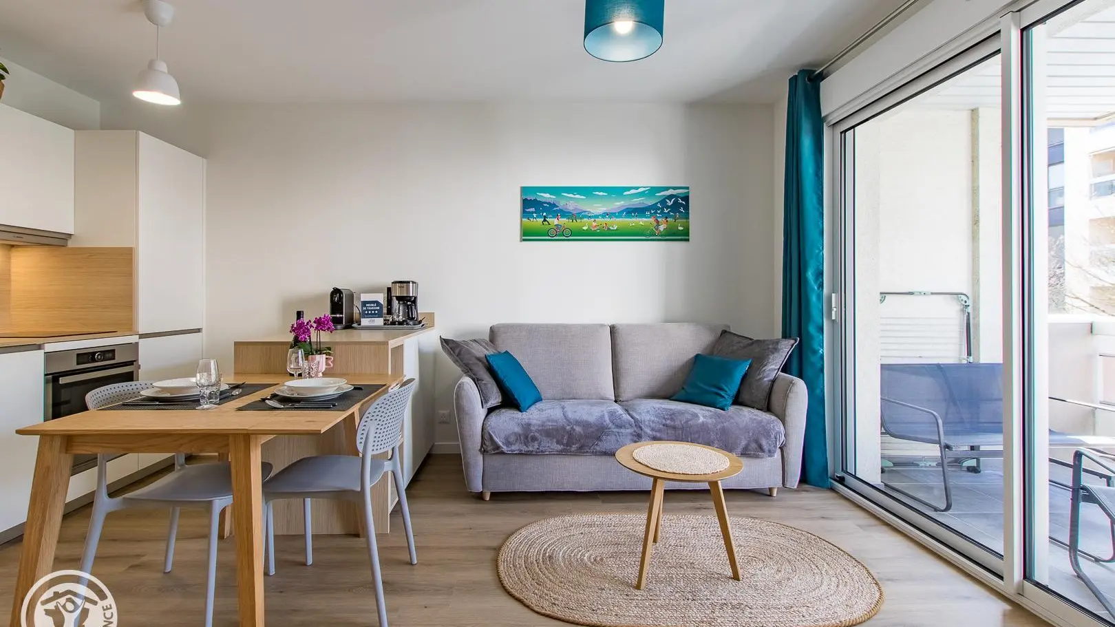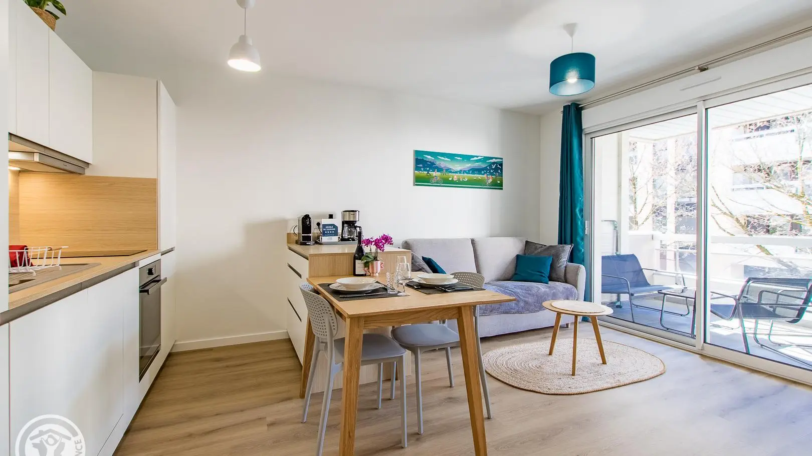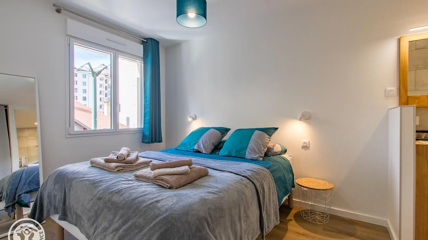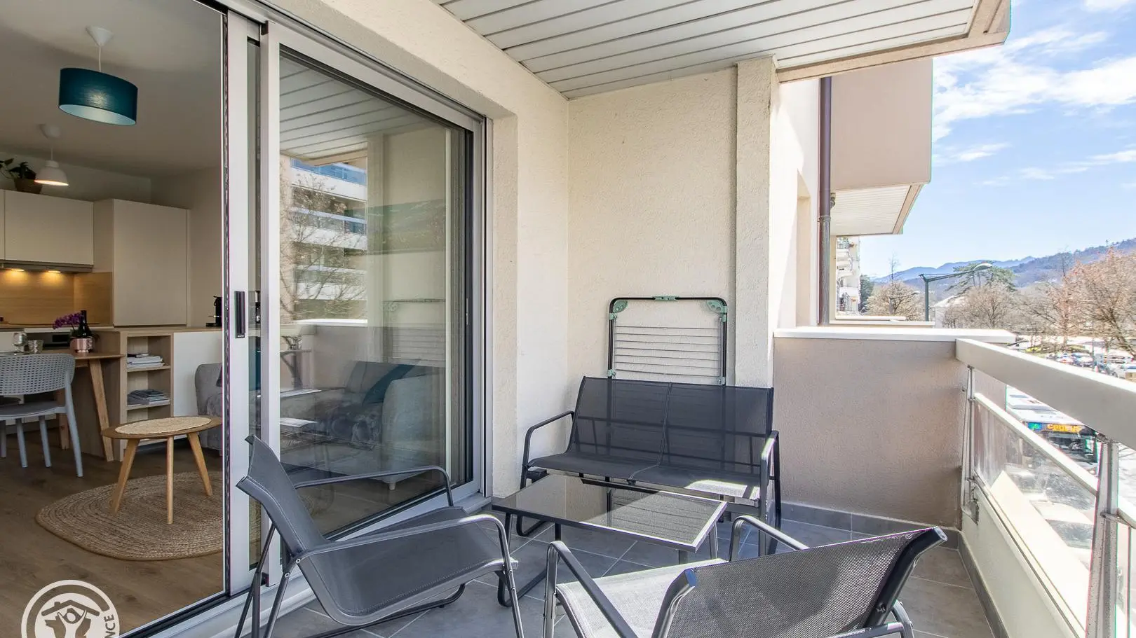 One private parking space in the secure underground garage of the building (maximum height: 1.95m). Paid public parking is available at the foot of the building. Many of Annecy's attractions are within walking or cycling distance: this apartment is located in the heart of Annecy's Golden Triangle, just 400m from the lake, the Paquier (lakeside promenades, boat rentals), and the cycle path. Annecy's city center, with its pedestrian streets, is 300m away, offering numerous shops, restaurants, and a cinema. Galeries Lafayette department store is 250m away. A market is held every Saturday, 100m away. Beaches for swimming (Impérial or Marquisats) are 1.5km away.