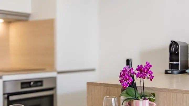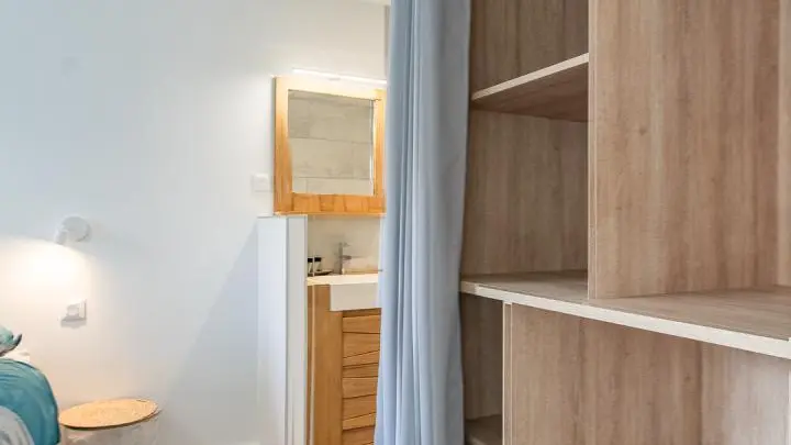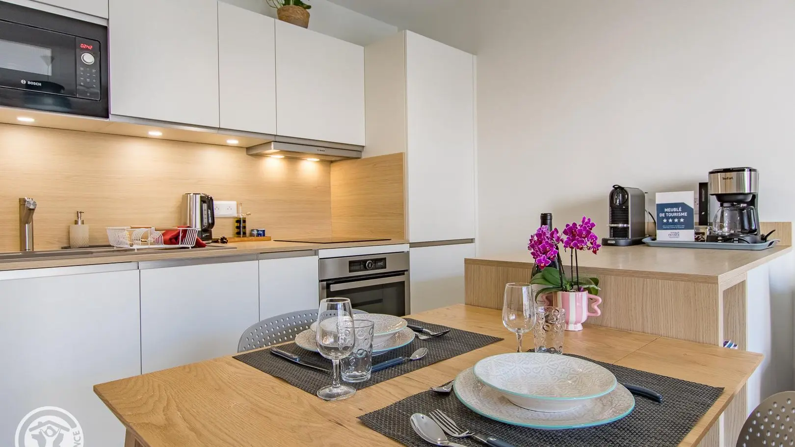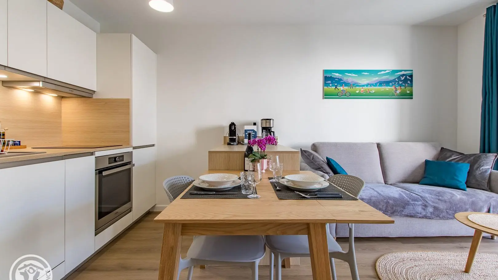 Entrance hall, fully equipped kitchen (breakfast bar with stools, dishwasher, oven, wine cooler, microwave, induction cooktop, etc.) opening onto the living room with a sofa, television, Wi-Fi internet access, and reversible air conditioning.