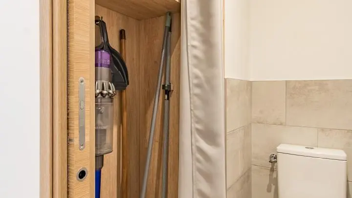 Interior sleeping area (only a skylight overlooking the kitchen) with a double bed (140x190cm), bathroom with shower, sink, towel warmer, and hairdryer. Laundry area with washing machine and dryer, and a toilet.